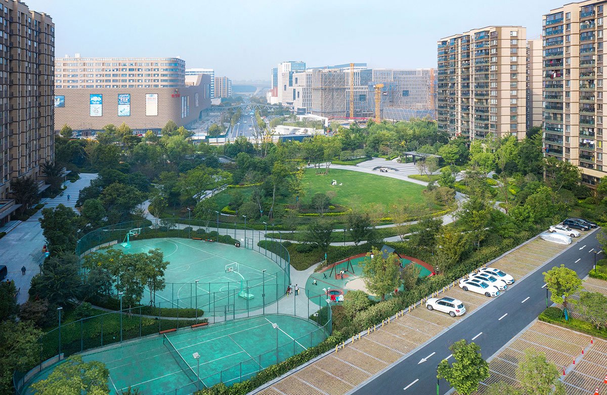 Walking distance from Hangzhou’s East High-Speed Train Station, Pengbu Central Commons is located atop a subway easement, requiring a large area of the development to be dedicated to green open space.