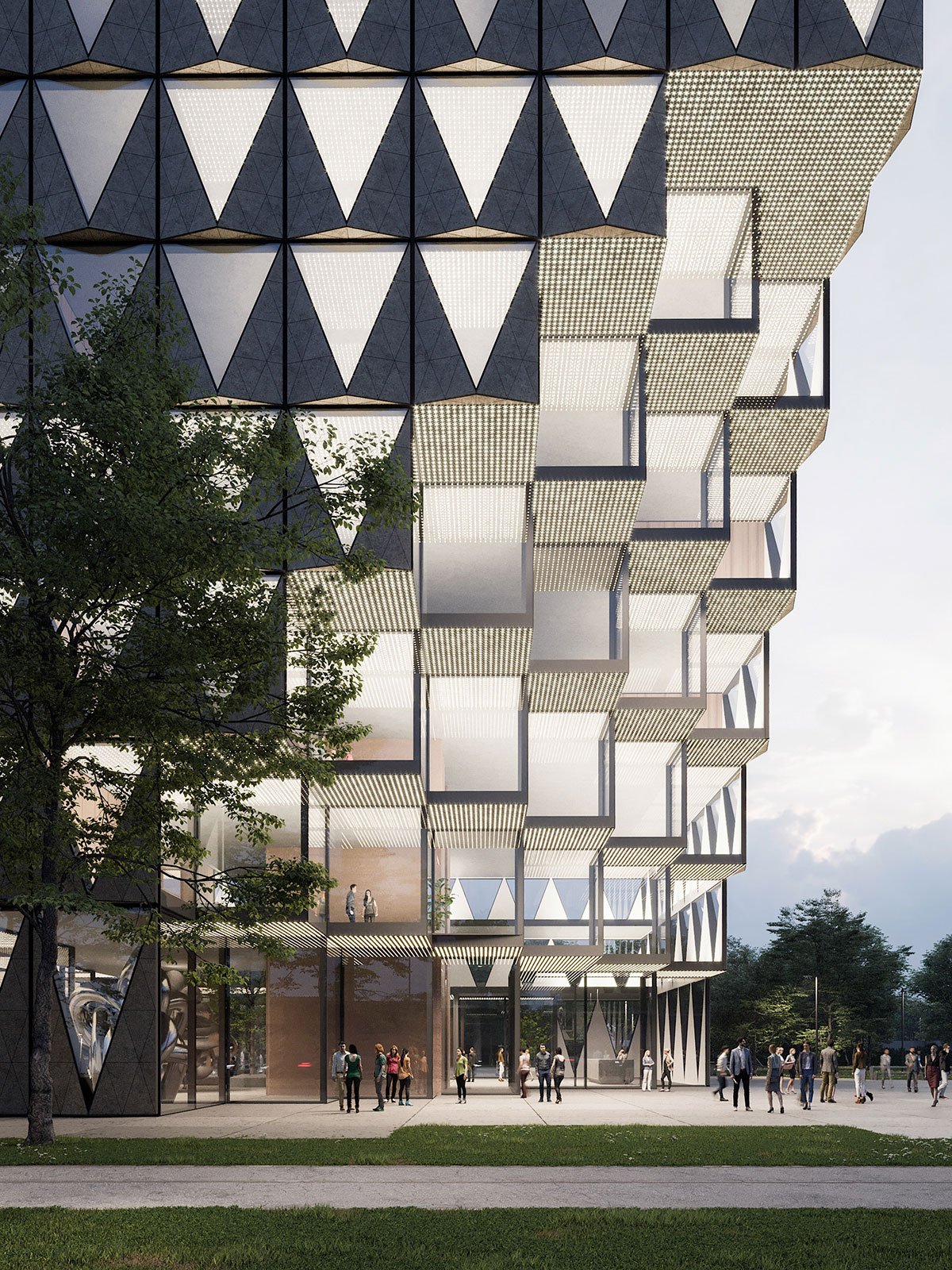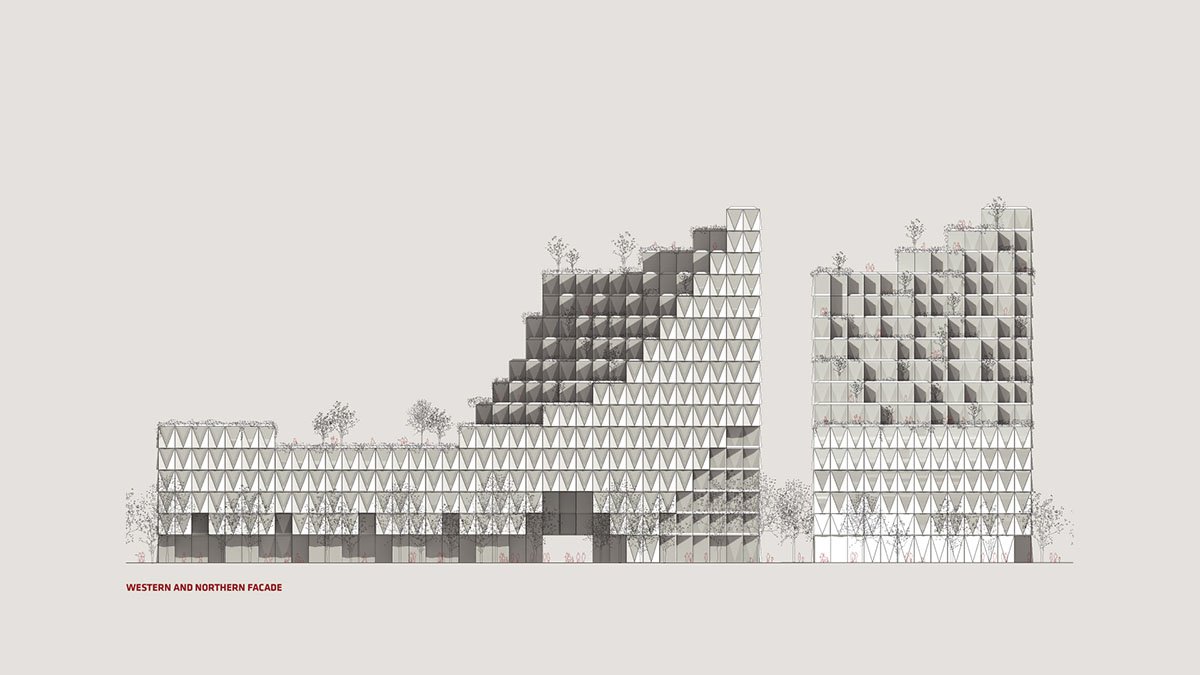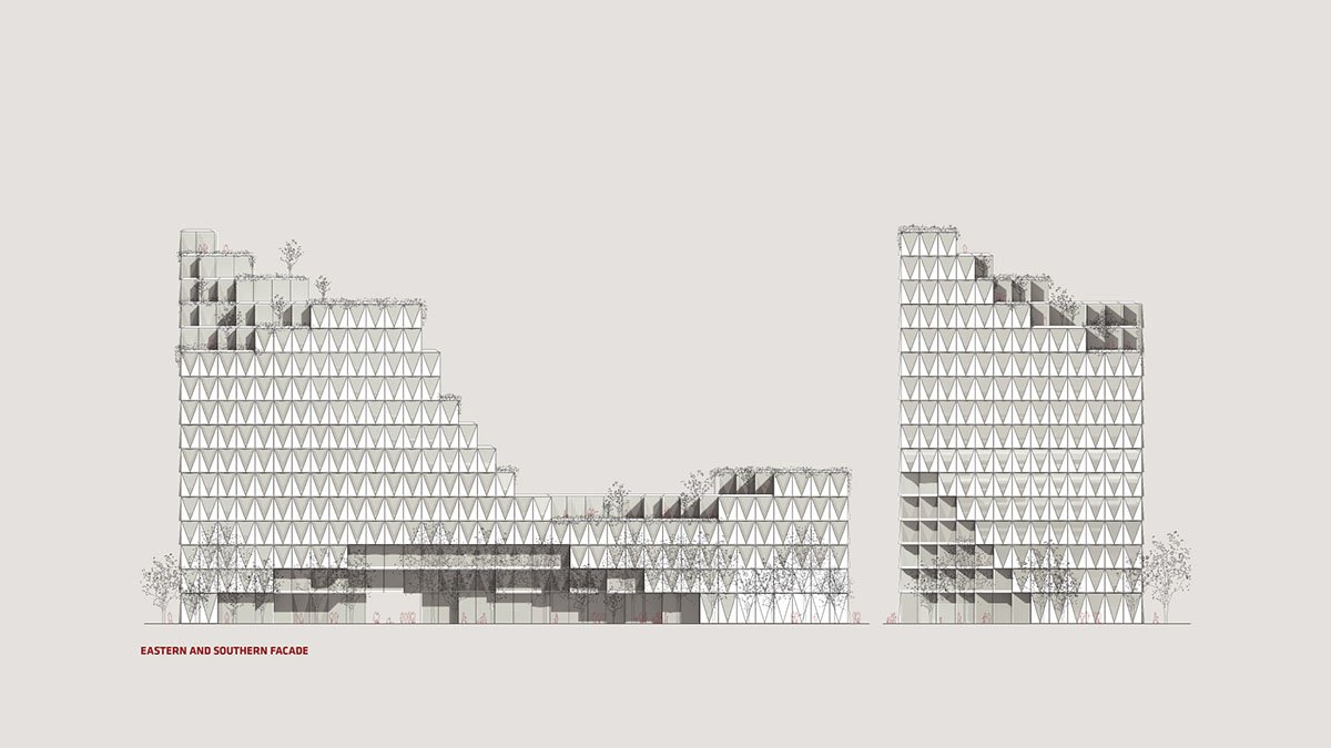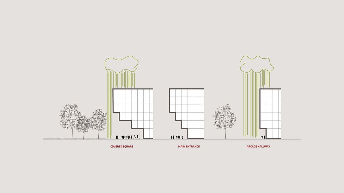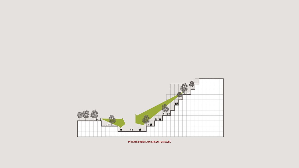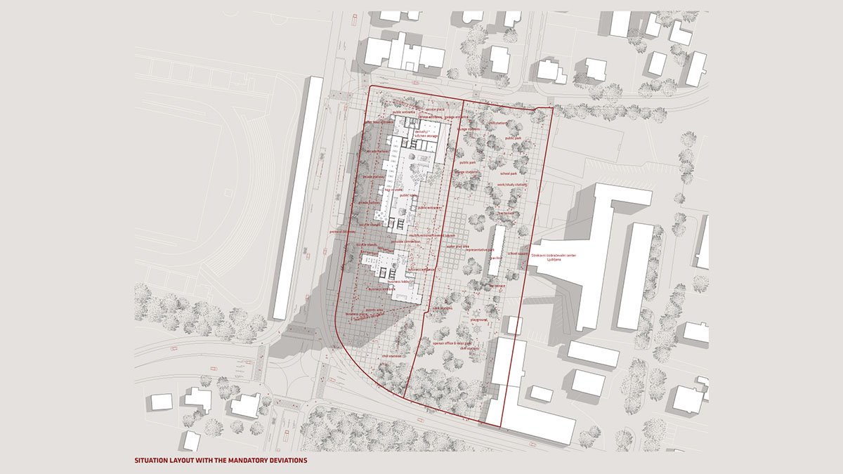 The cityscape composing tower at the crossroads and the functionally appropriate horizontal lamellas are formally transformed into a uniform volume with a slender and elegant emphasis in the southern corner and a continuous, predominantly green, amphitheatric roof opening towards the park. Cut-outs in the volume are forming covered spaces (arcade corridors) towards the streets, as a counterpart to the arcades on the historically important stadium designed by Plečnik and at the same time covering the entrances to the building. Behind the building, there is a park to which the building faces with its large covered square – a loggia. Occasionally this square is converted into a large open-air event, where the building serves as a shelter from road traffic noise. The design of the outer paved areas is summarized by the design of the building and its modularity. Part of the parking area is designed as a ground fountain that can be switched off during large events, thus increasing the usable event area.