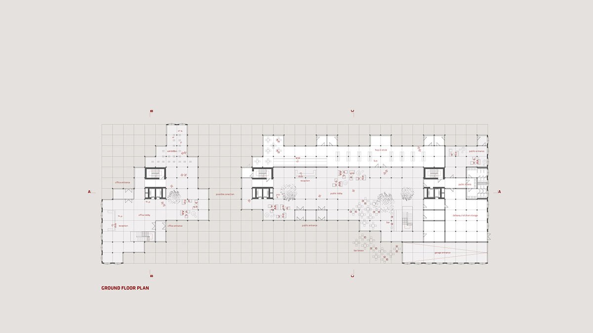 The programmatic arrangement in the building is usually completely flexible, but of course, some rules apply. The business program is located mostly in the southern, higher part of the building, but spreads to the northern part of the building on the lower floors. Here, most of the space is used as a public program of public utility work. The southern part of the parterre is mainly intended for business visitors. The separation of the business and public entrance area enables smooth operation, for example during events in public spaces. It is possible to connect these spaces if such a connection should prove to be a more convenient solution for the user. The two typologically different programs are connected on several levels, which allows an interactive and random connection of different contents.