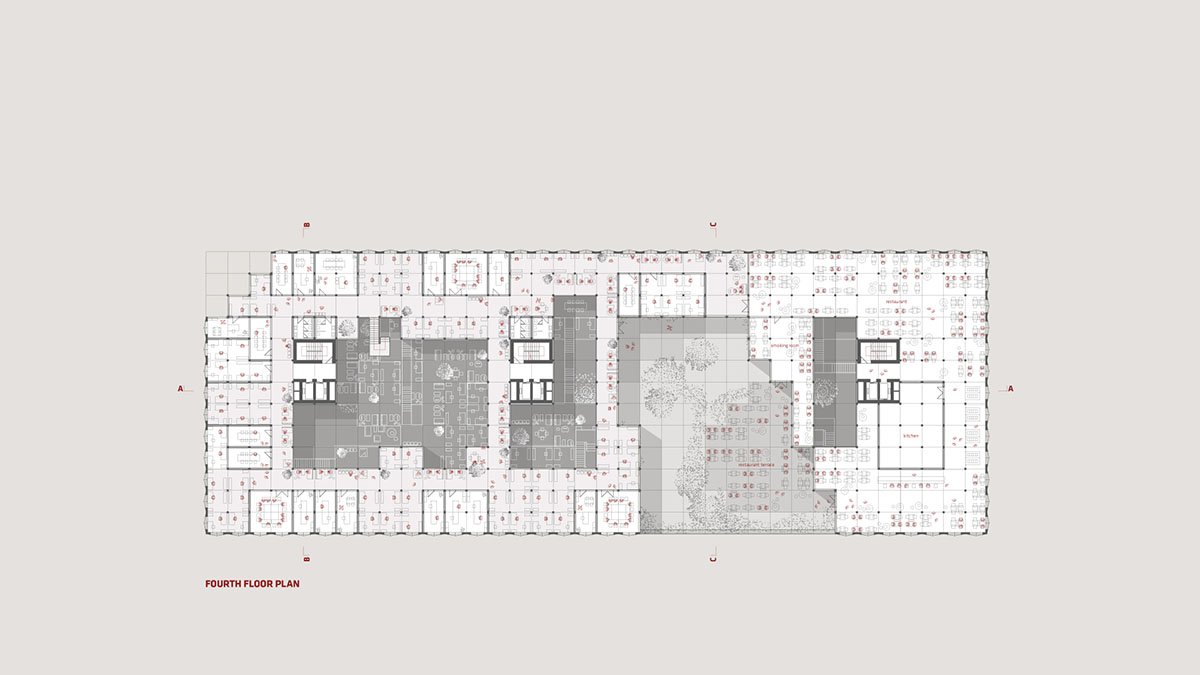 The communication paths usually lead to areas around the inner atriums and allow for good visual perception of the space and thus easy orientation. These paths are lined with open workspaces, which lead to closed workspaces along the façade. Vertical connections with conventional elevator shafts and (evacuation) staircases allow “randomly” arranged open staircases that usually connect adjacent floors. Like the other communication areas, they allow fast and unusual connections between adjacent programs and thus become spaces for spontaneous encounters and interactions.