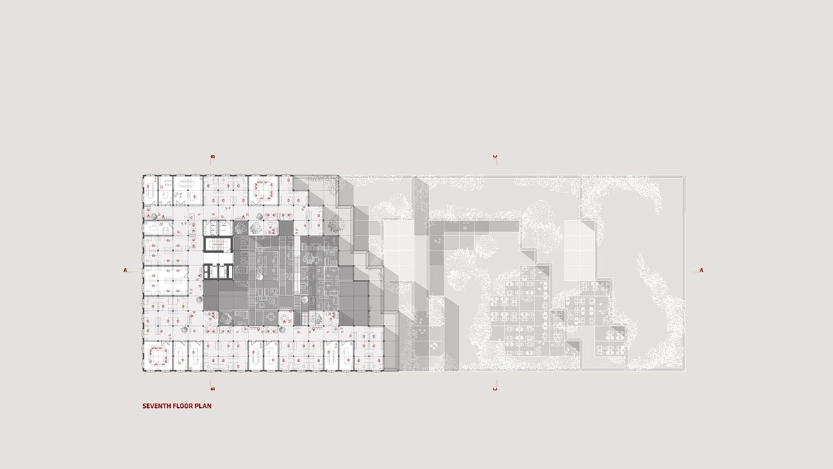 The generous volume of the building allows the realization of large multi-story interior spaces. They are a hybrid between exterior and interior space, in which ideal climatic conditions can be maintained. Between these spaces and the exterior façade, workspaces are organized, comprising closed areas that mostly face the building’s exterior façade, while the open workspaces and, above all, the communications and common spaces are oriented towards the inner void. Thus, they are naturally lit, as the void is generously illuminated from the large north windows. The voids also allow visual and physical connections through many staircases that connect corresponding rooms in other parts of the building.