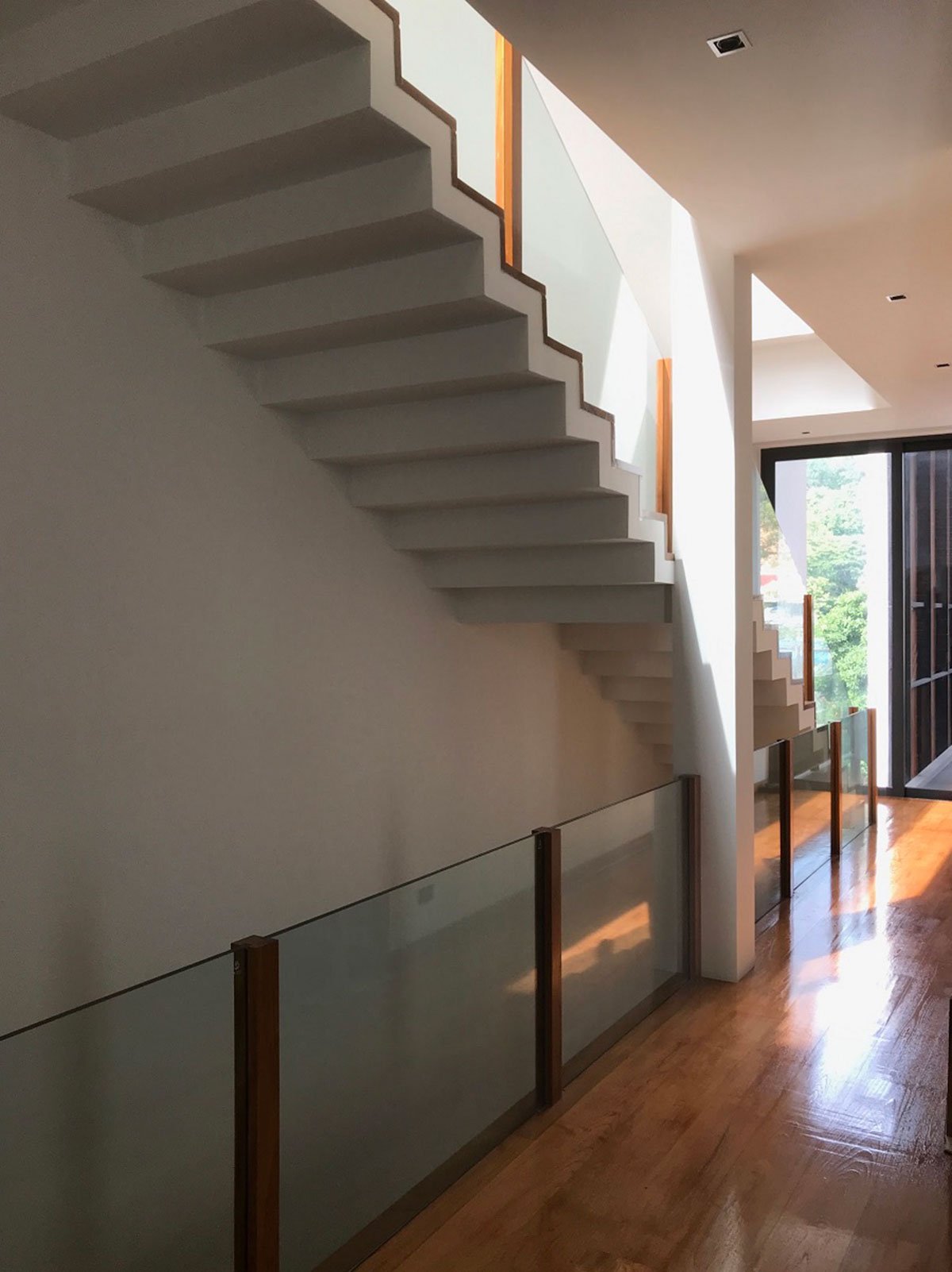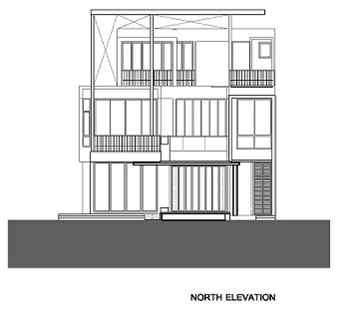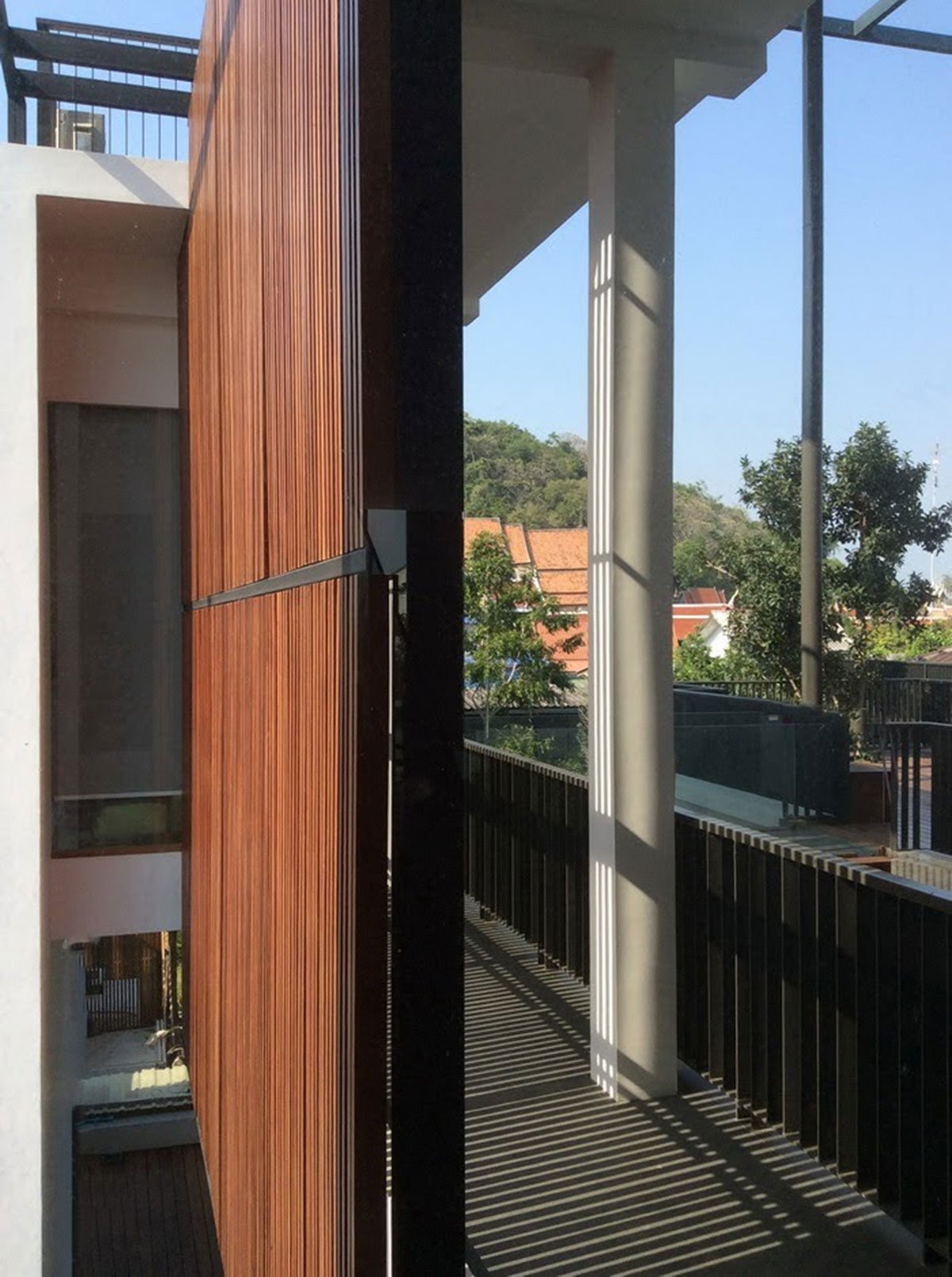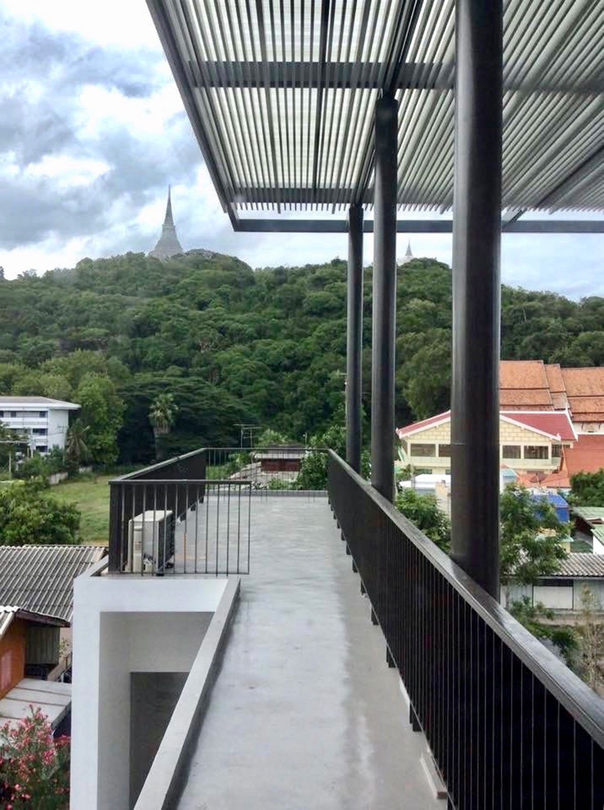 This plot of 247.5 square wah land has a long, thin shape with 15 meters wide and 66 meters long. It contains a three-storey residential home for five family members with 962 square meters utility space. There is no housemaid quarter. The house faces to south. The width of the street in front of the property is 12 meters. The family moved from a typical townhouse to the more open space with stunning back view towards the palace of Phra Nakhon Kiri on the top of Khao Wang.