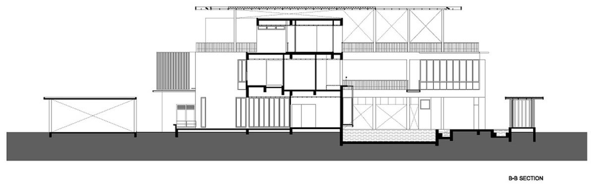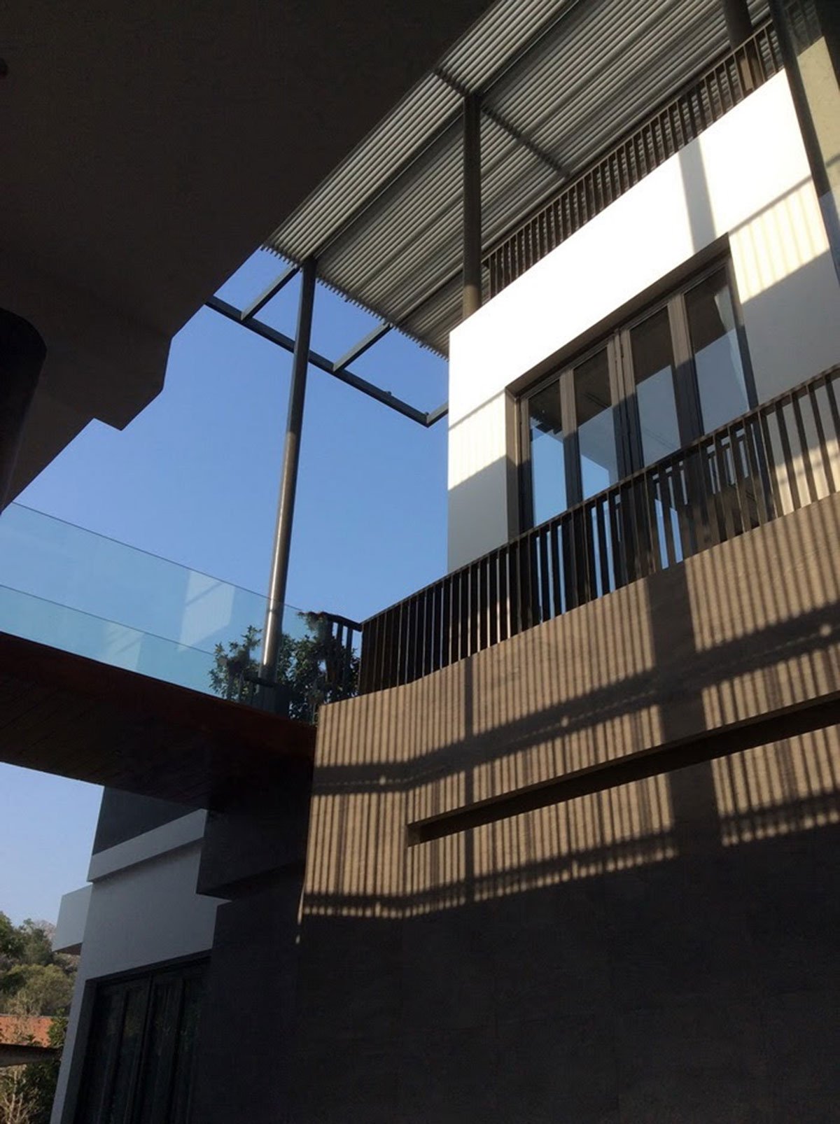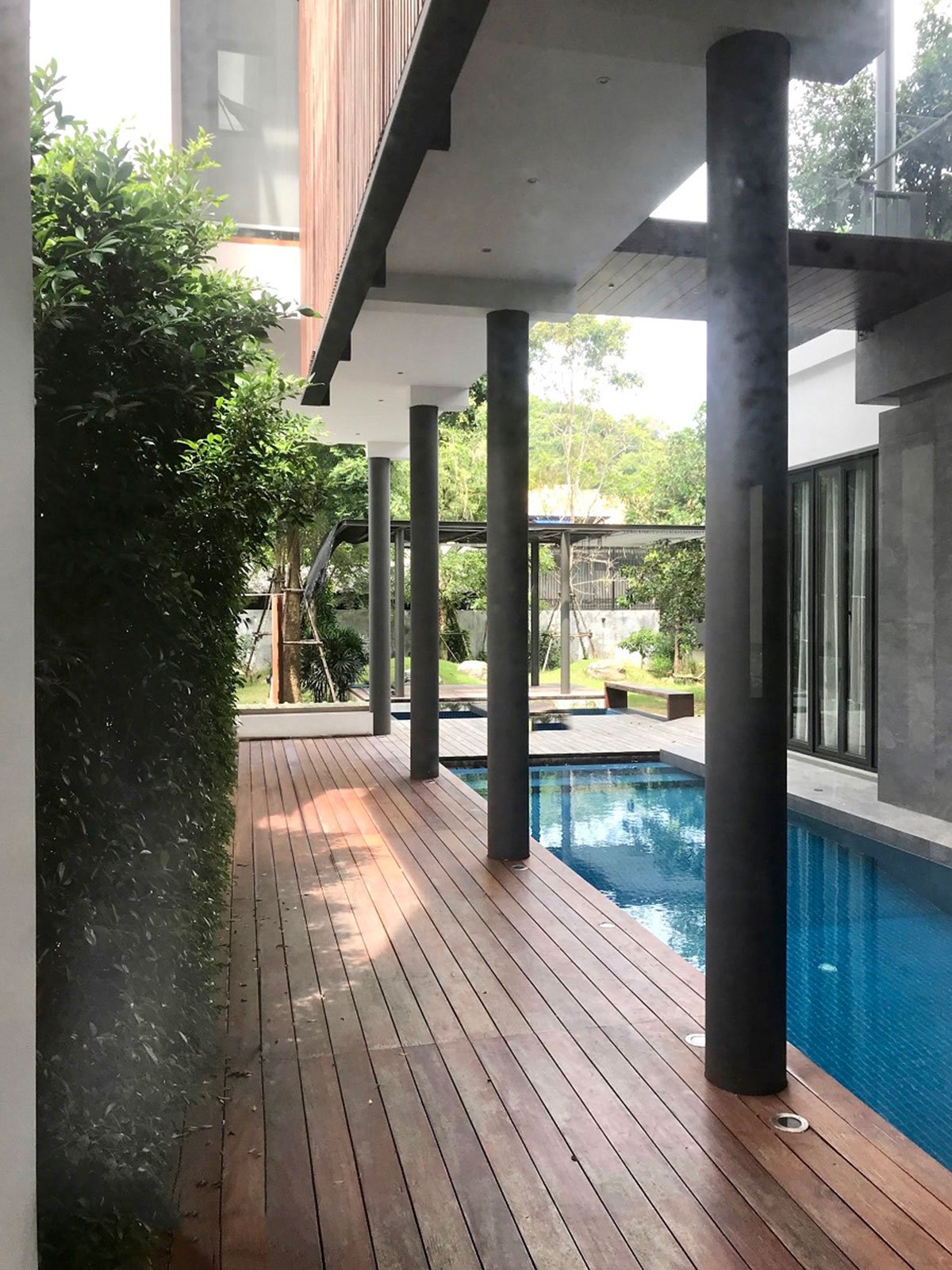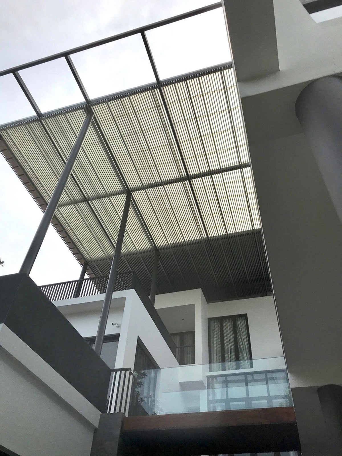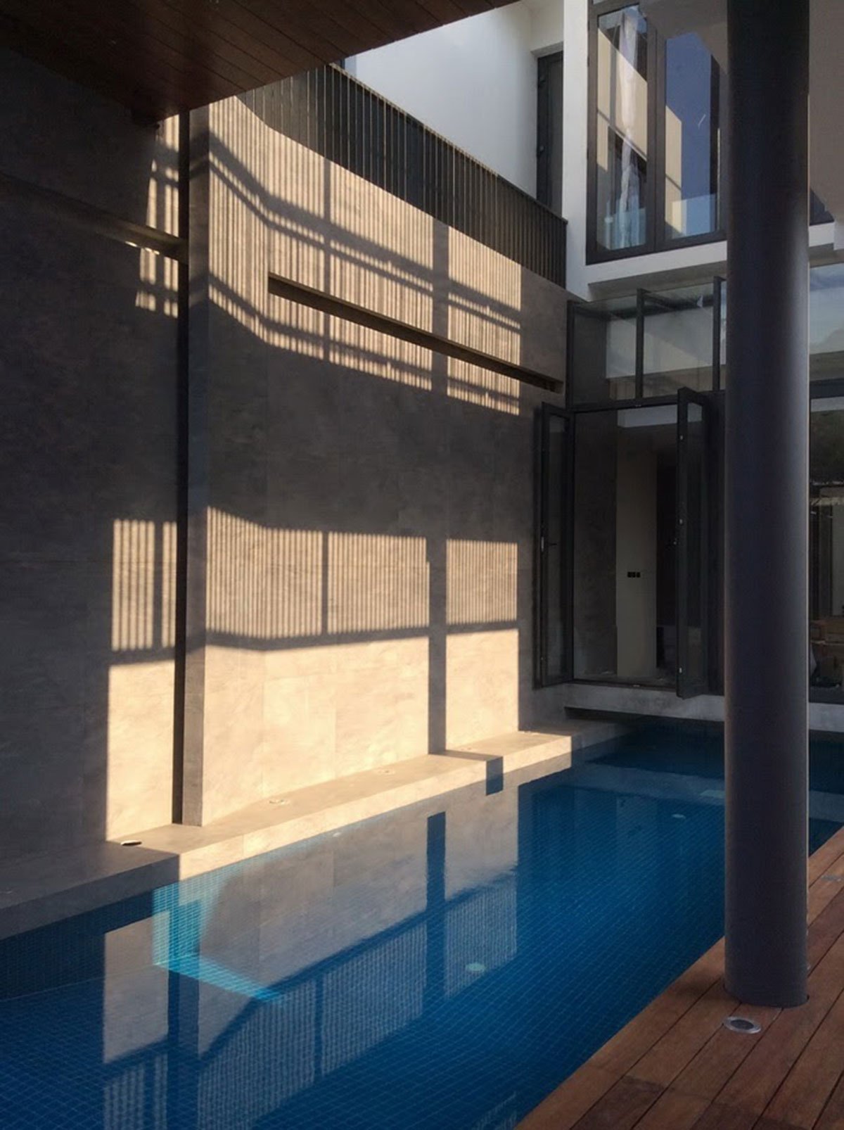 For the details of the utility space, the centre of the house is a swimming pool surrounded by various room types and connects to a backyard. While first floor consists of bedroom, pavilion and dining area, second floor is for larger bedroom and balcony with working office and third floor has guest bedroom. The volume of this entire house is created by a huge double roof supported by round steel bars, like an umbrella. The structure and the cover materials of the roof emphasise lightness, mixing between opaque roofing and translucent roofing. Aluminum slats create light and shadow effect on the ground, suggesting passage of time through shades of sunlight.