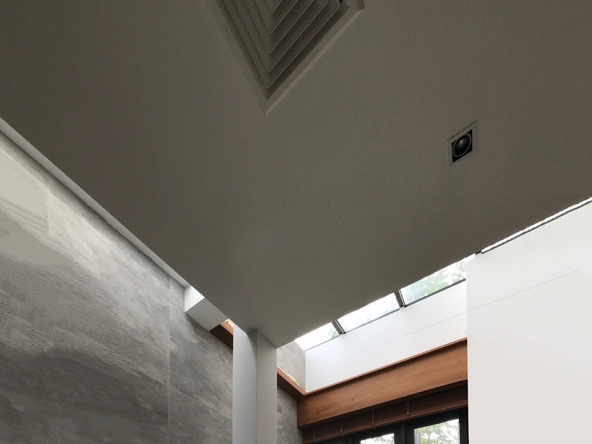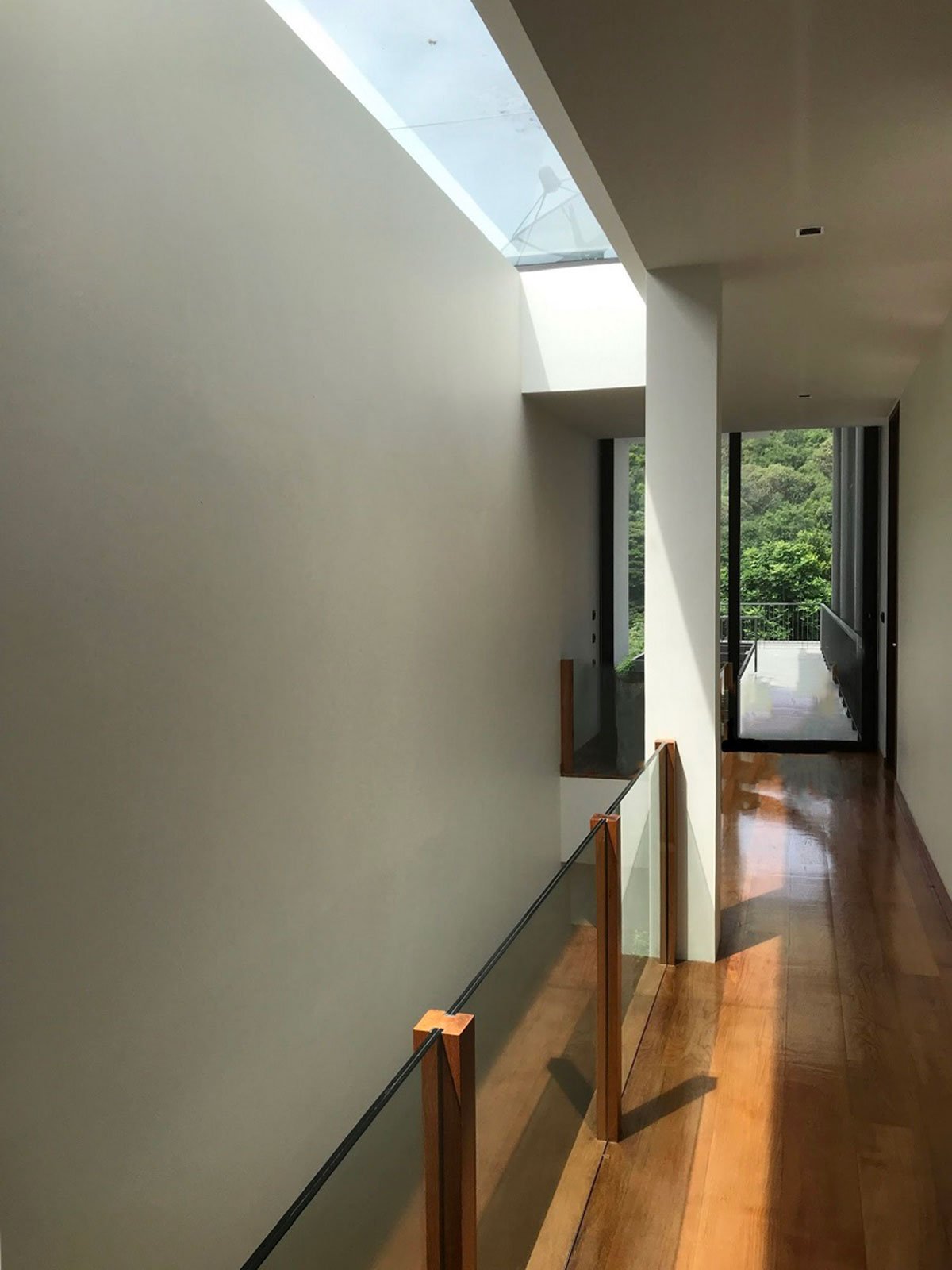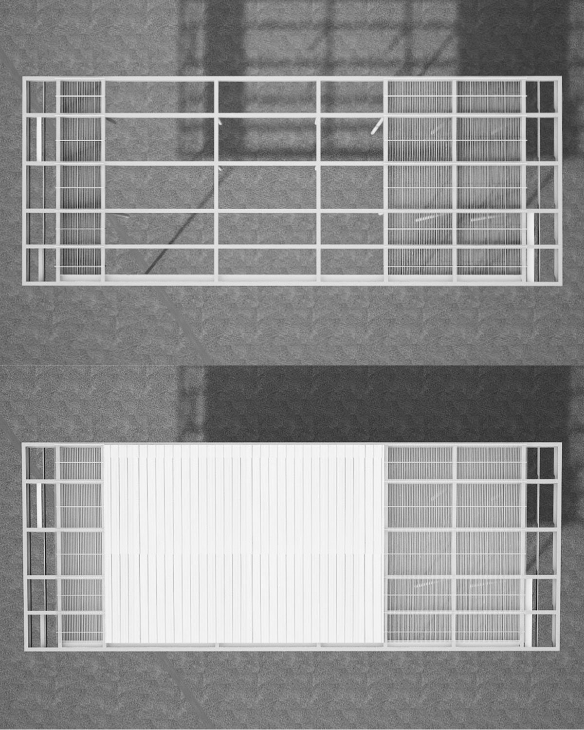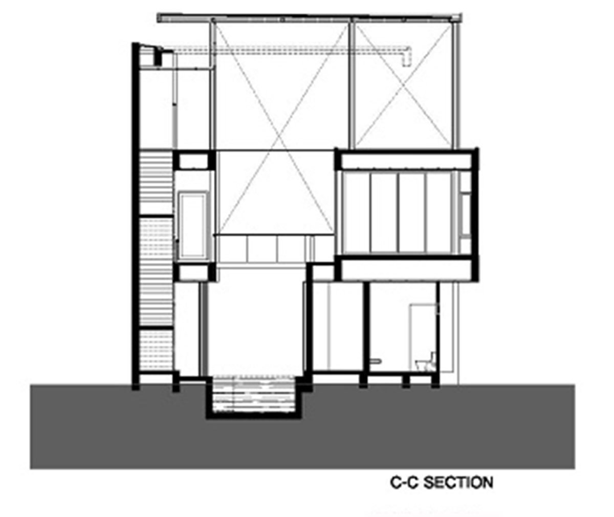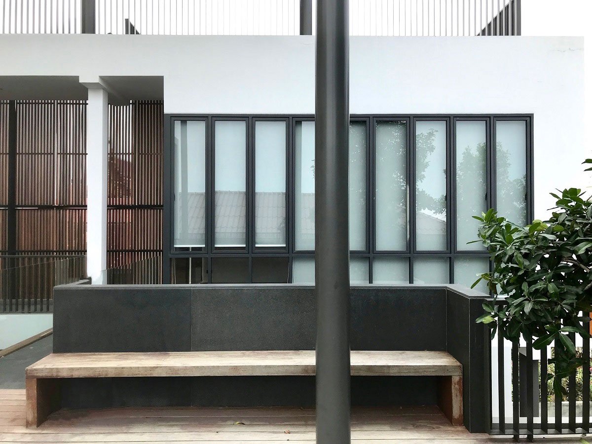 For the details of the utility space, the centre of the house is a swimming pool surrounded by various room types and connects to a backyard. While first floor consists of bedroom, pavilion and dining area, second floor is for larger bedroom and balcony with working office and third floor has guest bedroom. The volume of this entire house is created by a huge double roof supported by round steel bars, like an umbrella. The structure and the cover materials of the roof emphasise lightness, mixing between opaque roofing and translucent roofing. Aluminum slats create light and shadow effect on the ground, suggesting passage of time through shades of sunlight.