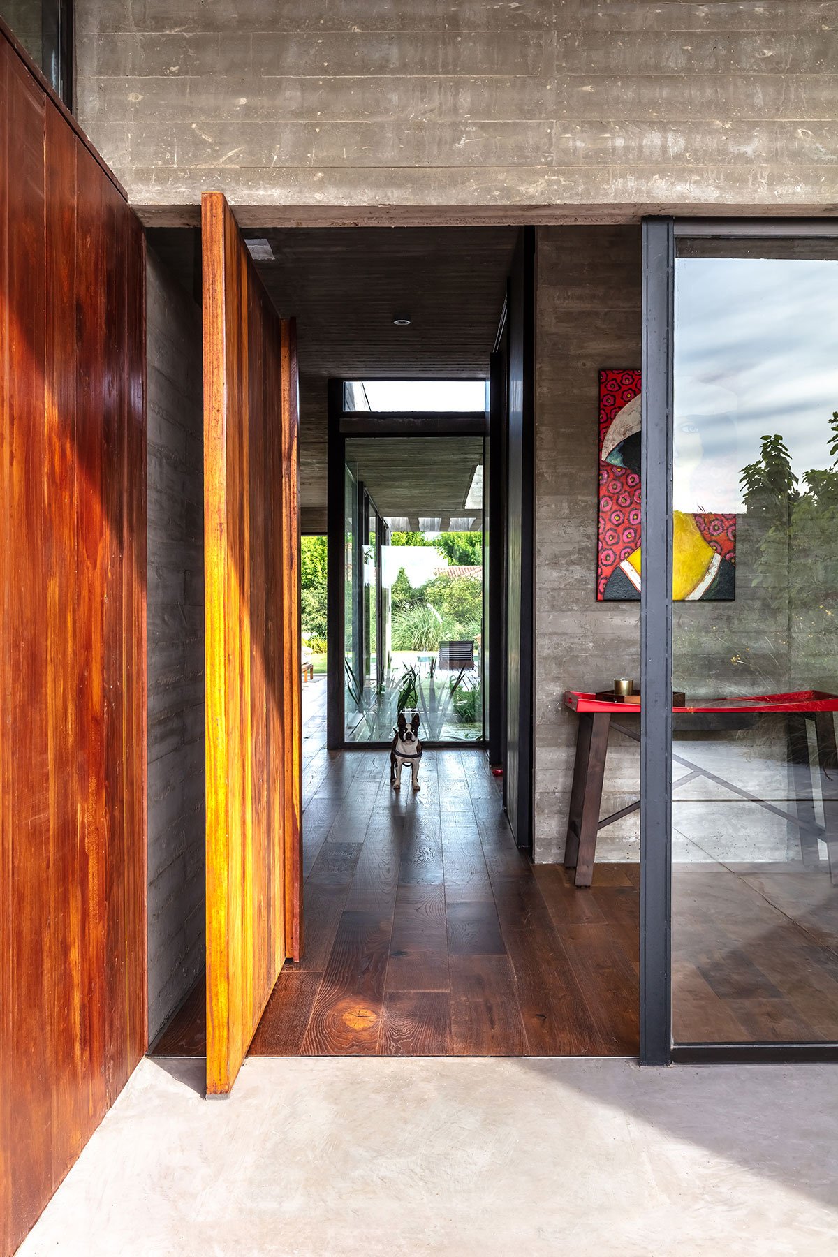 To the outside, the house is closed on three sides with screens made of quebracho wood boards in vertical positions that filter the views from both streets and from the neighbouring property, achieving privacy in all rooms and controlling the incidence of the sun in the different orientations. The façade towards the back of the house is completely open through large windows and a wide gallery with a pergola.