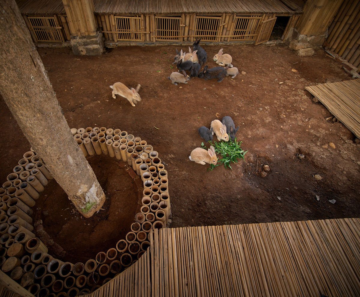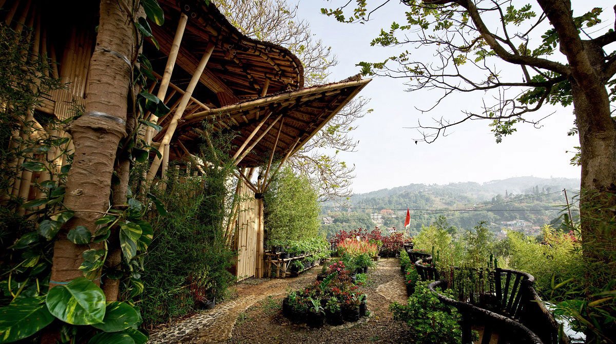 The second project, Kujang is a two-storey floating structure for an open-air hall for meetings and gatherings connecting with organic farms. It is constructed from the 4 – 5 m grids of bamboo structure and covered with Nipah leaf combined with a waterproofing membrane for the roof. Forming the Julang Ngapak as a traditional West Java vernacular building, the playful balustrade of bent bamboo is played as a more elaborated hyperboloid form, it is stronger, and more flexible and creates a silhouette of the natural movement of birds or movement of Kujang which is a traditional weapon in Sunda Tradition. Sumarah and Kujang architecture forms a pilotis structure sitting on an existing stone foundation made by adaptation of traditional and industrial approach.