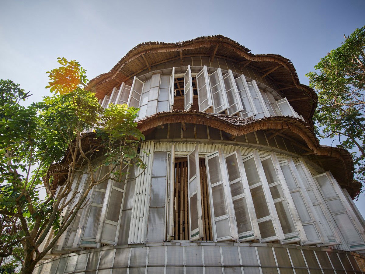 Sumarah is a three-storey house for 1 family consists of 2 kid bedrooms, 1 master bedroom, and shared bathrooms. The building envelope is constructed with recycled 300 x 600 mm plastic panels to cover and protect the inner bamboo structure forming a service corridor with double cross air ventilation and double wall insulations to the core living space of the building. The envelopes are openable, supported by a bamboo structure that can be locked with a traditional lock made of bamboo. The core living space is the bedrooms in the rectangular grid of 3 m. The architecture is designed as an exercise of the bricolage concept using 3 types of main material such as recycled plastic, a local type of sympodia bamboo, and stone for the foundation which supplied within a 5 km radius. The composition started as an exploration on how can bamboo craftsmanship integrated with modular rectangular space to create such integrated craft carving bamboo composition from the ceiling, floor, column, door handle, lock, and finishing details handcrafted in site creating art and craft composition in the whole integrated space.