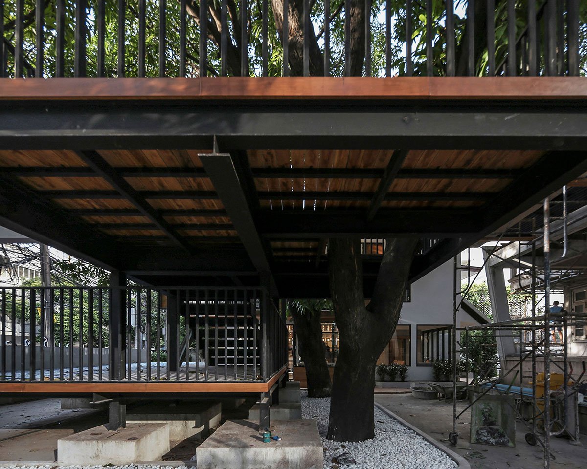 Apart from two clusters of the buildings diagonally from each other, the blank spaces between two existing building was designed into 1) a semi-outdoor area for a restaurant, and 2) a step-like dining under mango trees. Since this restaurant will be open daily from day till night, an outdoor area is greatly demanded from various customers especially during night time. The space between the restaurant and the café which is located at the inner part of the overall area, is created to be used as “A SEMI-OUTDOOR AREA”. It generates a transition route between the restaurant and the café building by a rectangular tunnel made of wooden trellis. The tunnel acts as a relaxing space underneath together with the roof top space above which is occupied by no one. There will not be any dining table at that area since it will be used as a viewing and shooting point.