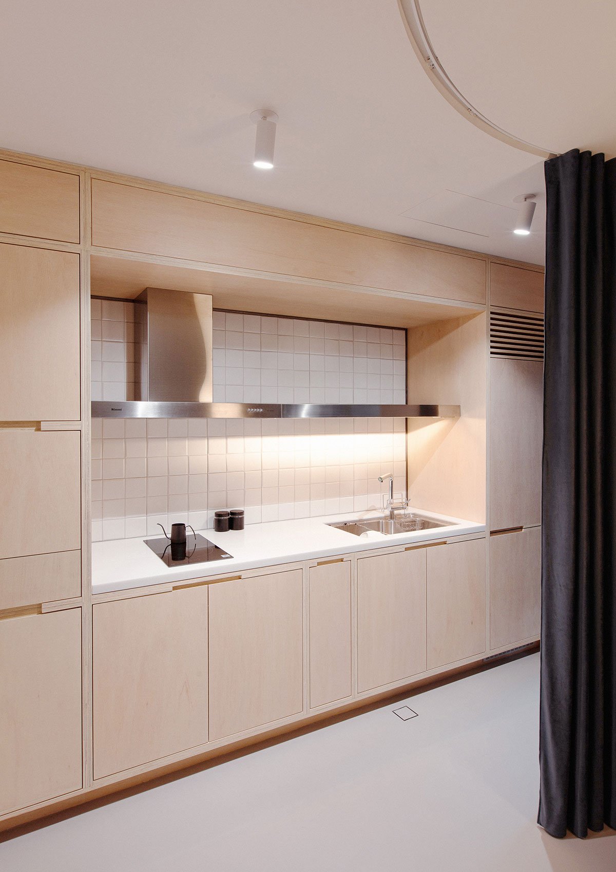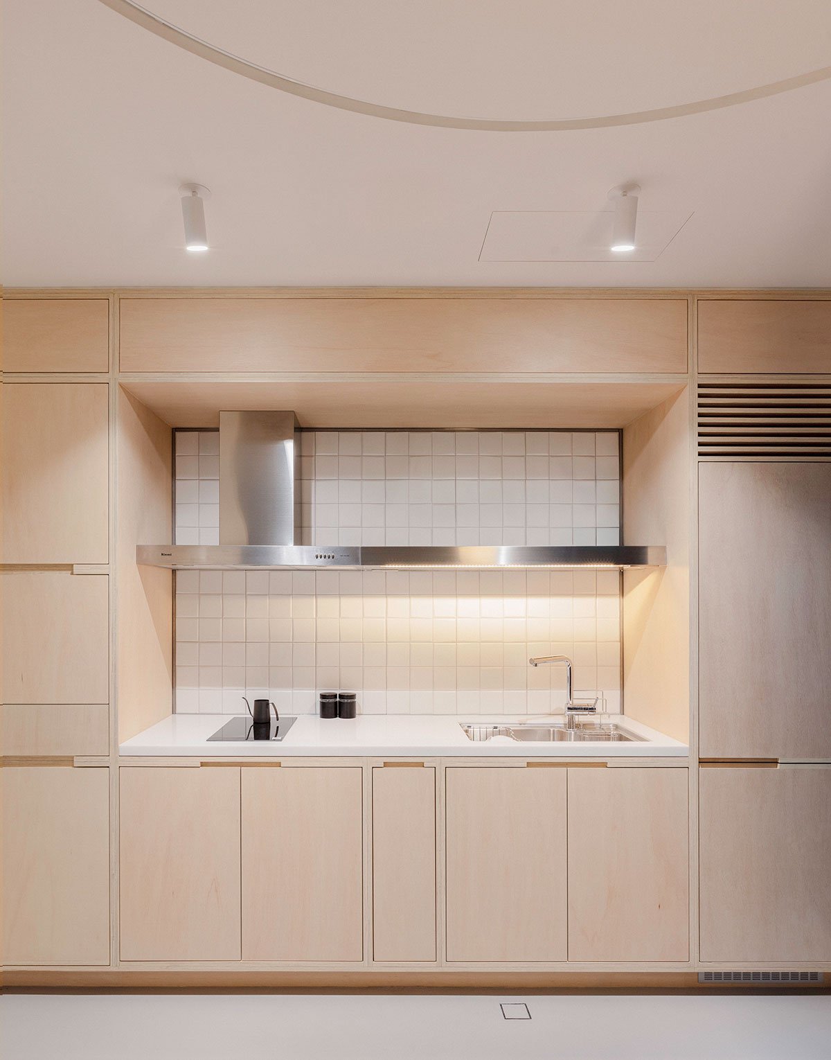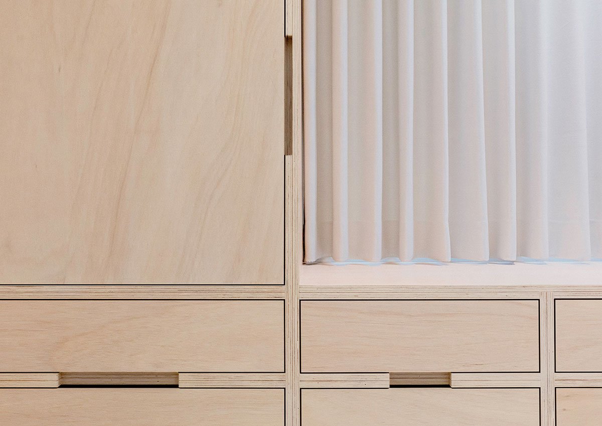 Custom designed millwork, framed by two layers of birch plywood, incorporated storage, furniture surfaces, work space and cooking without feeling plain or too simplistic. It pairs with an elegant concrete-like floor, referencing the clients’ NYC home. Passing through the plaster wall into the private zone, the material palette reduces ever so slightly to a zen-like white, wood, and grey.