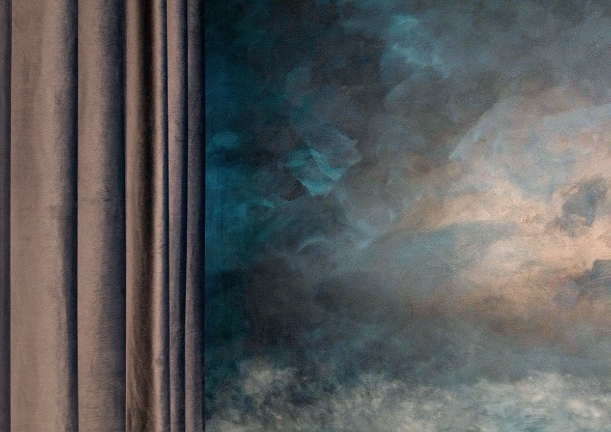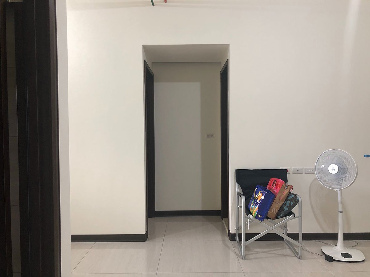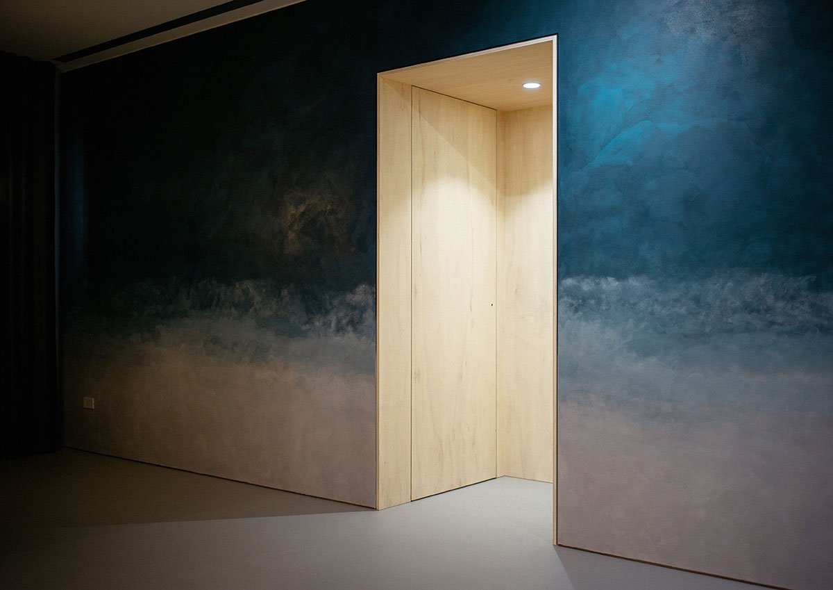 The apartment, when purchased, had a very enclosed kitchen, small dining area and bedroom that needed to also function as a work-from-home space when working from Taiwan. Reconfiguration was needed: The enclosed kitchen was replaced by a cooking-entertaining gallery that is both open and flexible; A single, floor to ceiling flexible curtain enables intimate dining without seeing the utility of the kitchen and blocks out the frenetic night lights and sounds of bustling Taipei; A custom decorative wall with Venetian plaster acts as the only permanent division between public and private zones within the apartment. A reductive palette of materials also enlarged the feel of the apartment.
