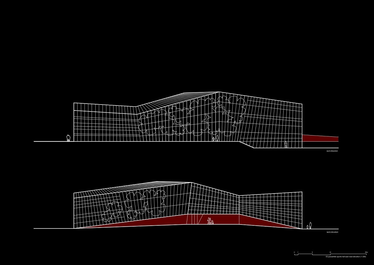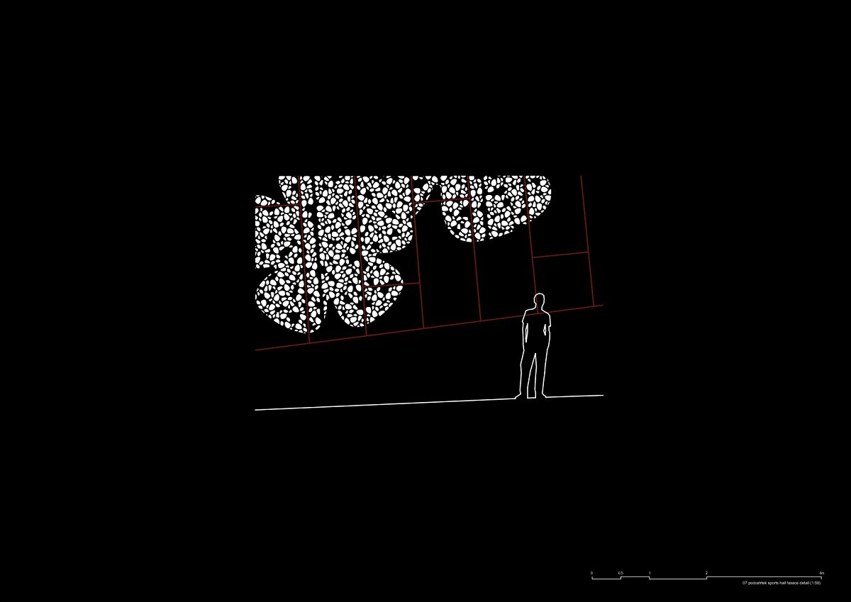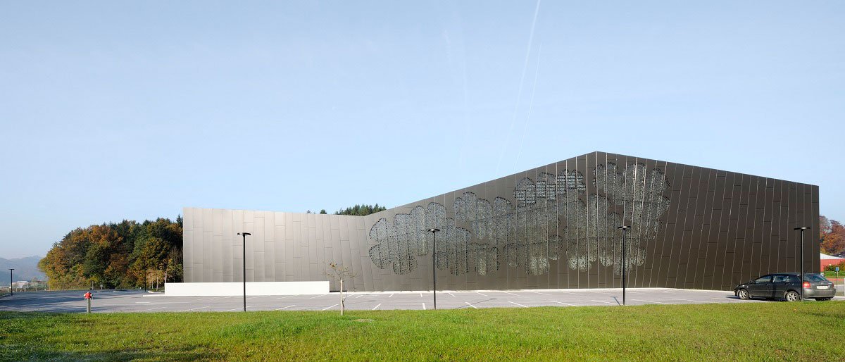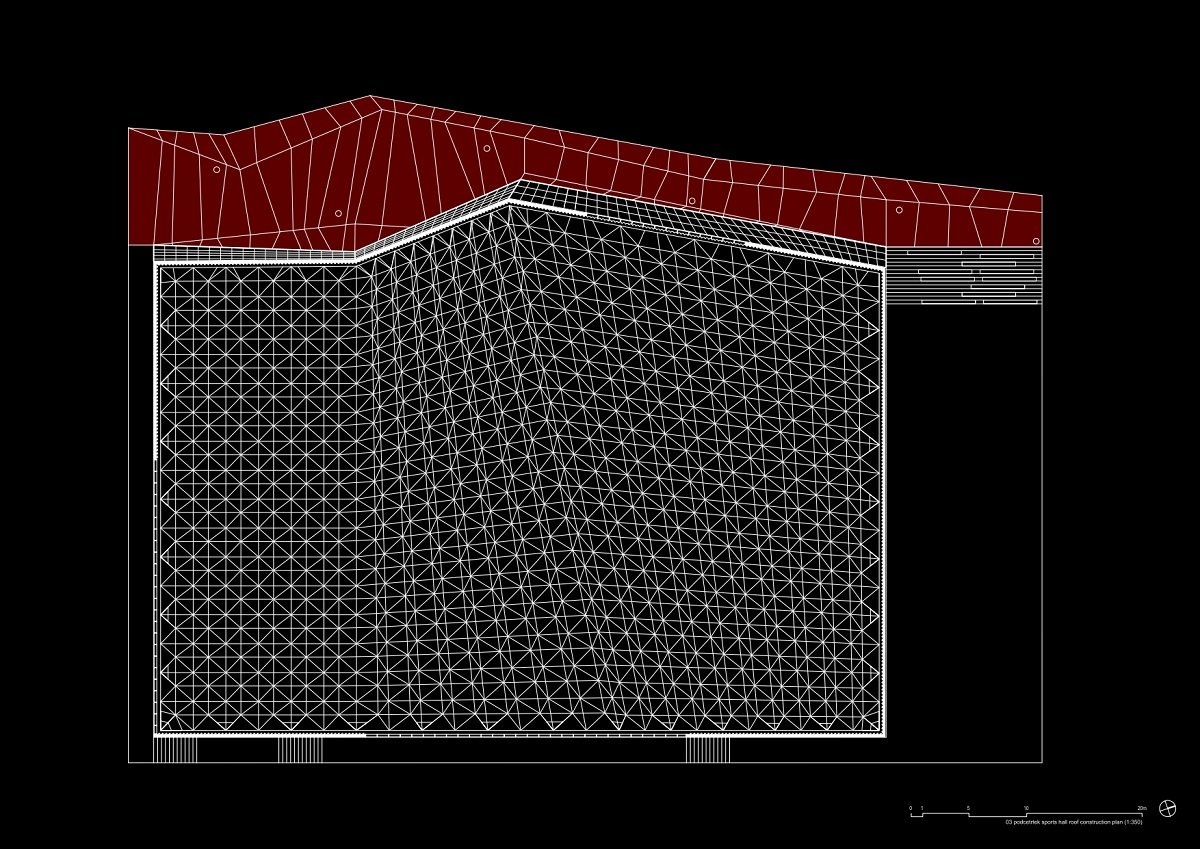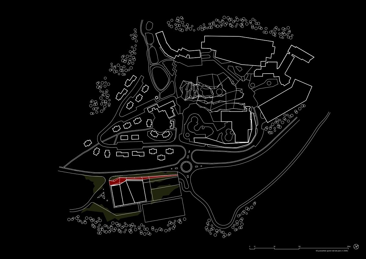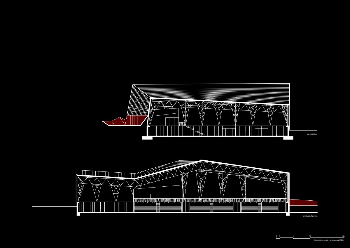 [Text as submitted by architect] The municipal sports hall is located next to the road leading into the small town of Podčetrtek with population around two thousand. To an extent, the appearance of the hall is a response to the role it has in the town, being the only large indoor venue. Though it is designed primarily as a sports hall, it also plays the role of the main municipal hall for cultural events with larger audiences. It is precisely its double role that serves as the basis for the detailed design of the building. The main design cue is a “red carpet” that leads the visitors to the events taking place in the building.