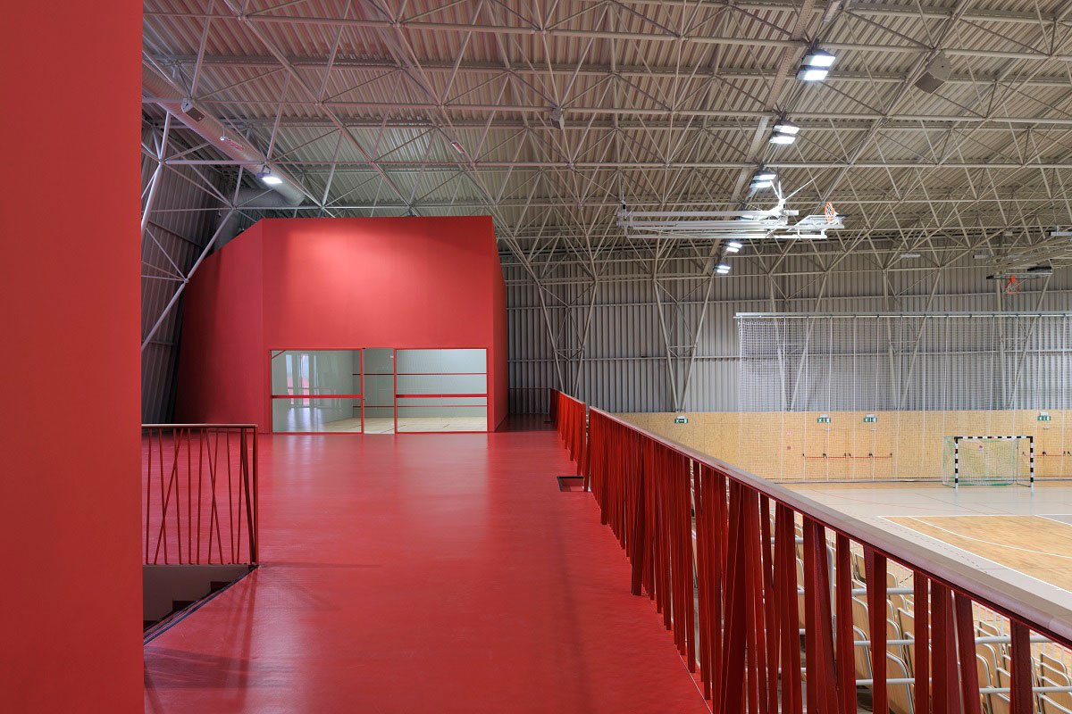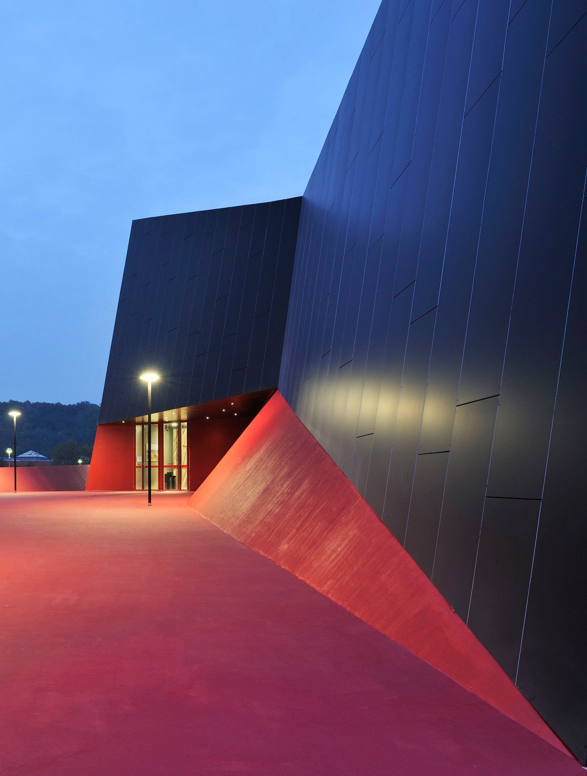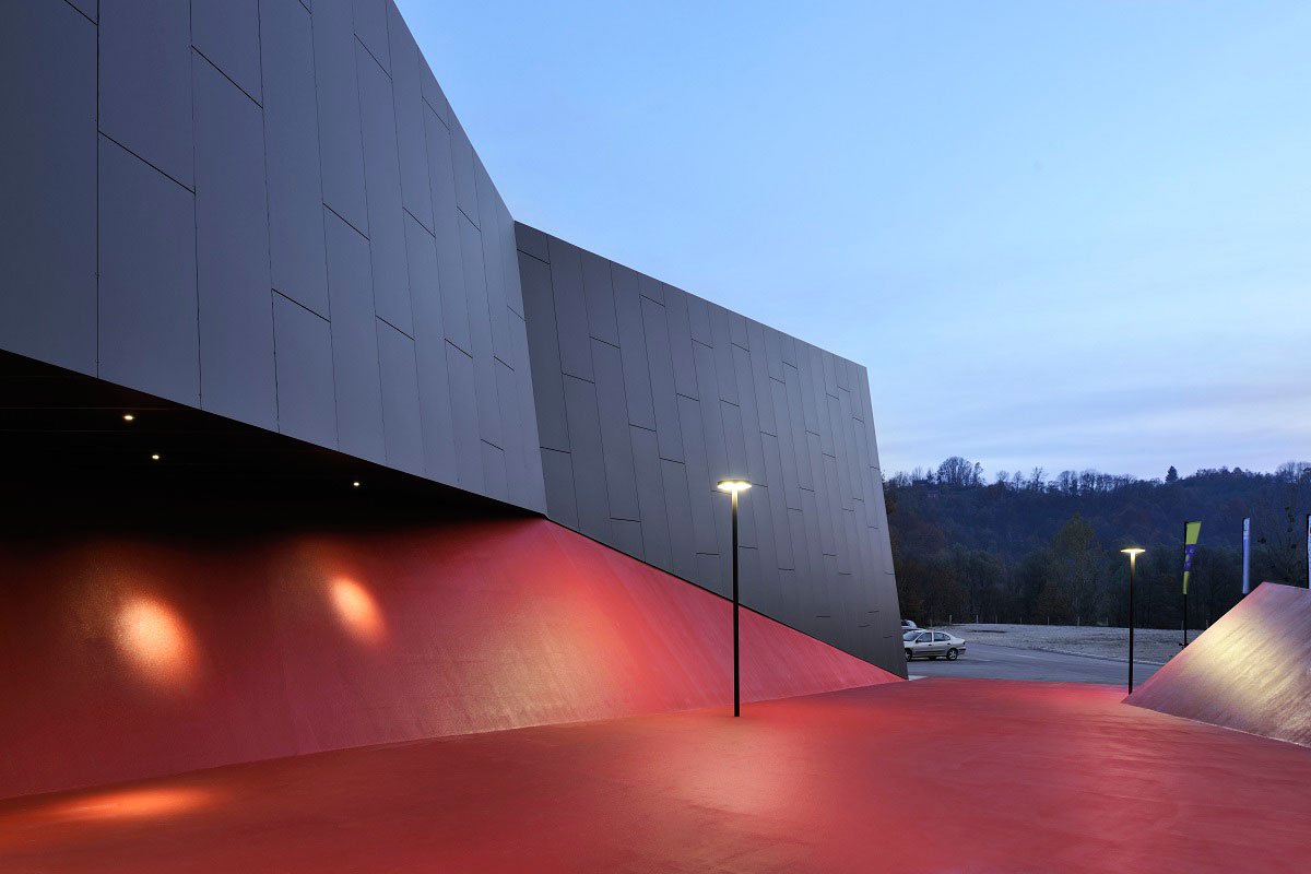 Excerpt: Podcetrtek Sports Hall, designed by ENOTA, appears as a response to its role in the town, being the only large indoor venue. Though it is designed primarily as a sports hall, it also plays the role of the main municipal hall for cultural events with larger audiences. The main design cue is a “red carpet” that leads the visitors to the events taking place in the building. The activity inside is directly mirrored on the facade and contributes to the promotion of the events and attractiveness of the building.