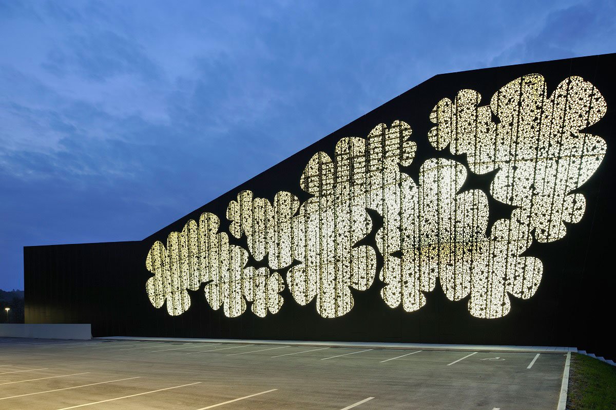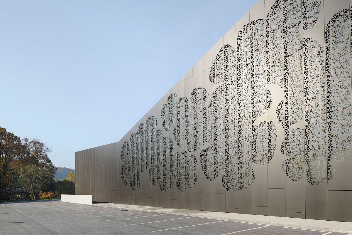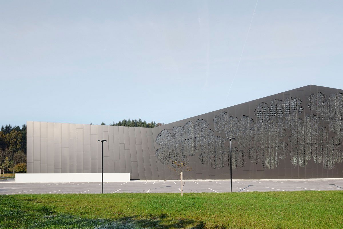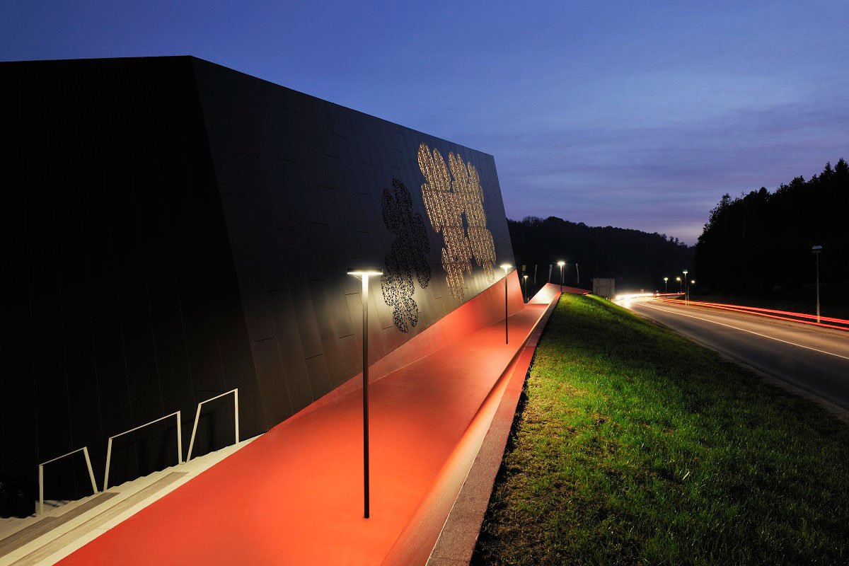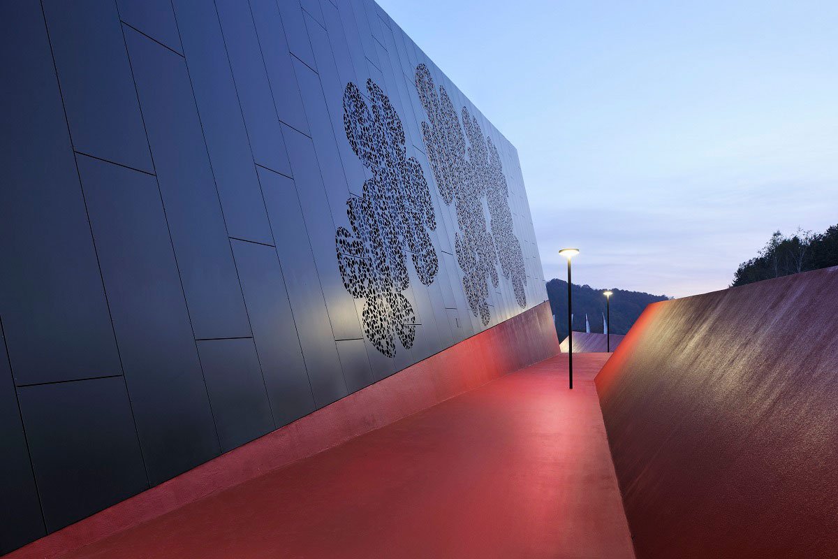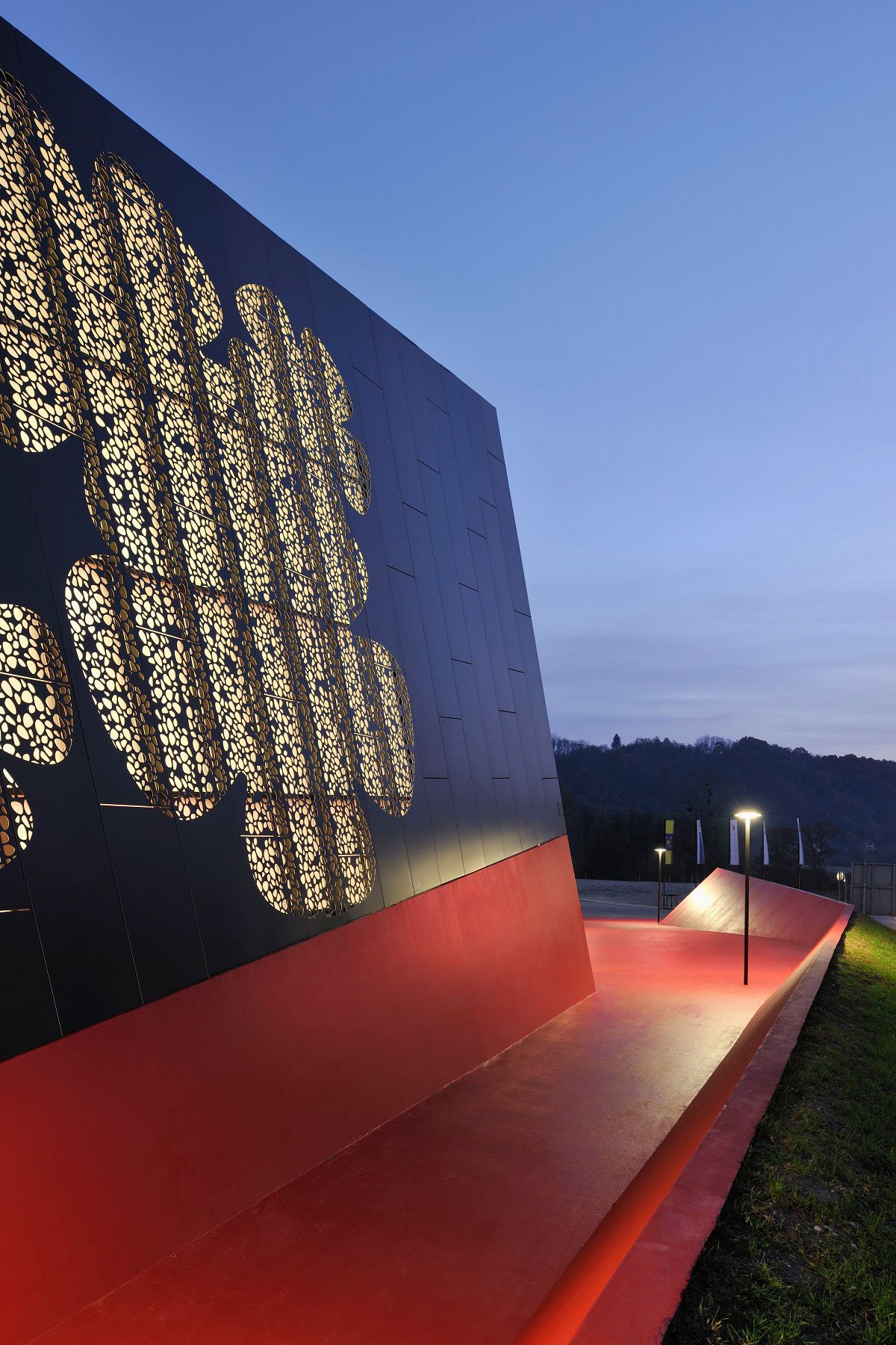 In the evenings, the lighting ornament on the facade emphasises the solemn character of the access route. As it grows darker, the perforated cladding over the window apertures lights up in a recognisable floral pattern. The activity inside is thus directly mirrored on the facade and contributes to the promotion of the events and attractiveness of the building.