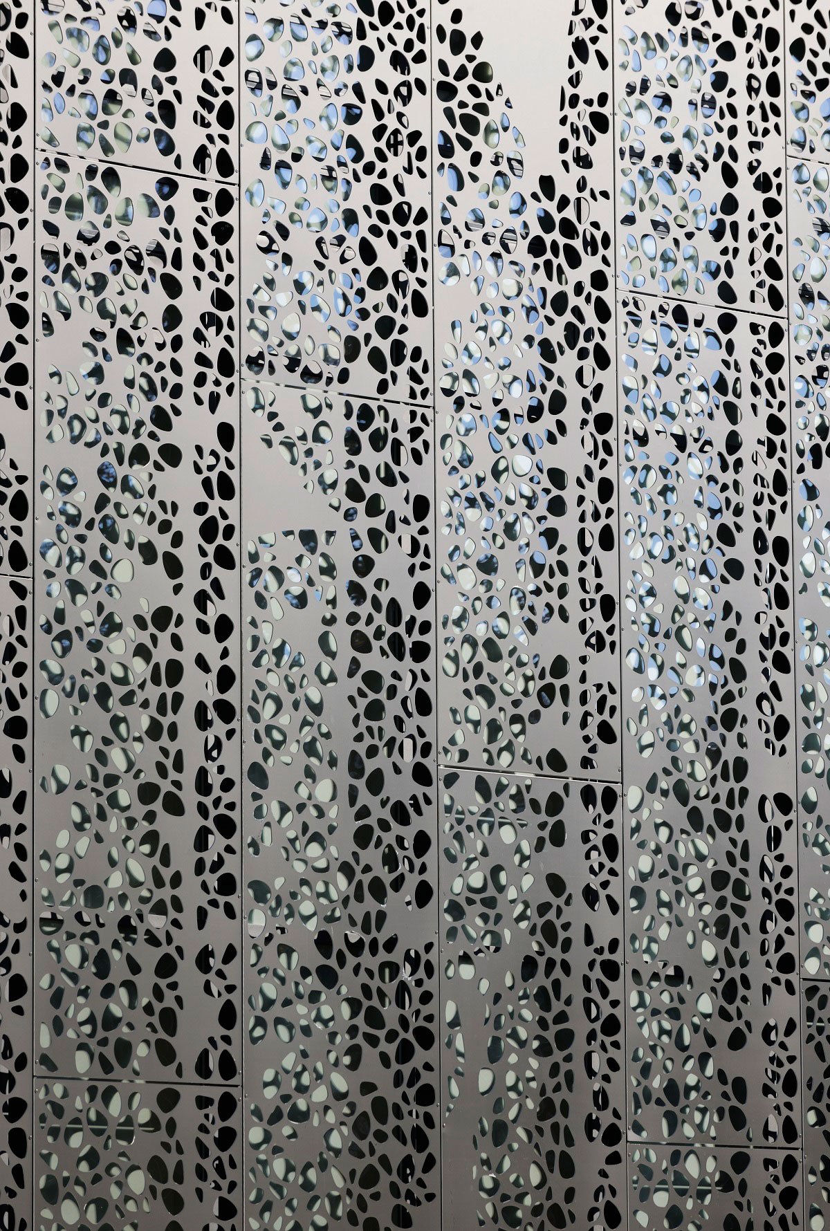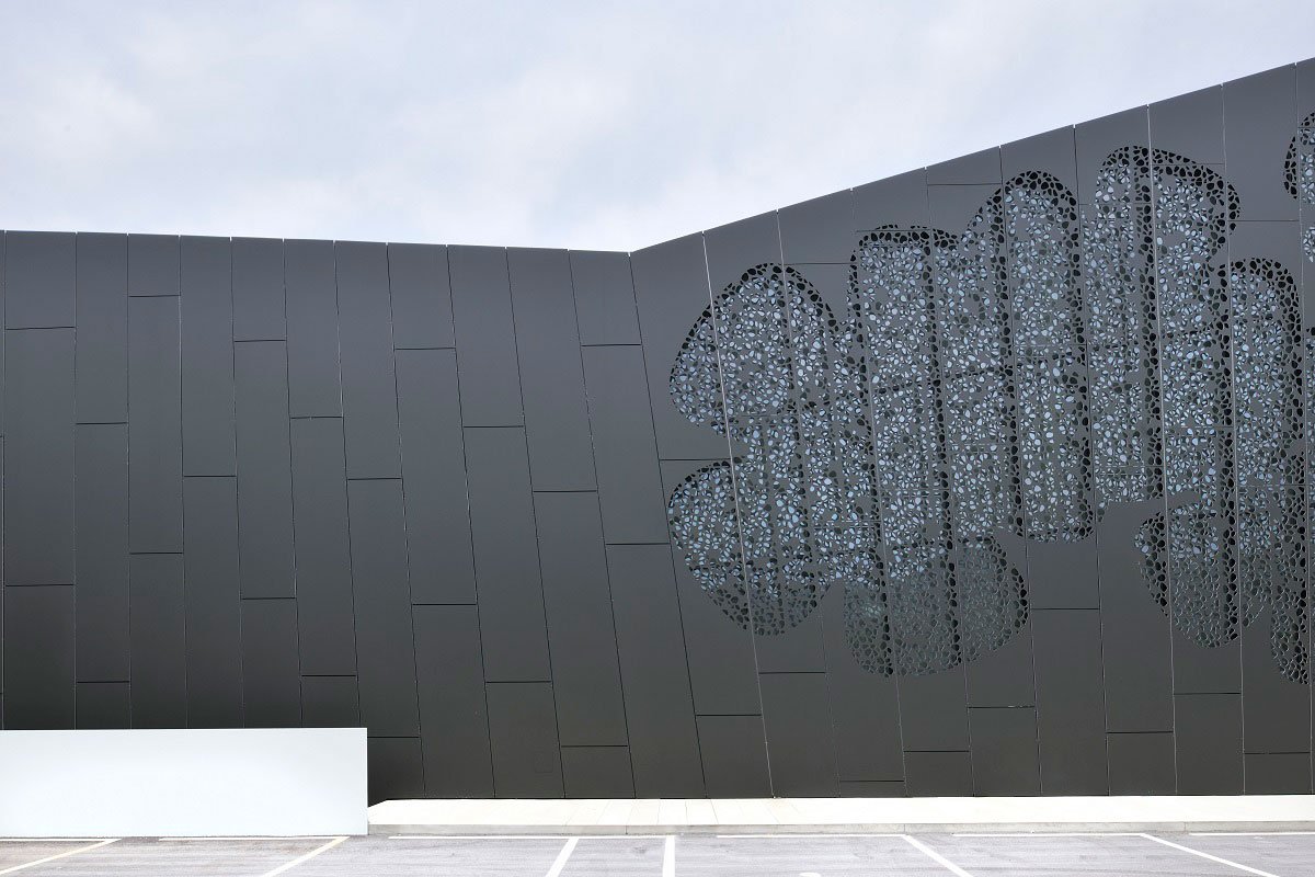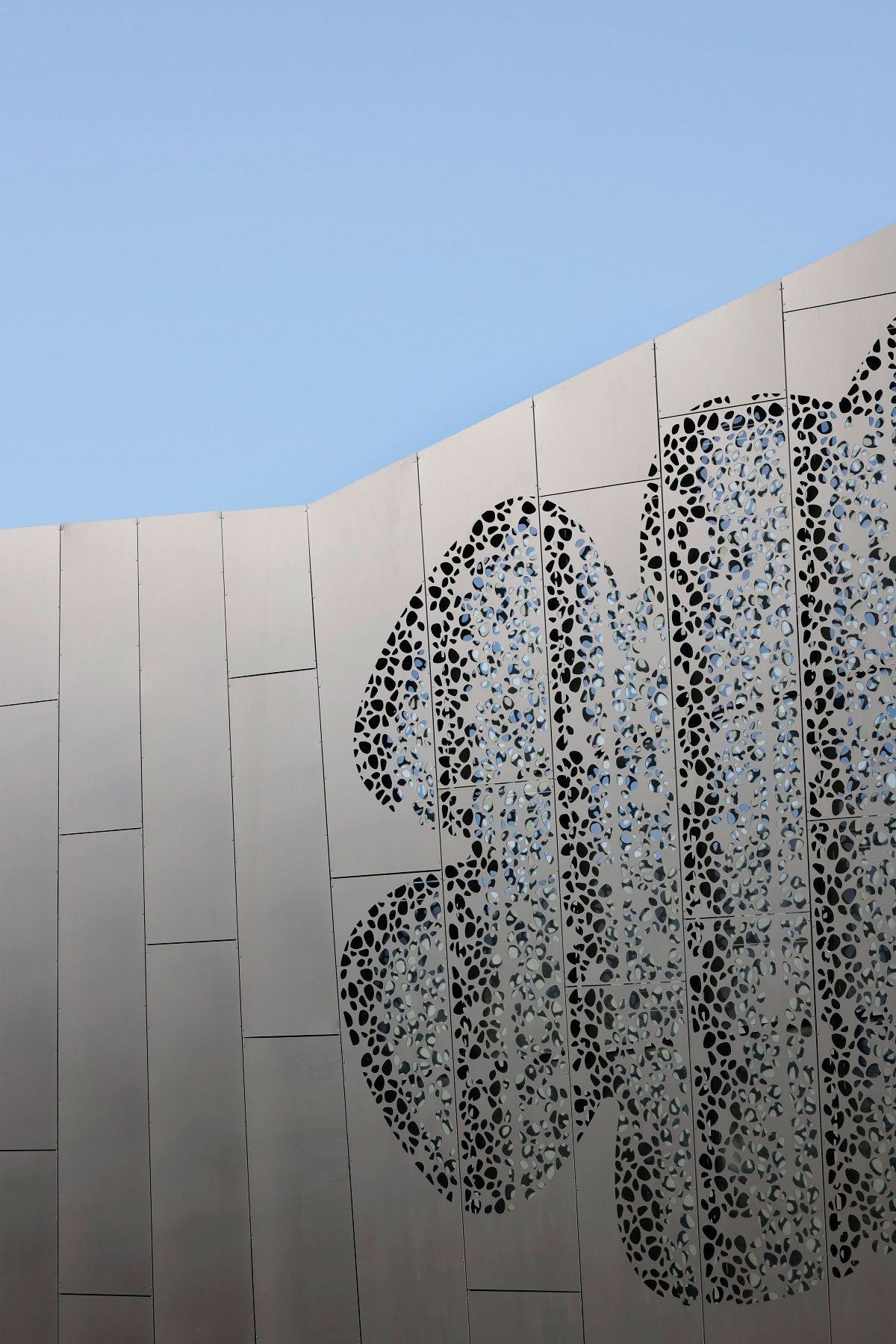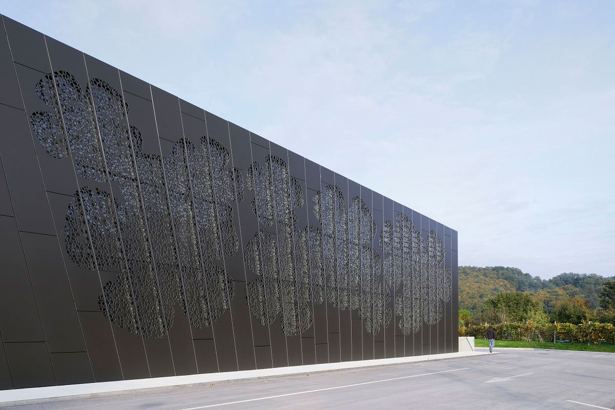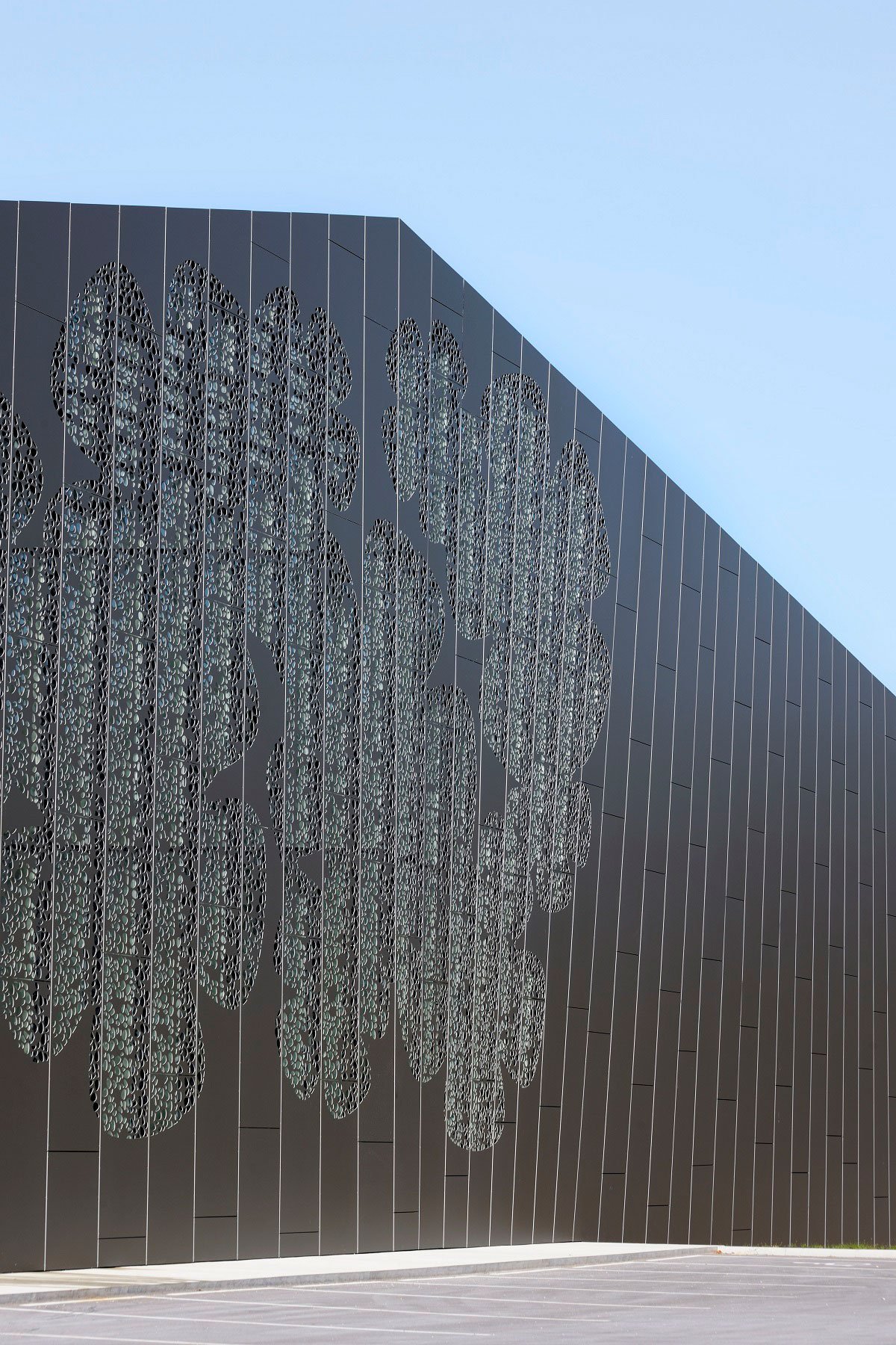 In the evenings, the lighting ornament on the facade emphasises the solemn character of the access route. As it grows darker, the perforated cladding over the window apertures lights up in a recognisable floral pattern. The activity inside is thus directly mirrored on the facade and contributes to the promotion of the events and attractiveness of the building.
