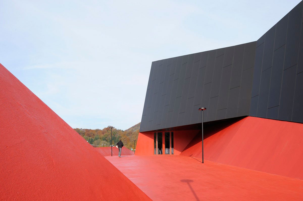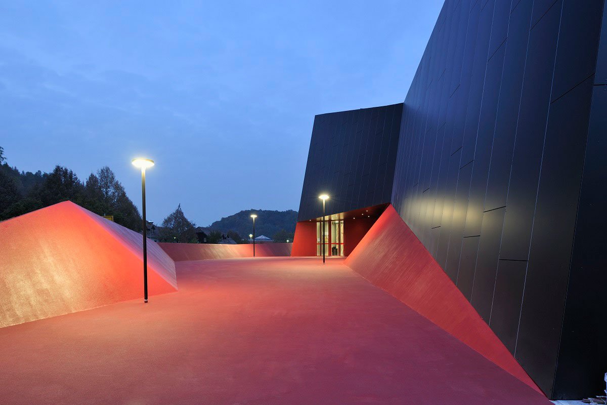 The main design cue is a “red carpet” that leads the visitors to the events taking place in the building. The access path that connects the two access points is cut into the existing earth bank. It takes advantage of the spatial anomaly and uses the bank as the means of protecting the entrance from direct interference of the road. Spatially designed and confined by the bank on one side, the path also incises into the building on the opposite side. Finished in vivid colours and attractive shapes, it widens before reaching the entrance and forms a quality space with almost square-like characteristics – an access platform that gradually envelops the visitors and directs them towards the main entrance into the hall.