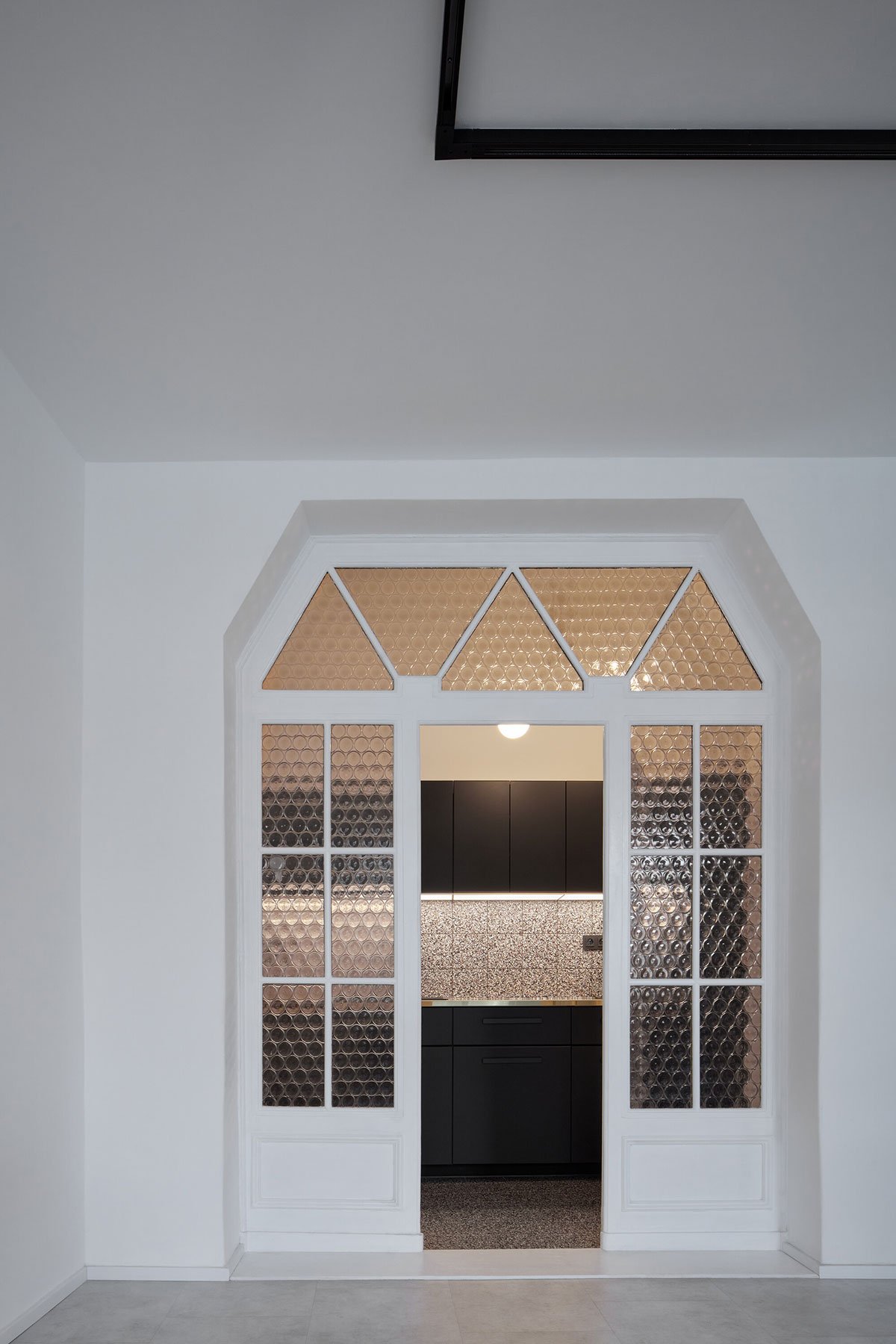 The centrally located greenhouse is a place for informal gatherings, offering a space for streaming poetry readings or serving as a place to relax. The skeleton of the greenhouse grows 171 plants, among which over 100 species are represented. The main room also houses individual workstations, which are arranged into two islands – this is where daily work and immediate communication take place. This space is connected to the kitchen and a balcony overlooking Narodni street. The main story is prefaced by the entrance hallway, which is followed by other chapters – two meeting rooms and a focus room.