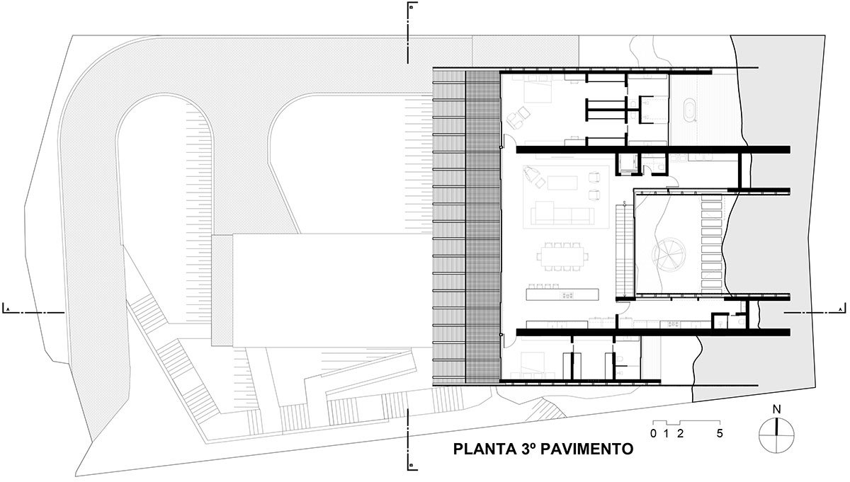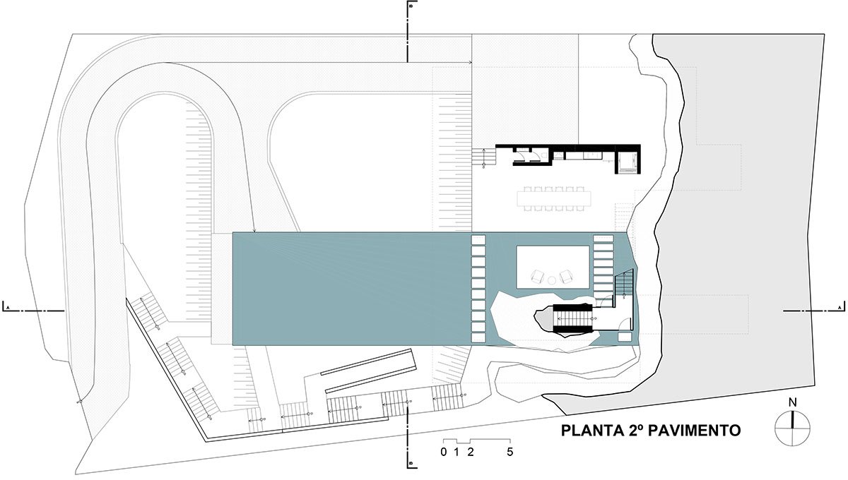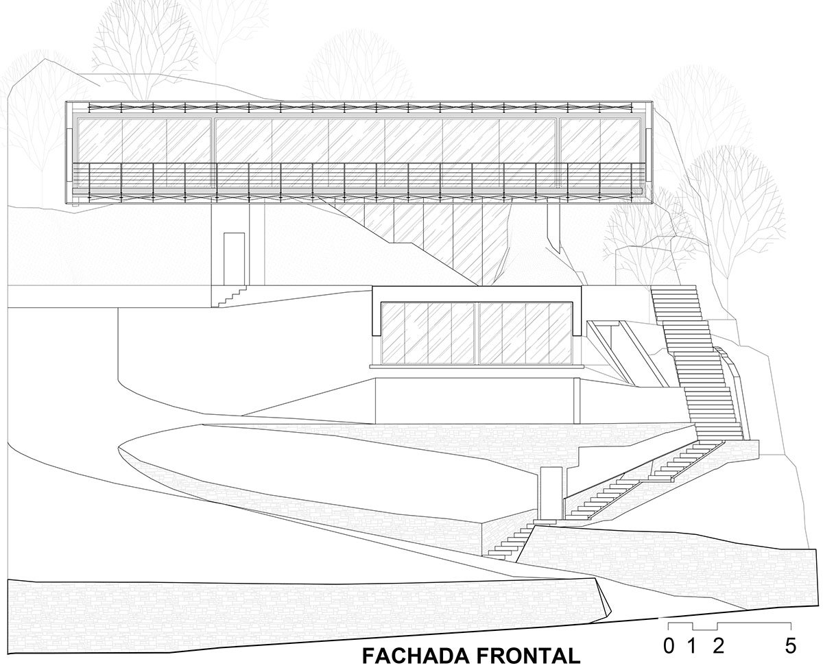 The main structure of the house can be described as two beams that emerge from the ground and rest on two pillars. The bedrooms and social areas develop around these beams. On the lower floor, the swimming pool, suspended over two other rooms, advances towards the sea. Inside, there are natural stones that make reference to the local nature.
