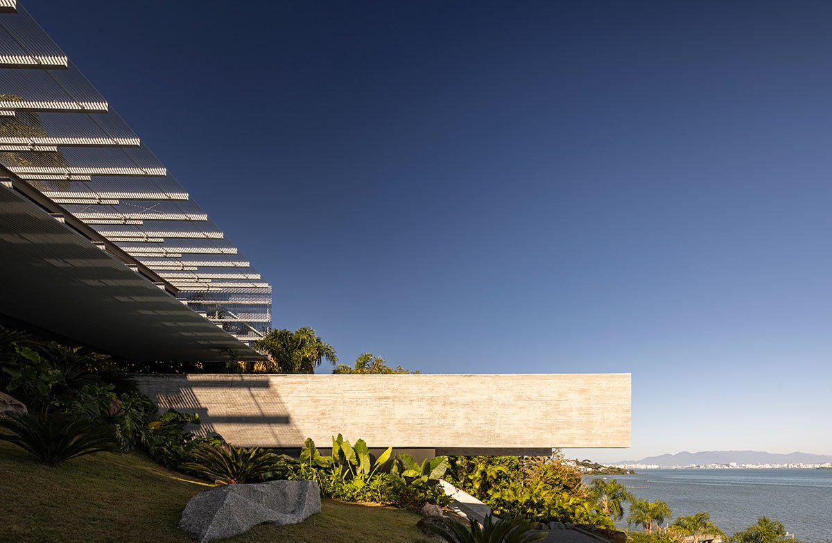 The approach to dealing with solar incidence, through generous structured steel eaves, highlights the search for efficiency and aesthetics. This solution not only meets practical demands, minimizing the effects of the setting sun, but also pays a subtle homage to the Hercílio Luz Bridge, through the use of steel and perforated sheets used on the floor of the bridge and the house’s balconies.