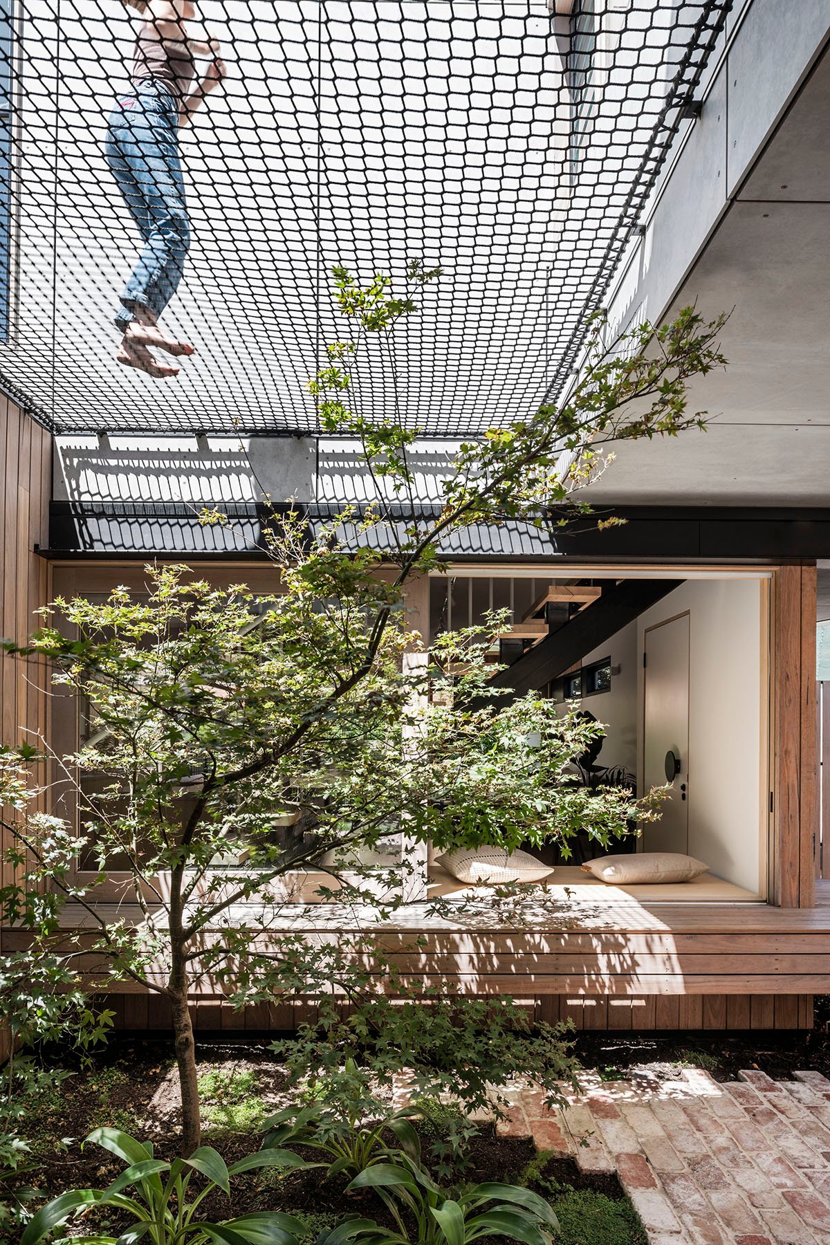 This modest 200m2 home required constraint and duality of use in its architecture. The in-between/ambiguous spaces had to contain multiple programs. One of such programs is the study positioned within a thoroughfare activating an otherwise underutilised threshold. The green wedge facilitates bicycle storage, building services and a water retention system. The outdoor terrace extends into a netted area, utilising the in-between space to create additional zones for play and activation whilst allowing light to penetrate the front courtyard. To further remove the idea of redundancy, the underbelly of the dwelling doubles up as a carport, an extension of the workshop and informal entertaining area.