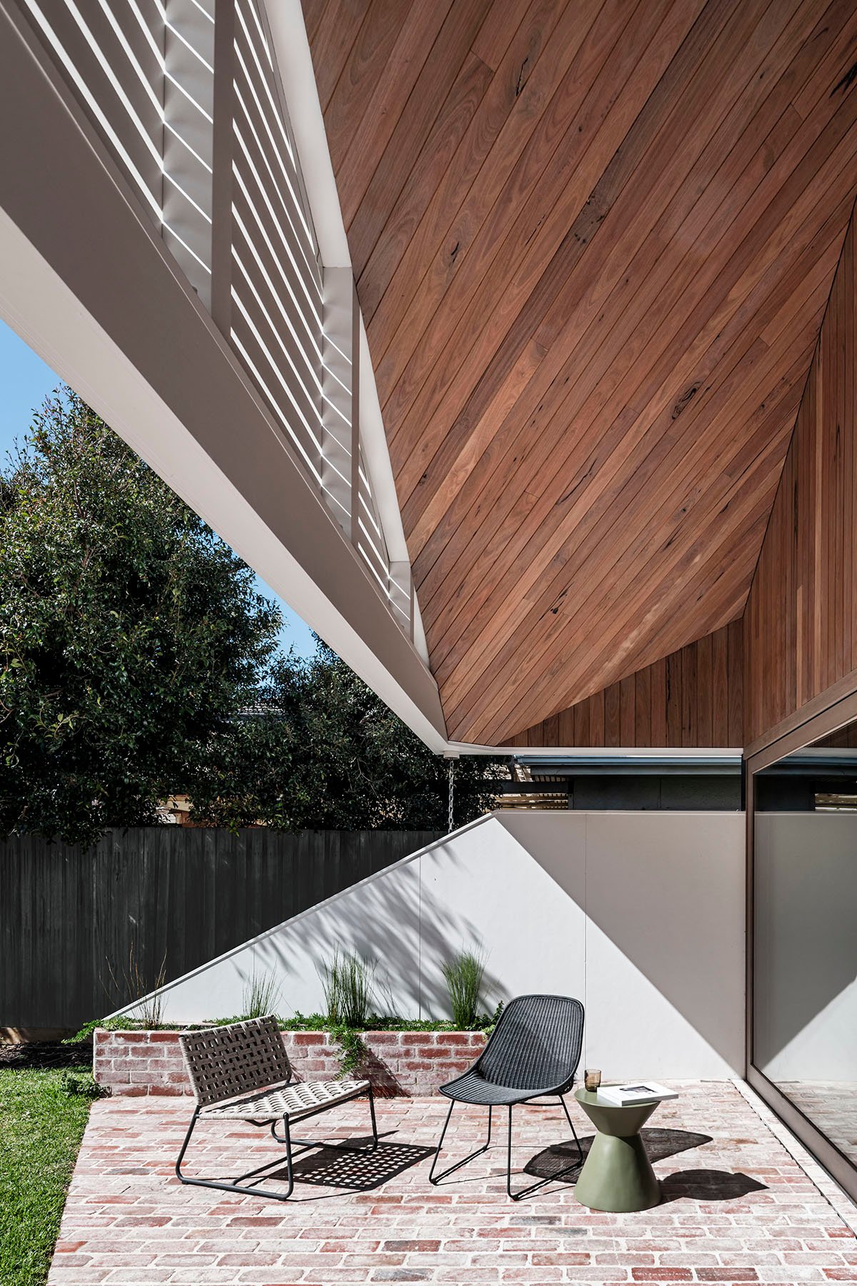 When presented from the street, the elevation is an extruded silhouette which is a sympathetic nod to the familiar roof forms of the surrounding vernacular. The upper volume of the building hovers above a landscaped mount that creates the beginning of a journey into the house. Flanked by existing neighbouring brick walls, that become internal edges which establish a dialogue between old and new. The hovering belly of the house creates an undercroft that guides the guests into the house through lush, landscaped gardens creating a multi-faceted zone in the front yard that can adapt and evolve in program/use. The green landscaped wedge is planted with native vegetation which gently slopes back to the street frontage creating a mount that engages the public realm. From the outset our clients felt their new home had to engage with the context beyond the site boundary creating a visually engaging public setting where neighbours and friends can be part of informal gatherings.