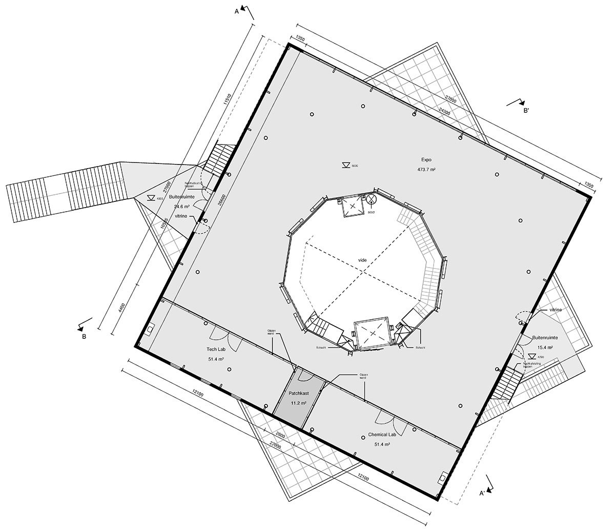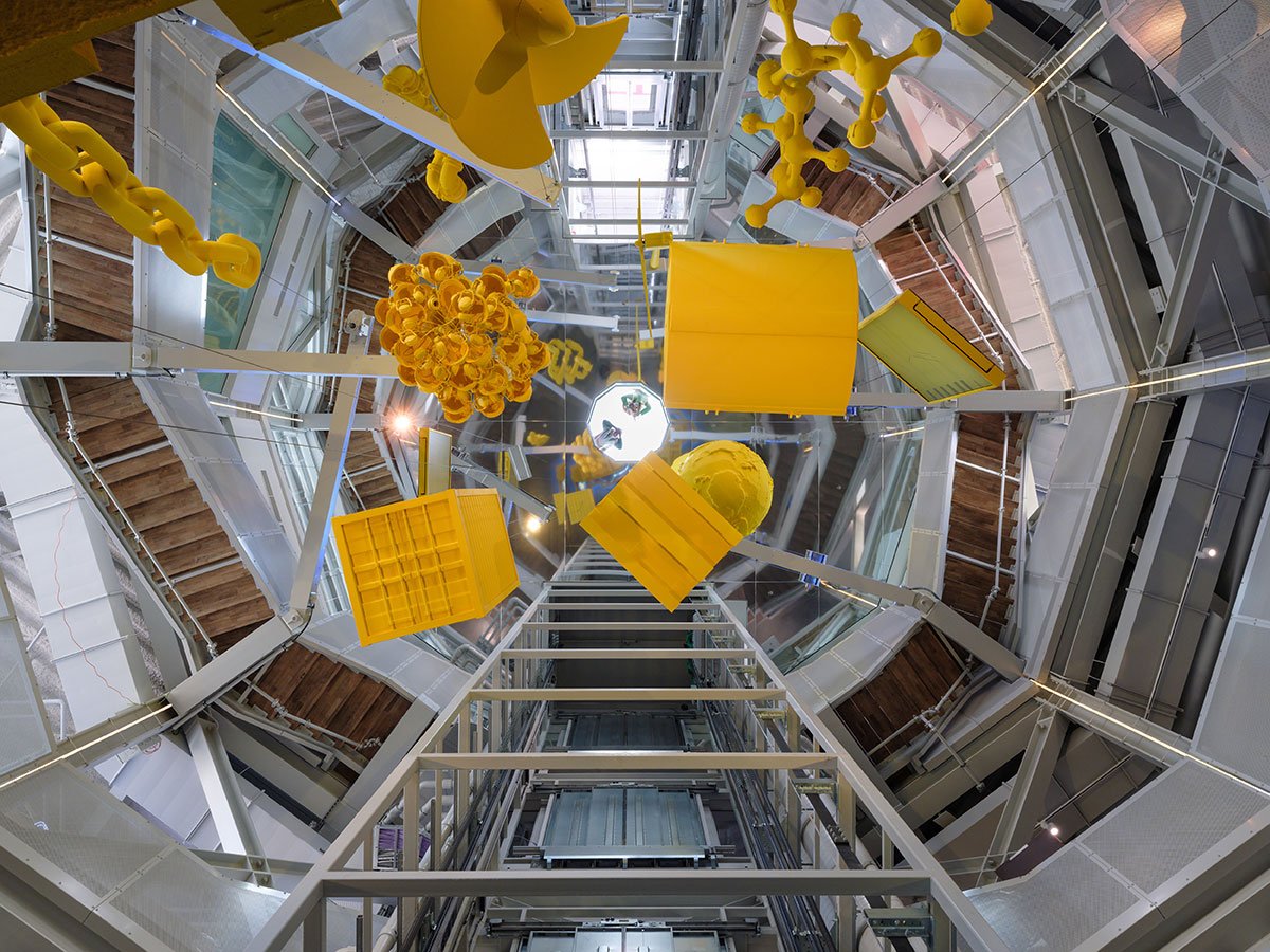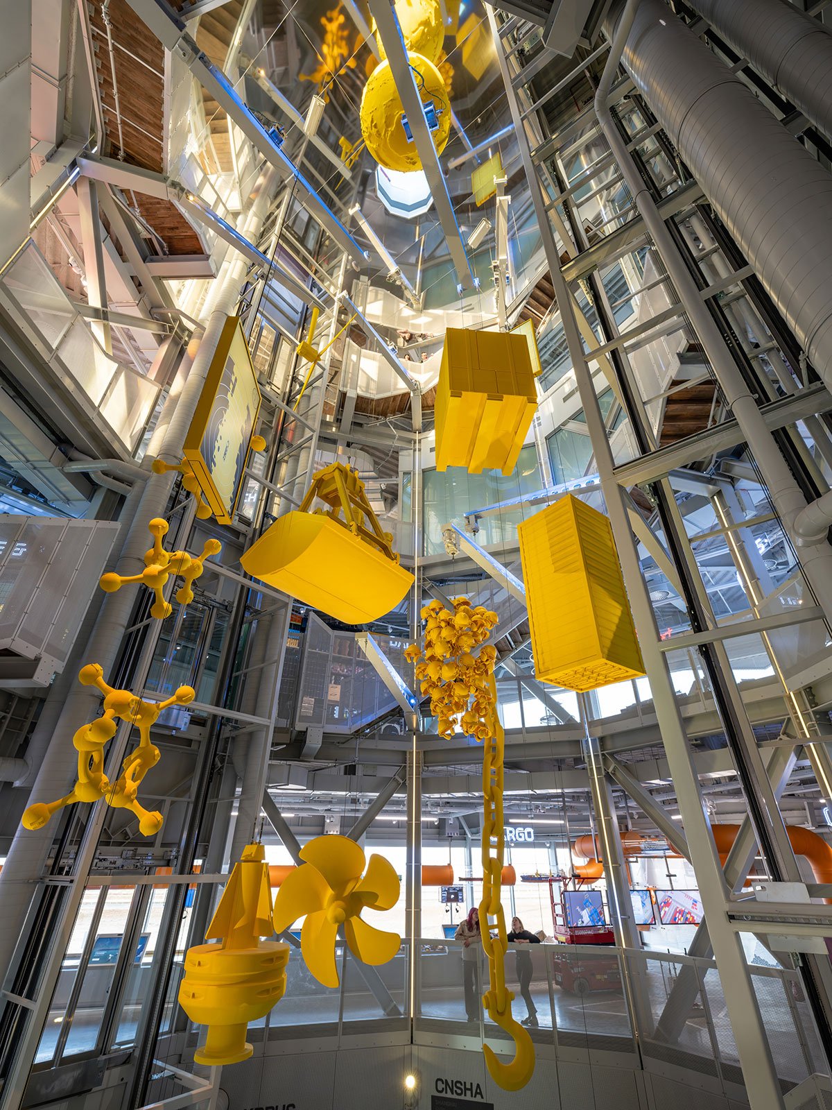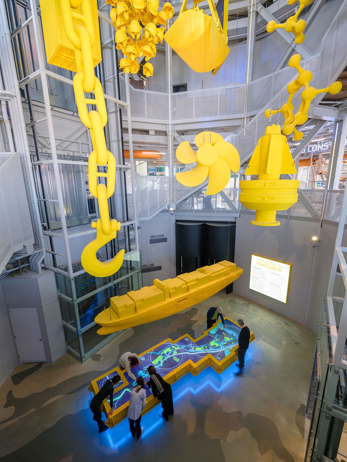 The permanent exhibition, designed by Kossmanndejong, is spread over the three levels in between as objects in this industrial environment. In the exhibition, each level addresses a different theme, and the panorama windows are focused on elements within the port that enhance the content of the exhibition. At the centre of the building is a 22-metre-tall atrium that functions as an exhibition space in its own right. A kinetic sculpture hangs in its centre, with a model of the Port of Rotterdam greeting visitors on the ground floor. This dramatic space is emphasised by the mirrored ceiling, which doubles its apparent height, and by the entrance from the ground floor, in which a rotating door conceals the exhibition until visitors enter the voluminous heart of the building.