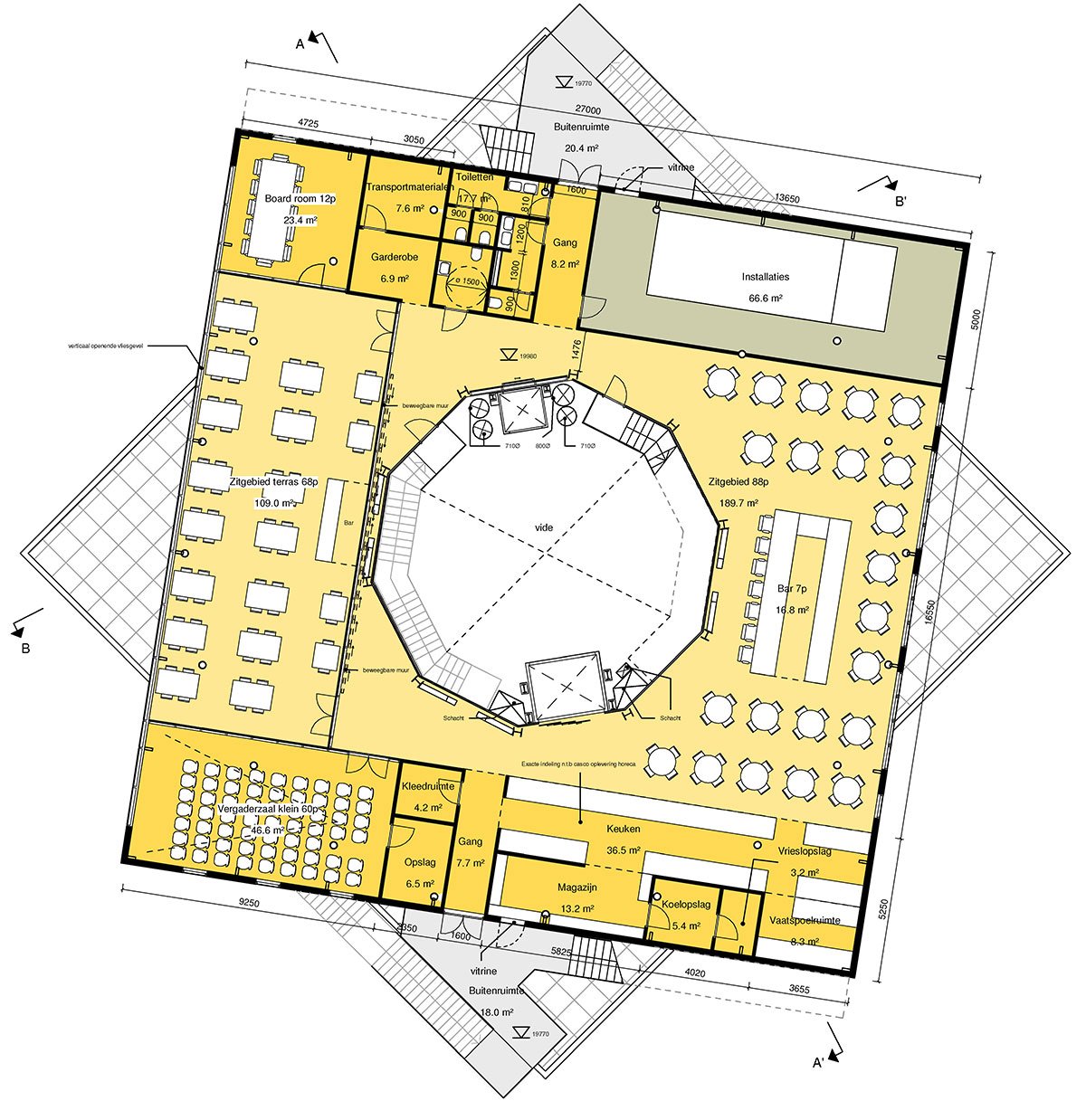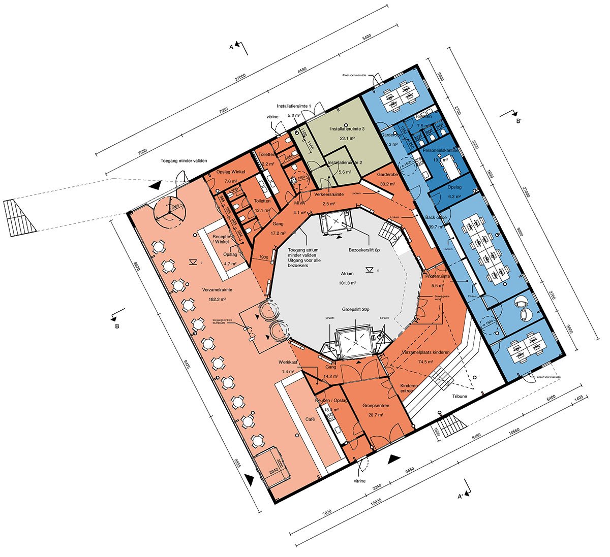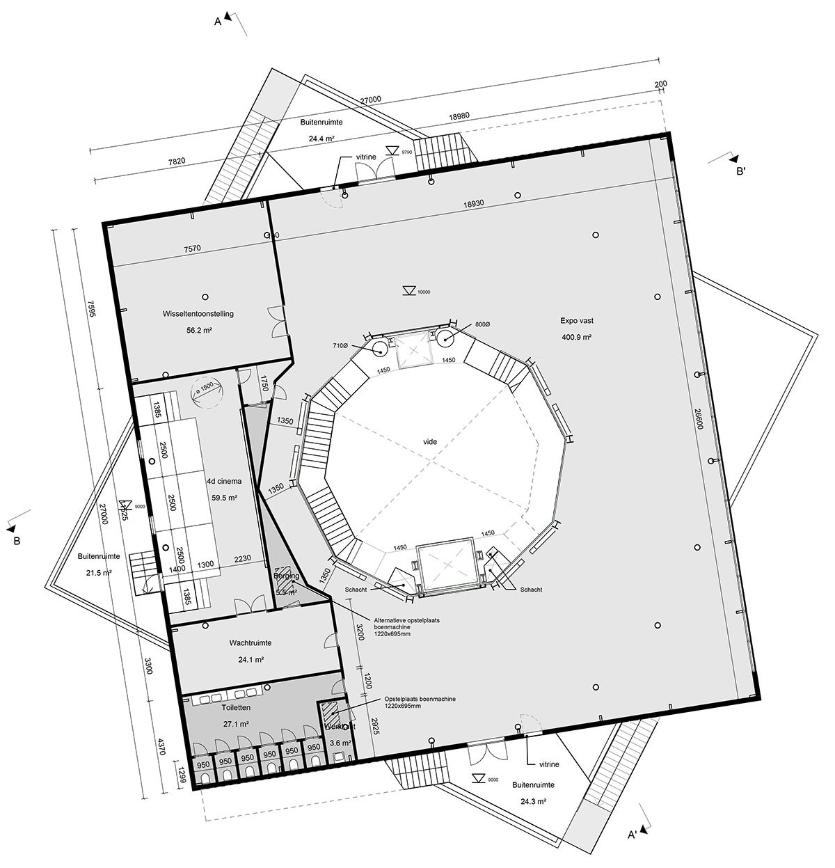 The permanent exhibition, designed by Kossmanndejong, is spread over the three levels in between as objects in this industrial environment. In the exhibition, each level addresses a different theme, and the panorama windows are focused on elements within the port that enhance the content of the exhibition. At the centre of the building is a 22-metre-tall atrium that functions as an exhibition space in its own right. A kinetic sculpture hangs in its centre, with a model of the Port of Rotterdam greeting visitors on the ground floor. This dramatic space is emphasised by the mirrored ceiling, which doubles its apparent height, and by the entrance from the ground floor, in which a rotating door conceals the exhibition until visitors enter the voluminous heart of the building.