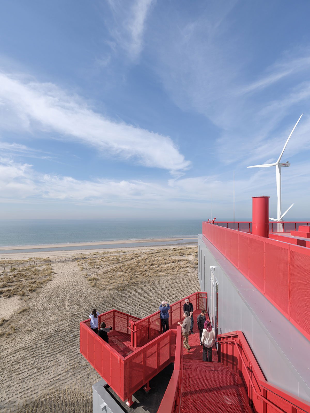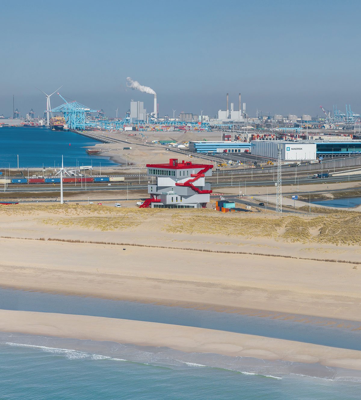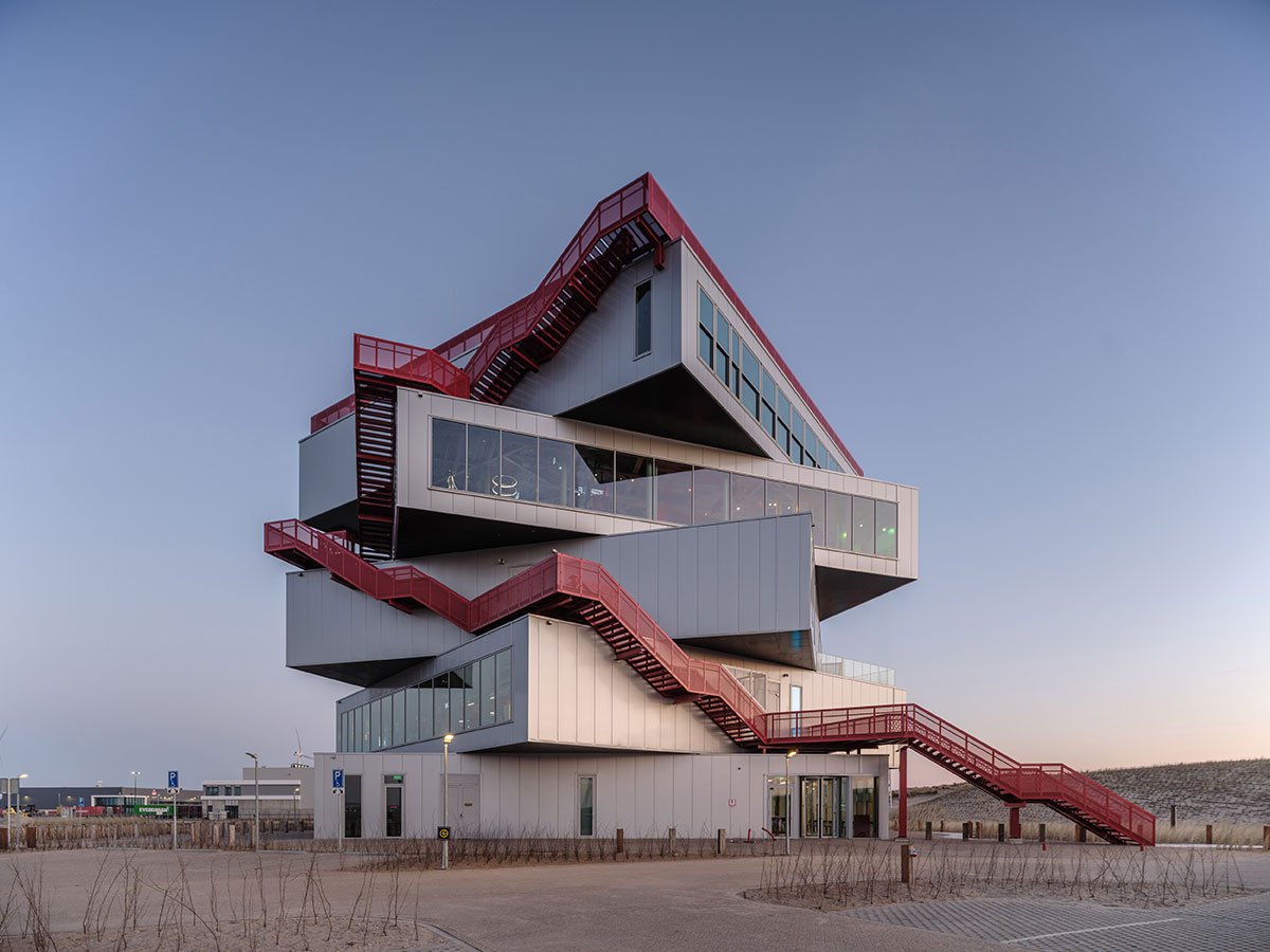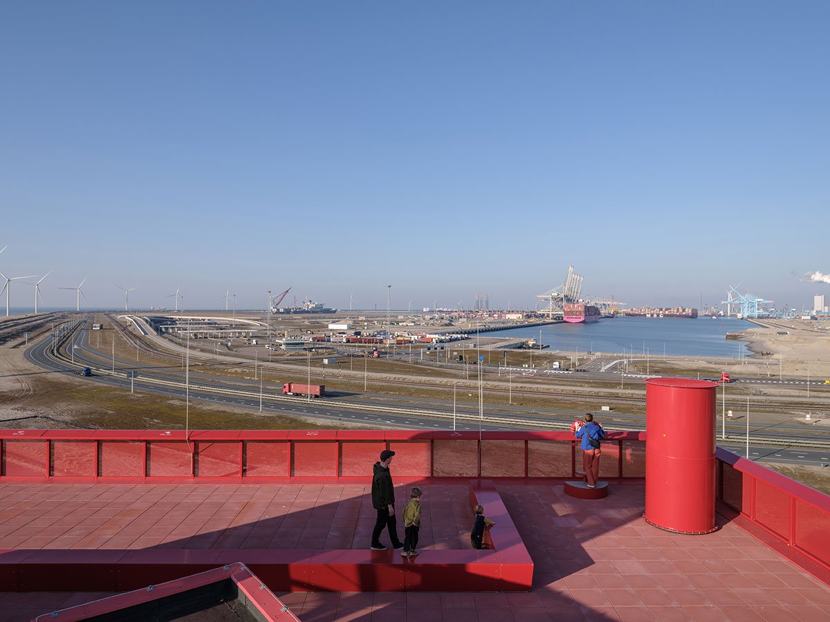 The MVRDV-designed Portlantis is a visitor and exhibition centre for the Port of Rotterdam located at the port’s western-most point. Comprising a stack of five rotated exhibition spaces, the building stands out from its surroundings with its crimson-red public route from the dunes to its rooftop, while offering spectacular views in all directions of the North Sea, the coastline, and the port.