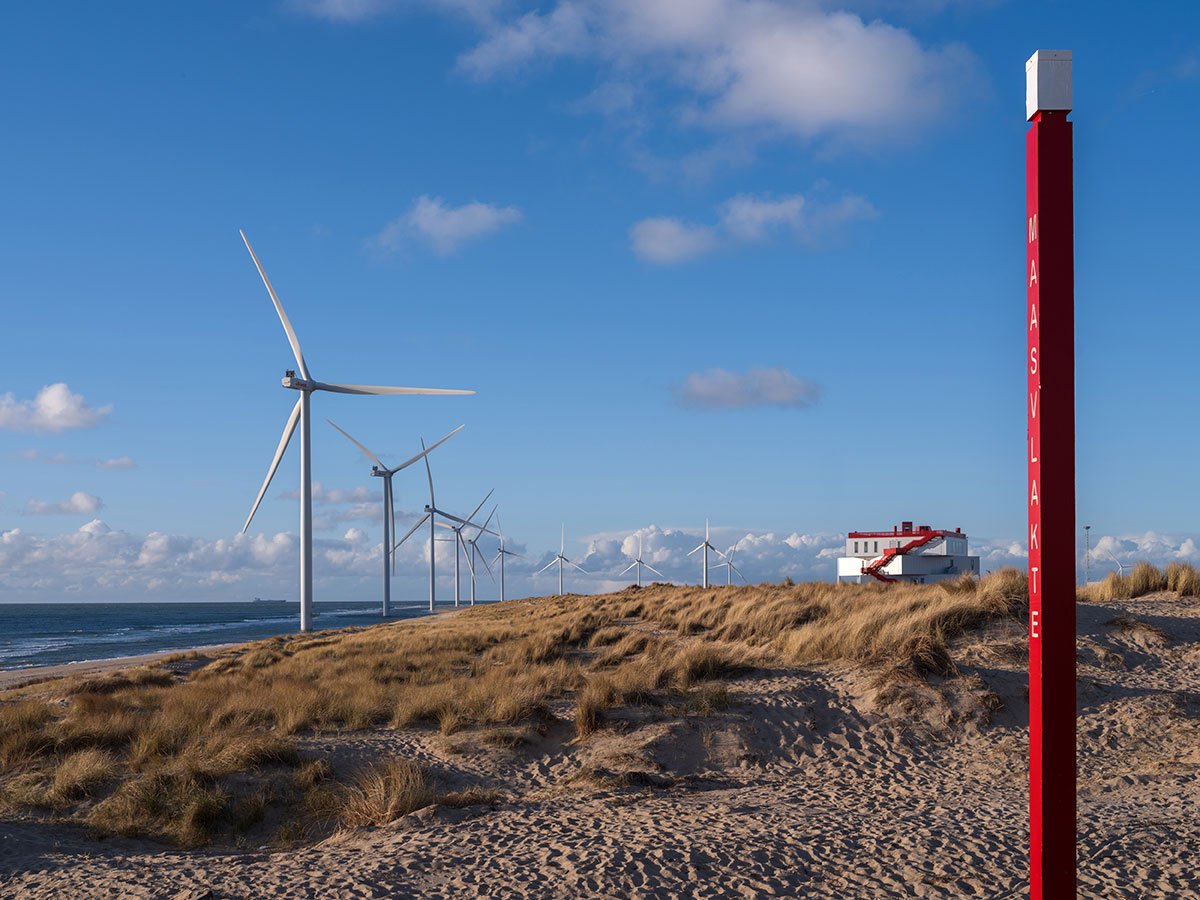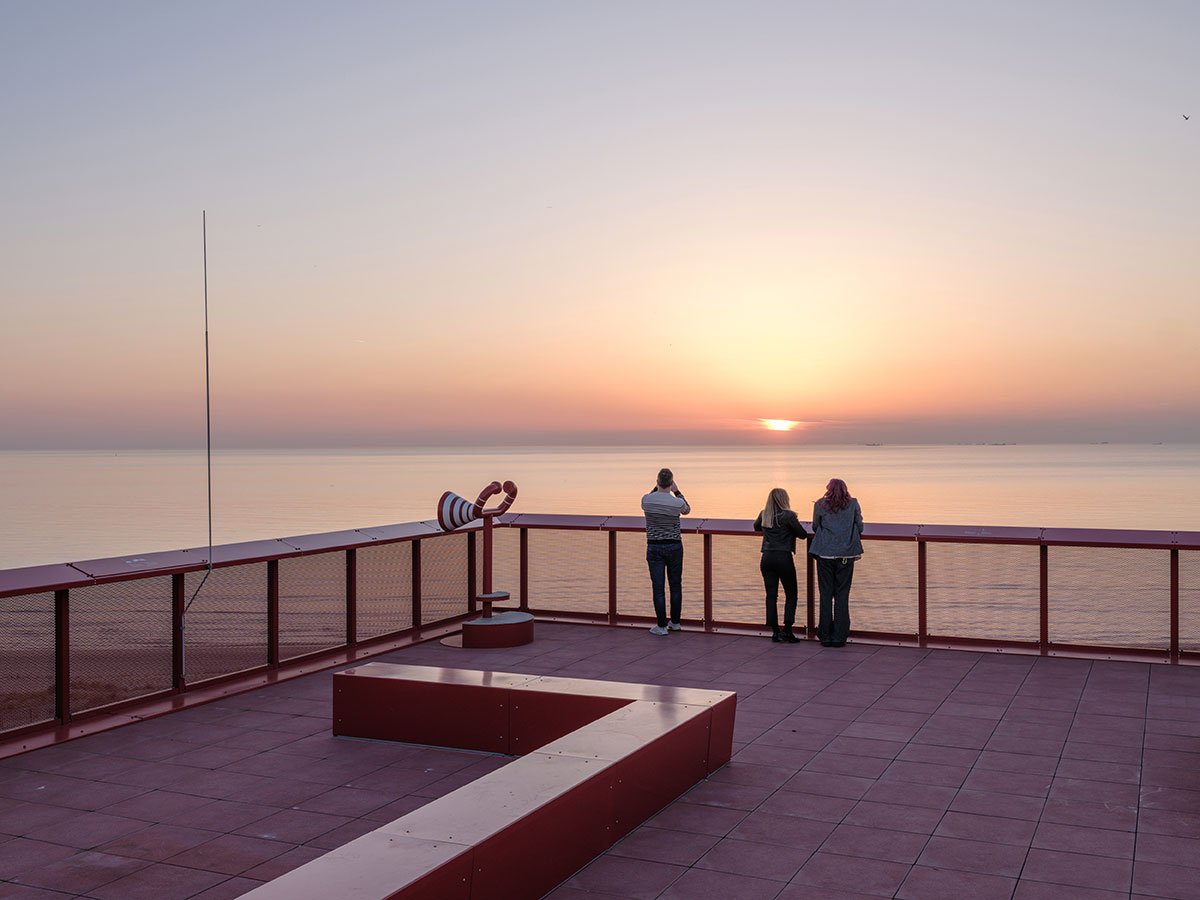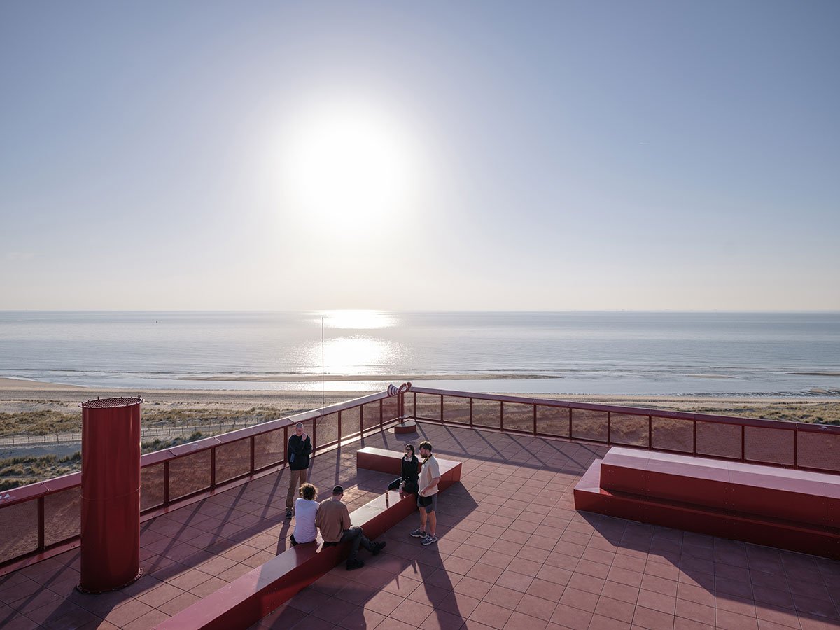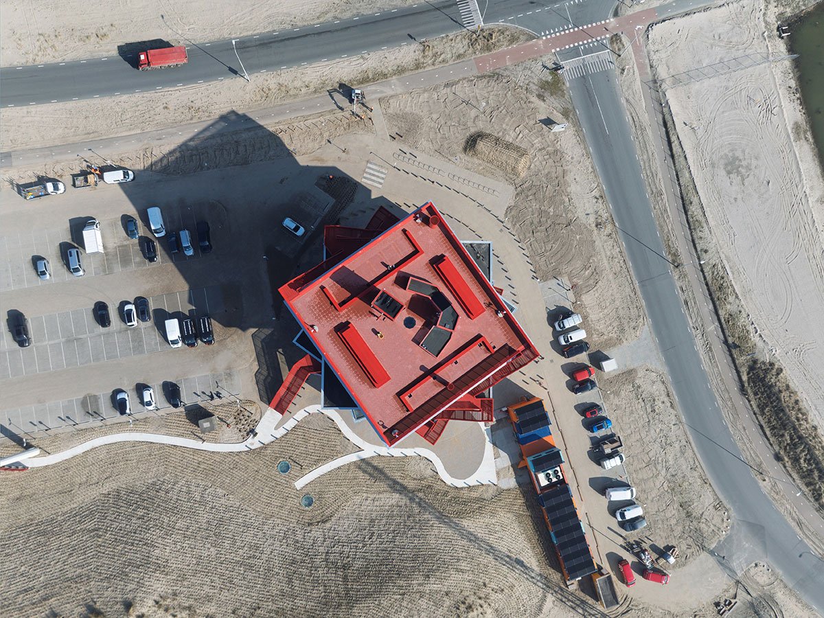 The MVRDV-designed Portlantis is a visitor and exhibition centre for the Port of Rotterdam located at the port’s western-most point. Comprising a stack of five rotated exhibition spaces, the building stands out from its surroundings with its crimson-red public route from the dunes to its rooftop, while offering spectacular views in all directions of the North Sea, the coastline, and the port.