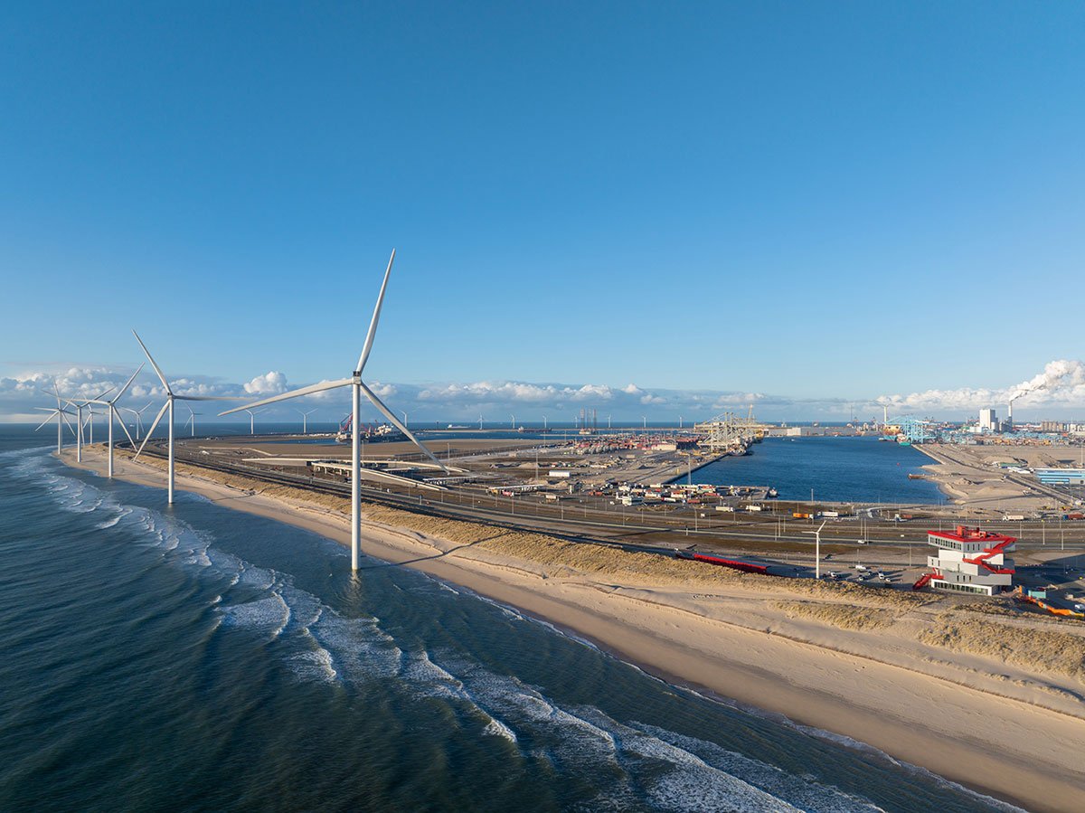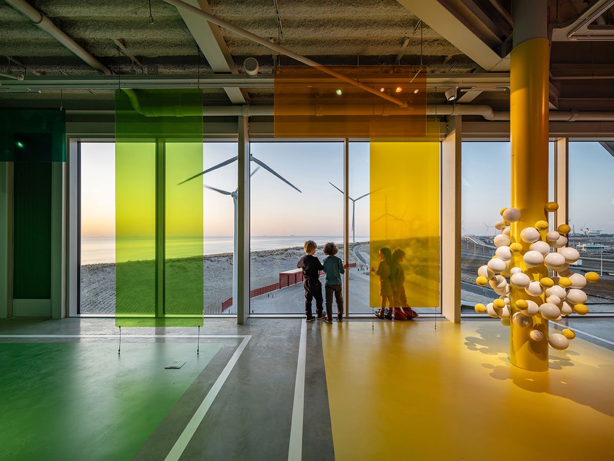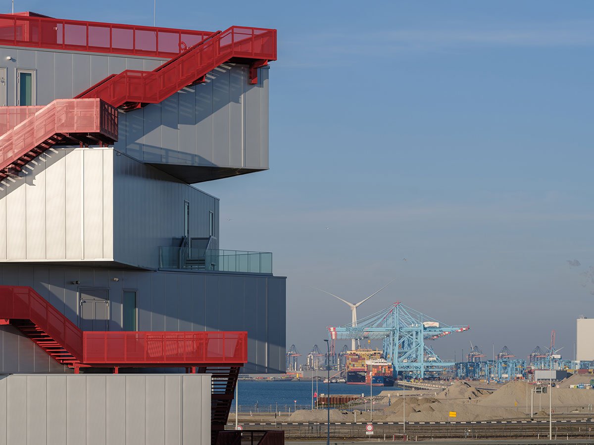 Occupying a prominent location on the beach of the port’s Maasvlakte 2 artificial land extension, Portlantis creates a beacon that is visible from afar. It takes a practical, no-nonsense approach to its educational task, channelling the spirit of the port with its simple functionality, dramatic presence, and industrial materials. The shape of the building is a direct response to the activities taking place inside and out: each floor is square in plan and has a large panorama window that frames a different view of the surroundings. The orientation of each floor, and the direction its main window faces, corresponds to its function: on the ground floor café, this window faces westward and provides an intimate view of the dunes, while diners in the fourth-floor restaurant can enjoy views of both sunsets over the North Sea and the illuminated skyline of the port at night.