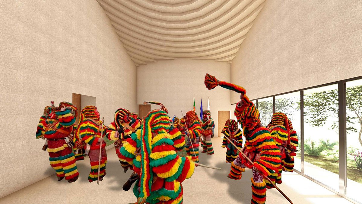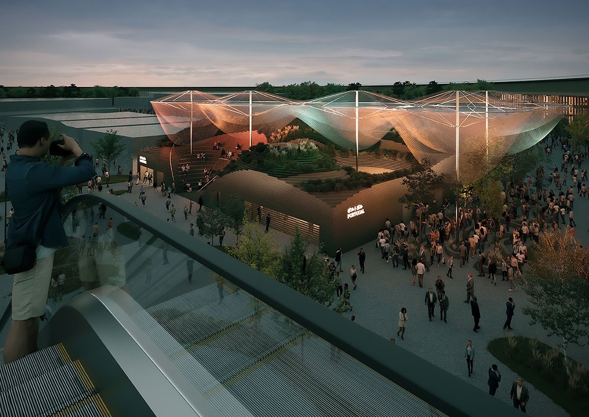 [Text as submitted by architect] The proposal for the Pavilion of Portugal for Expo 2025 Osaka is inspired by the deep seabed, whose topographic heterogeneity hosts a tremendous wealth of biodiversity. The image of the Portugal Pavilion, therefore, results from the composition of two elements: the topography – a volume clad in cork that houses the Pavilion’s program – evoking underwater mountain ranges, and the canopy that overlays it – a fabric made of seaweed fibers constantly flowing with the wind, designed to create a comfortable outdoor space.