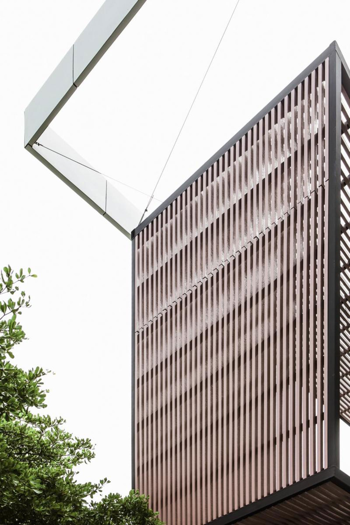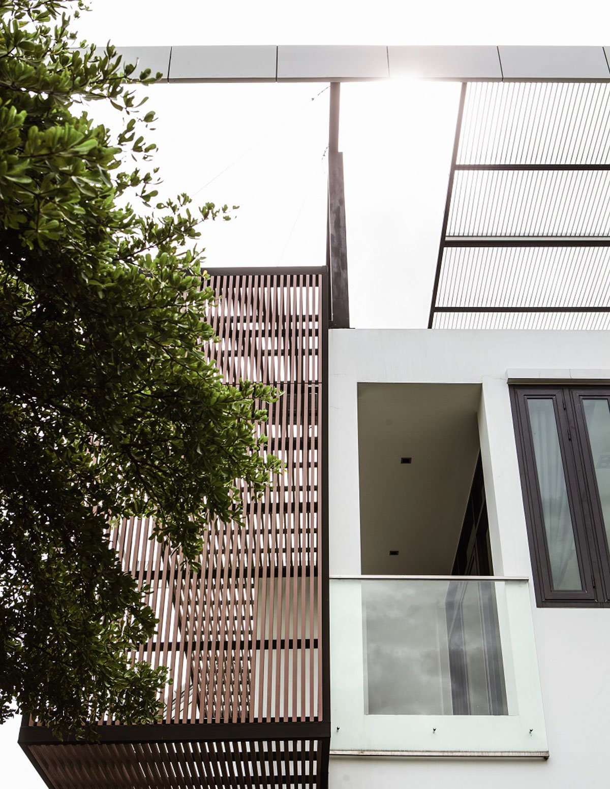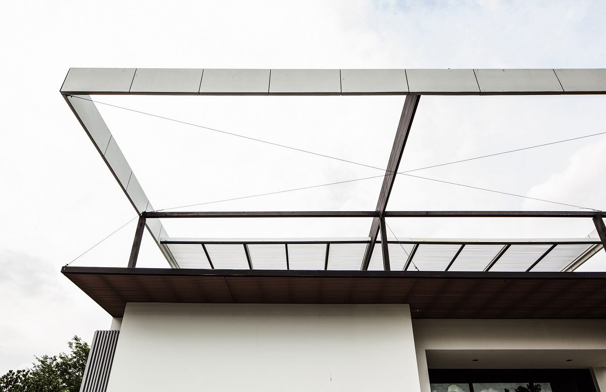 The most outstanding feature of this house is a roof structure on the top with overhanging eave. This roof with aluminium slats allows control of sunlight and spatial perception. The large wood-fiber cement slats that are placed in front of the master bedroom enable the inhabitants to rest in sweet dreams.