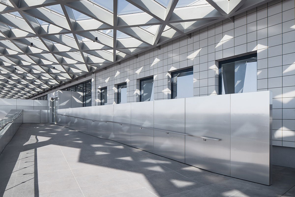 On the airside, a striking new architectural feature was introduced—a steel canopy with a distinctive “web-like” structure composed of equilateral triangles, supported by seven truncated pyramid-shaped columns. The canopy’s geometry is echoed in the design of new staircases and ramps with brushed metal cladding, creating an elegant and iconic silhouette visible from afar. The redesign also reflects the need to separate operational flows, introducing independent entrances for VIP guests, tour groups, arrivals, and departures to ensure smooth and secure circulation.