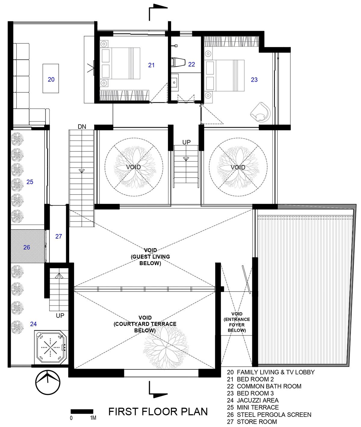 The main living space directly opens out to the two internal courtyards and to the garden void at the road front with covered unplastered wire-cut brick wall. Daylight as well as embracing natural light and ventilation into the house was purely done by the usage of large window openings and fixed tempered glasses.