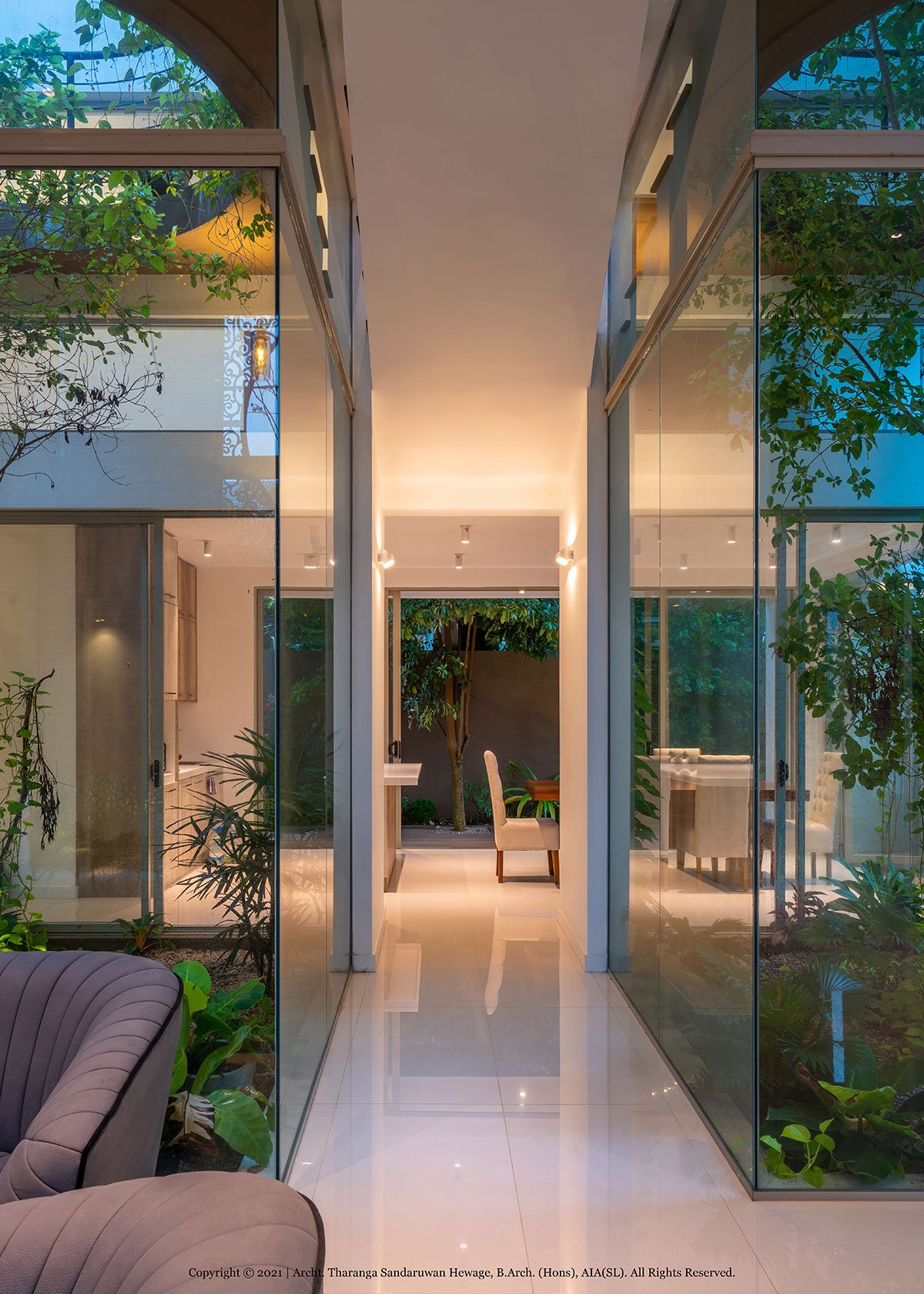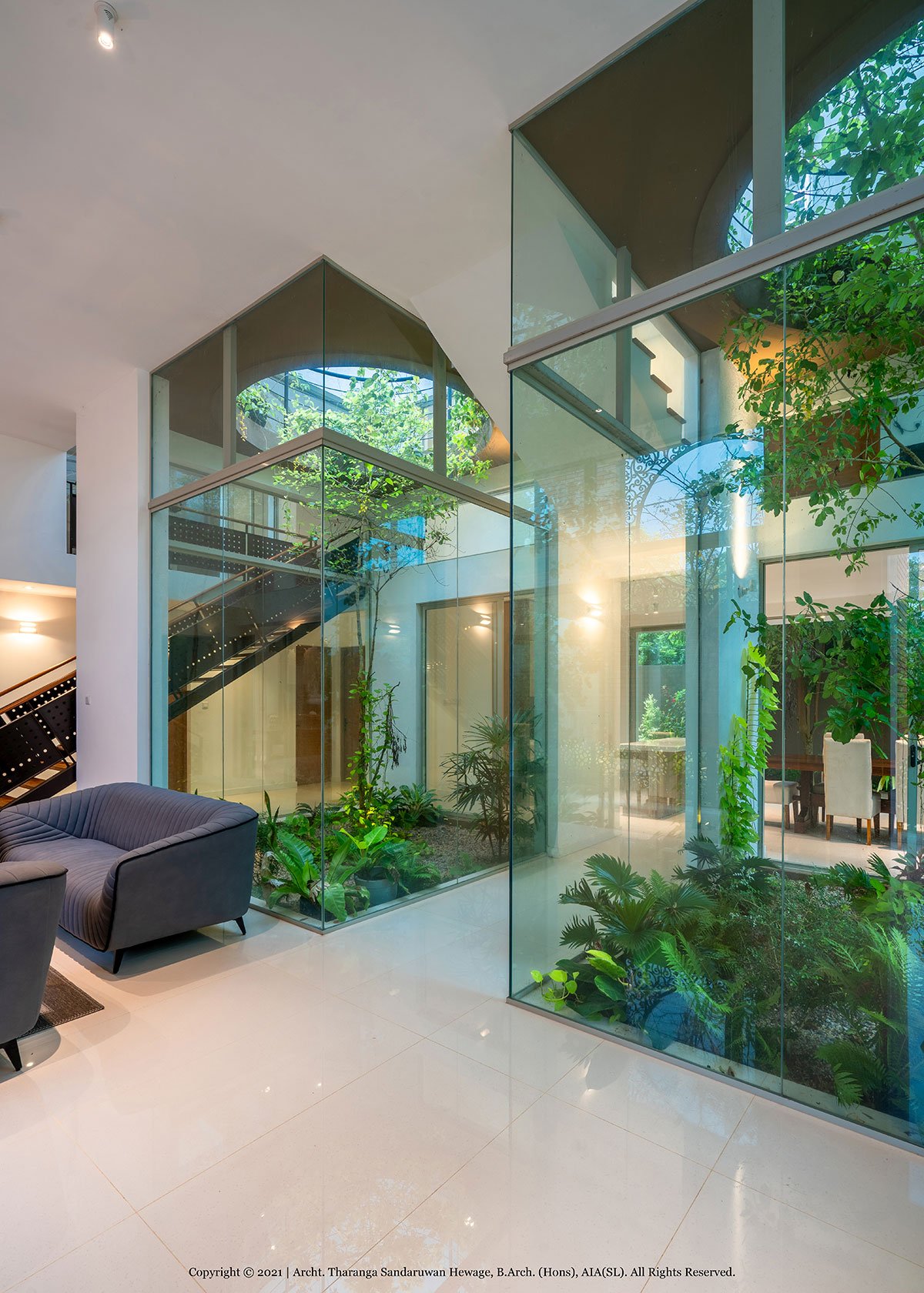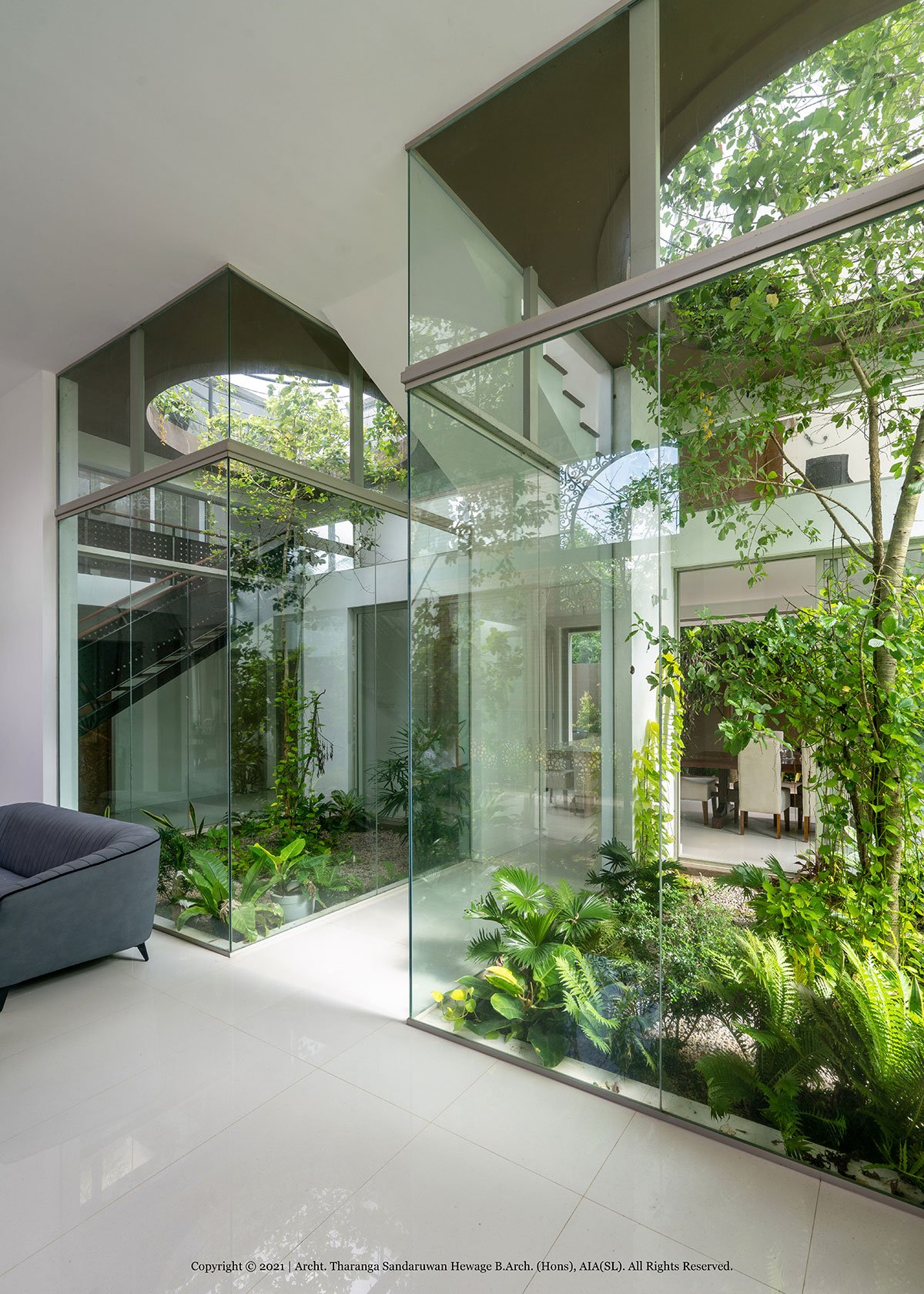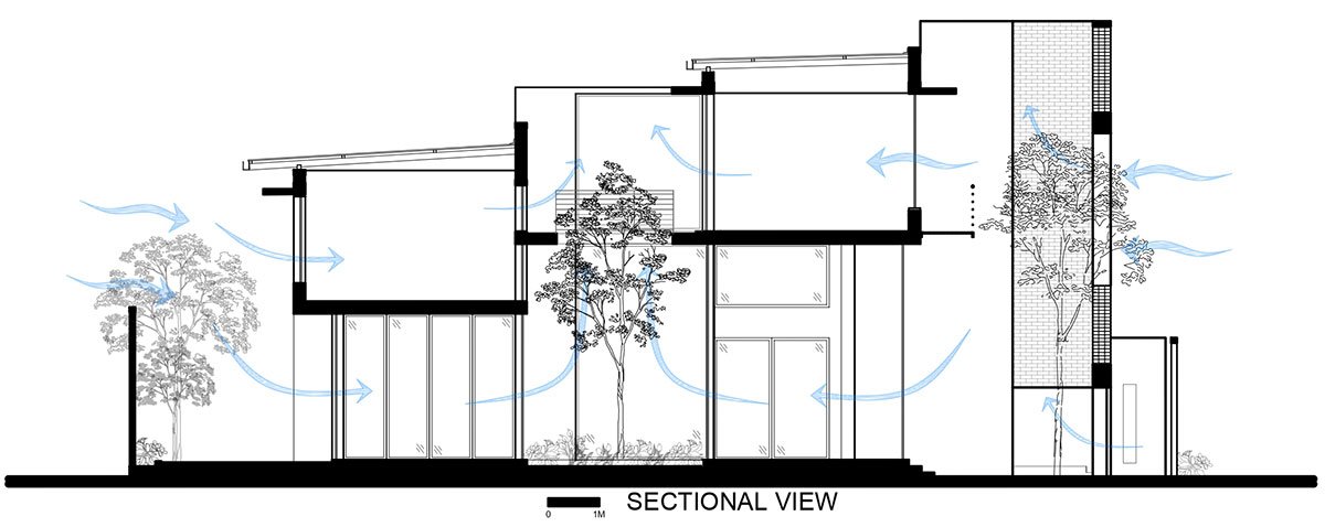 As well as being aesthetically pleasing, the internal courtyards function by letting in eastern light through fixed tempered glass and openable sliding windows allow cool air and daylight while the transitional passages around the internal courtyards provide serene accessibility toward each space by interconnecting each one.
