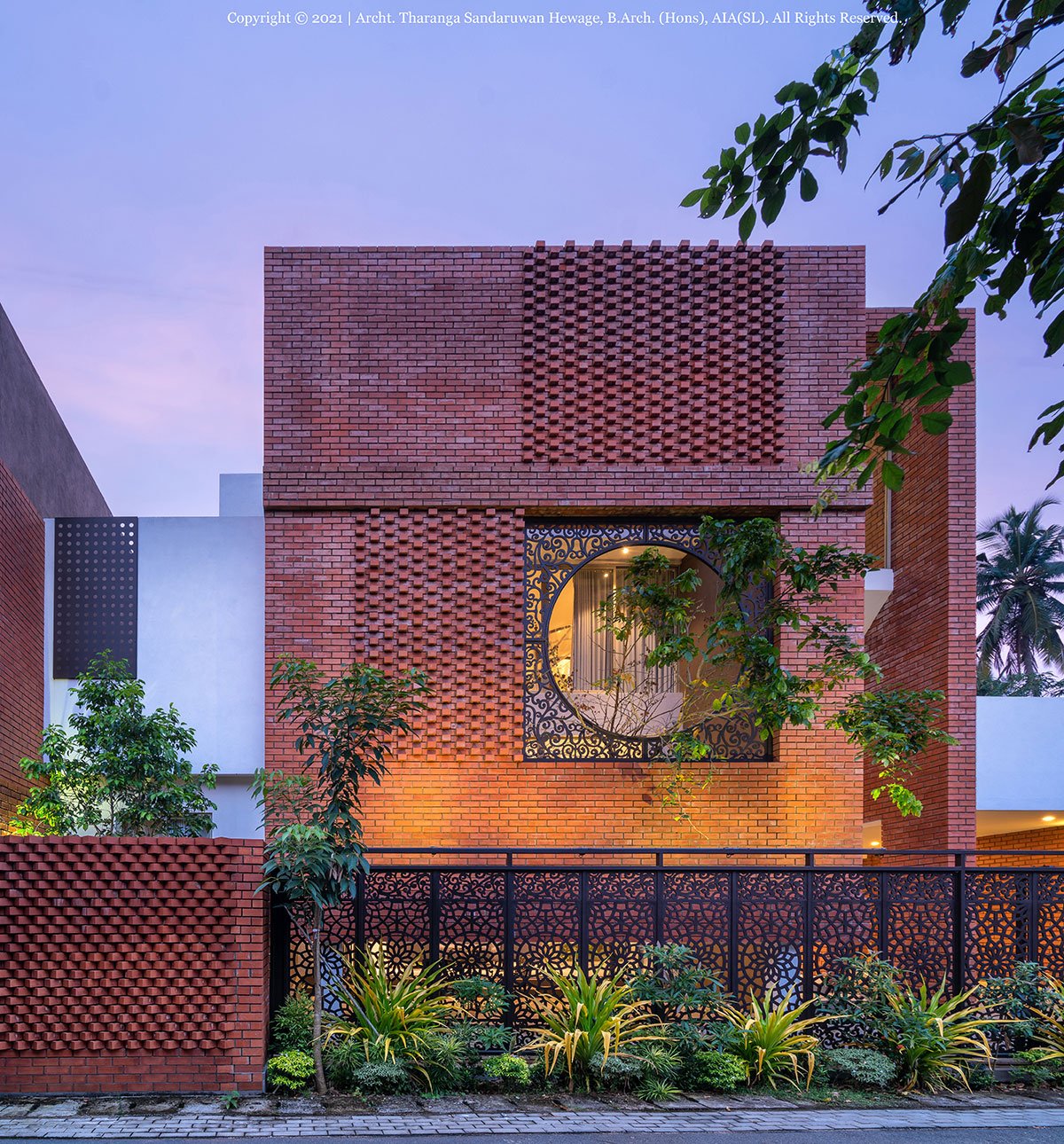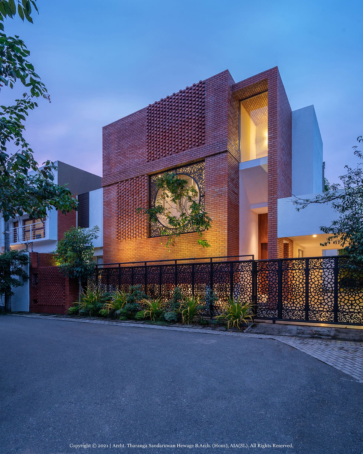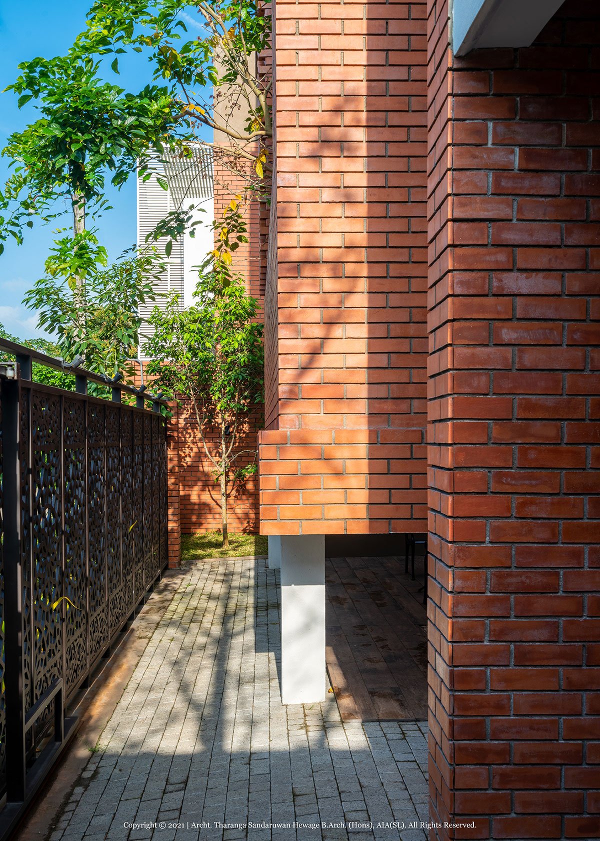 Specially designed double screen (brick façade) ensures the dwelling is shielded from heat by limiting southern exposure and alleviated by disturbing noises from outside. The creation of this high façade wall at the land-front allows more privacy to the owners of the property, accompanied by bringing in fresh, elegant, luxury character to the front outlook. The high façade wall; two story high exposed brick walls; with its rustic disposition, use of brick laying patterns for selected areas, bring aesthetically pleasing ambiance to the residence’s front elevation. Decorative ‘jali’ screen patterns enhance the richness to the front façade by providing a traditional elemental character in perfect harmony with both modern and traditional features.