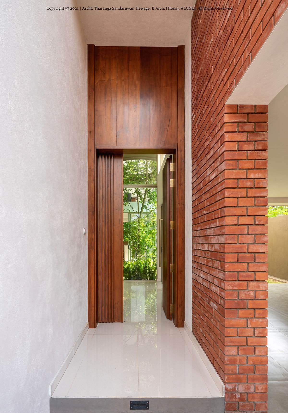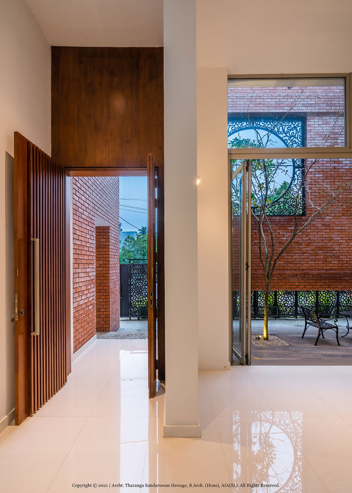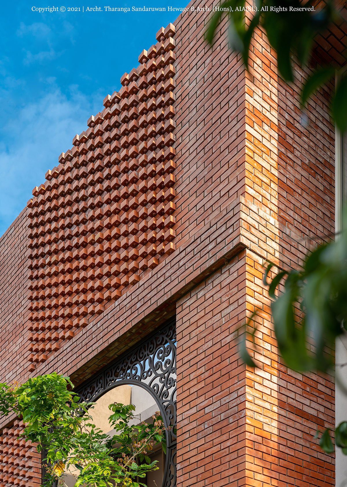 Specially designed double screen (brick façade) ensures the dwelling is shielded from heat by limiting southern exposure and alleviated by disturbing noises from outside. The creation of this high façade wall at the land-front allows more privacy to the owners of the property, accompanied by bringing in fresh, elegant, luxury character to the front outlook. The high façade wall; two story high exposed brick walls; with its rustic disposition, use of brick laying patterns for selected areas, bring aesthetically pleasing ambiance to the residence’s front elevation. Decorative ‘jali’ screen patterns enhance the richness to the front façade by providing a traditional elemental character in perfect harmony with both modern and traditional features.