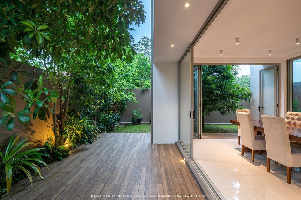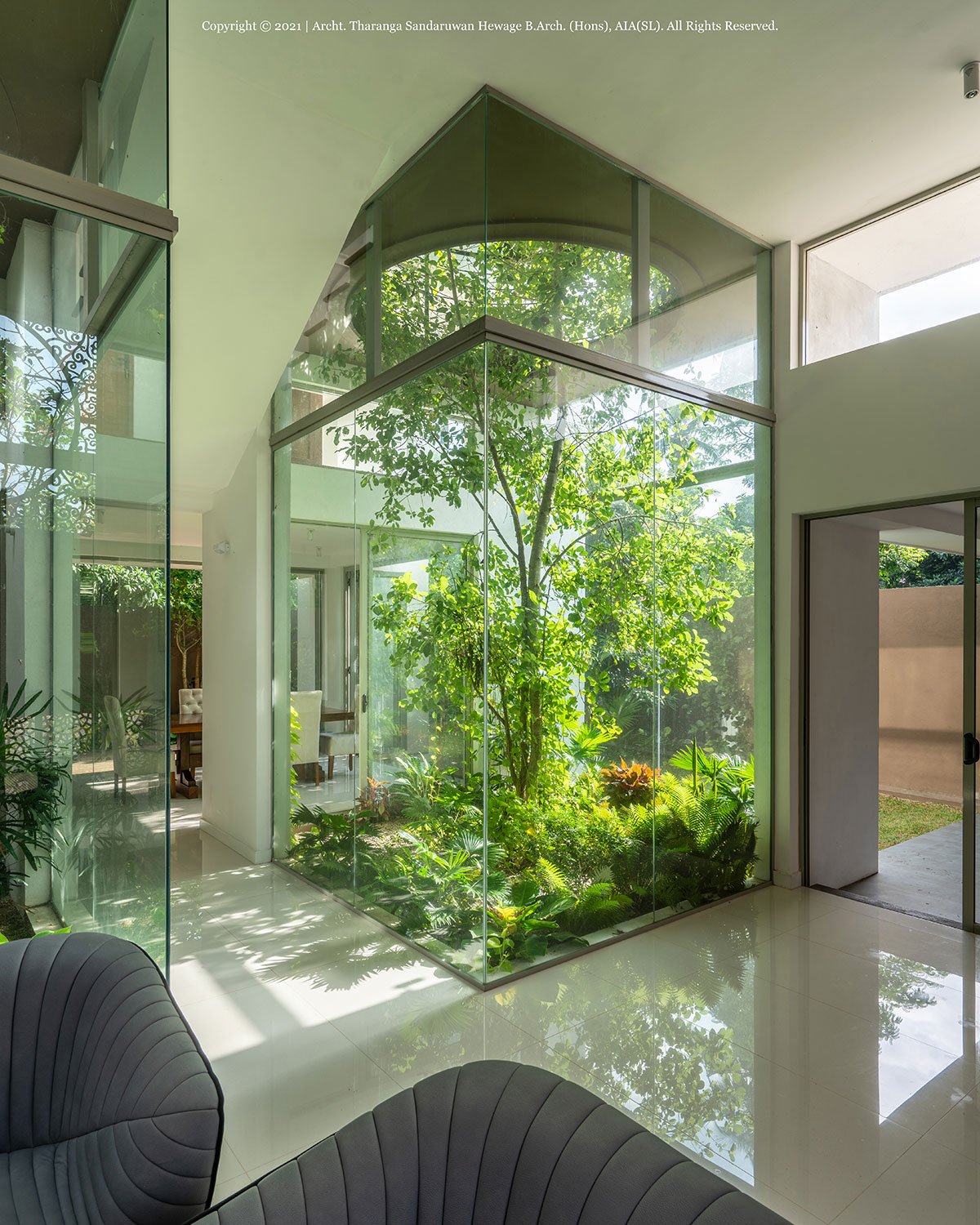 Excerpt: Premier Residence by Tharanga Hewage Chartered Architect features a design that emphasizes spaces in relation to light, vistas, and explores the structuring of spaces, elements, relationships of circulations, as well as proportions and scales. With internal courtyards creating a cooler microclimate, external gardens for natural light, and a range of living and leisure spaces, the house was designed to optimise natural light and biodiversity.