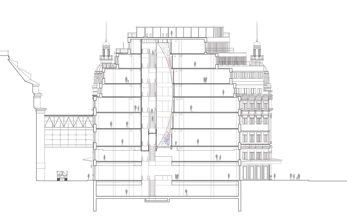 [Text as submitted by architect] Founded in 1865, Printemps has had a long history in revolutionizing the ways of shopping. The original interior had featured an atrium with a massive spiral staircase. Sadly, much this was destroyed from disastrous fires and removed during the modernization of the building. Since then, Printemps has restored the Art Nouveau building façade and the stained glass dome, which are both recognized as historical monuments in the city of Paris. In looking forward, a new project was commenced to re-introduce a new grand atrium to equal its landmark status.