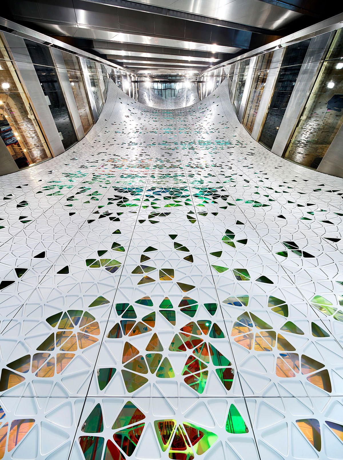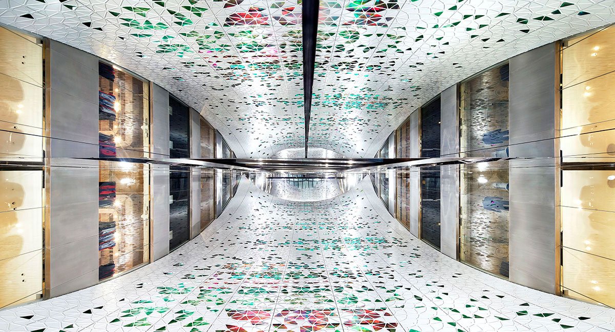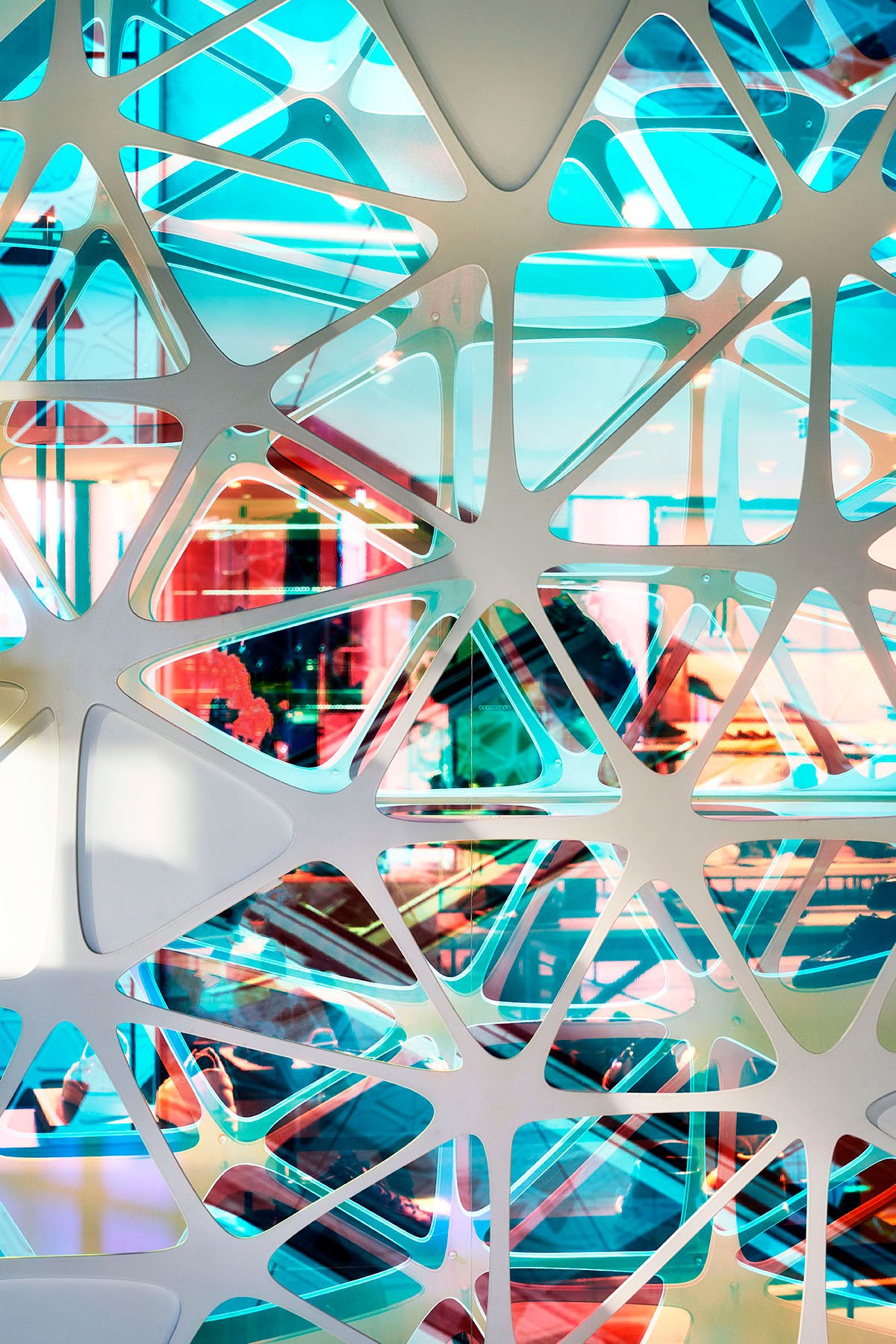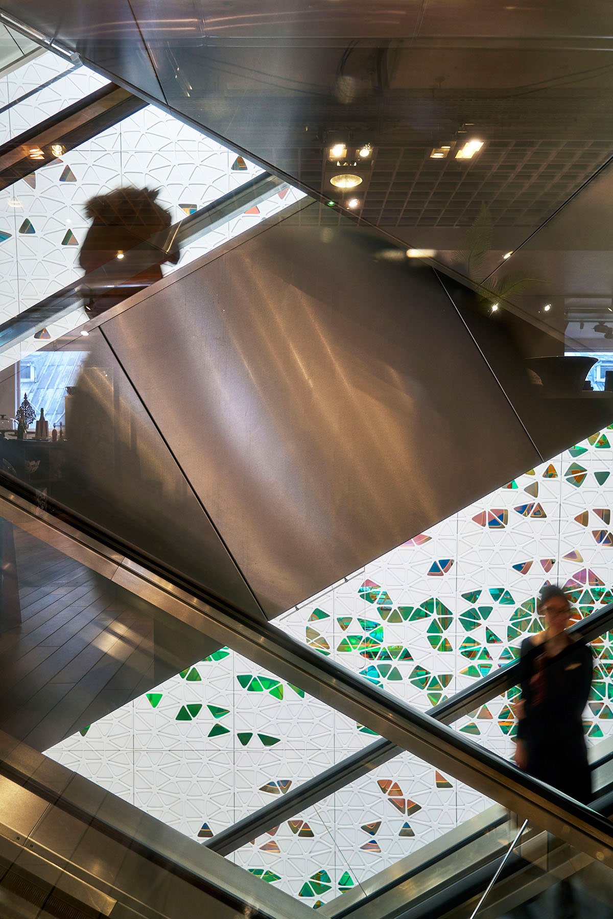 The space features a delicate three-dimensional form based on a concept of a vertical dome, also called a veil. It is reminiscent and an homage to the store’s iconic stained glass domes seen in 1894. It weighs 24 tons but appears to float in front of the vertical circulation with a glass floor and mirror ceiling. It is 25.5 meters high and 12.5 meters wide, consisting of white-painted aluminum sheets laminated to create a floral relief. The pattern is an interpretation of images found in the original stained-glass transposed into a repetitive pattern. It respects the tradition of Art Nouveau motif found in nature. It is then randomized to form approximately 17200 petal-shaped opening. This revealing a transformative array of colors through the effect of dichroic glass. As a contemporary interpretation of stain glass, it has the similar iridescent quality to the surface and appears like a burst of fireworks or falling blossoms.