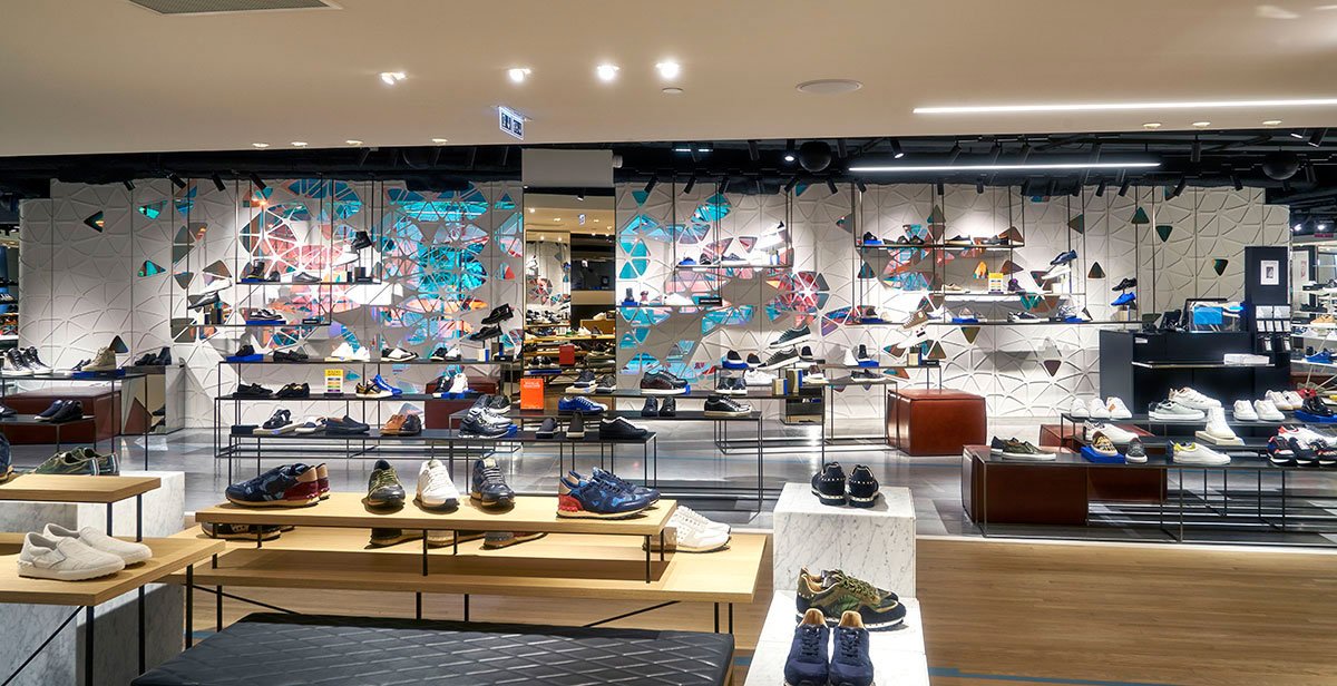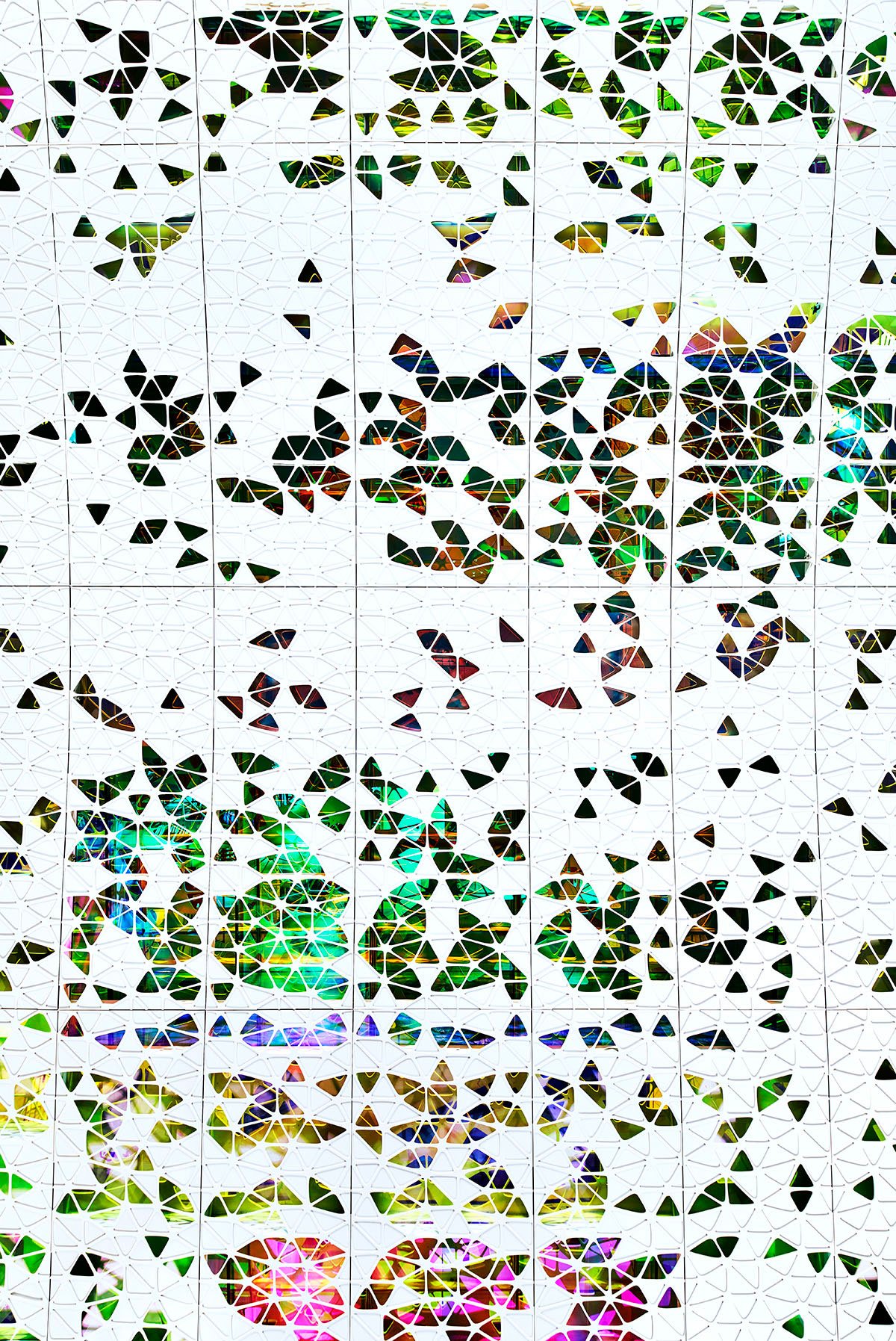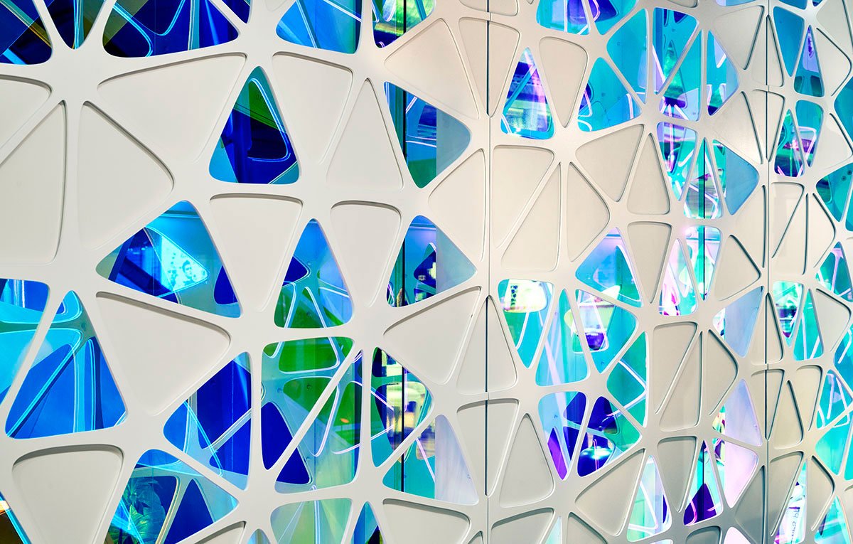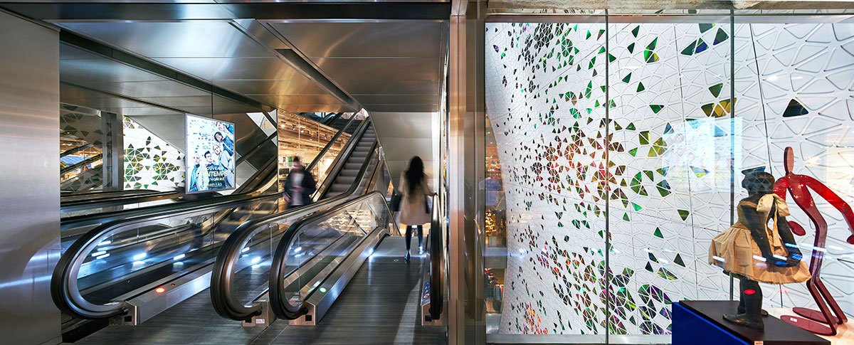 The space features a delicate three-dimensional form based on a concept of a vertical dome, also called a veil. It is reminiscent and an homage to the store’s iconic stained glass domes seen in 1894. It weighs 24 tons but appears to float in front of the vertical circulation with a glass floor and mirror ceiling. It is 25.5 meters high and 12.5 meters wide, consisting of white-painted aluminum sheets laminated to create a floral relief. The pattern is an interpretation of images found in the original stained-glass transposed into a repetitive pattern. It respects the tradition of Art Nouveau motif found in nature. It is then randomized to form approximately 17200 petal-shaped opening. This revealing a transformative array of colors through the effect of dichroic glass. As a contemporary interpretation of stain glass, it has the similar iridescent quality to the surface and appears like a burst of fireworks or falling blossoms.