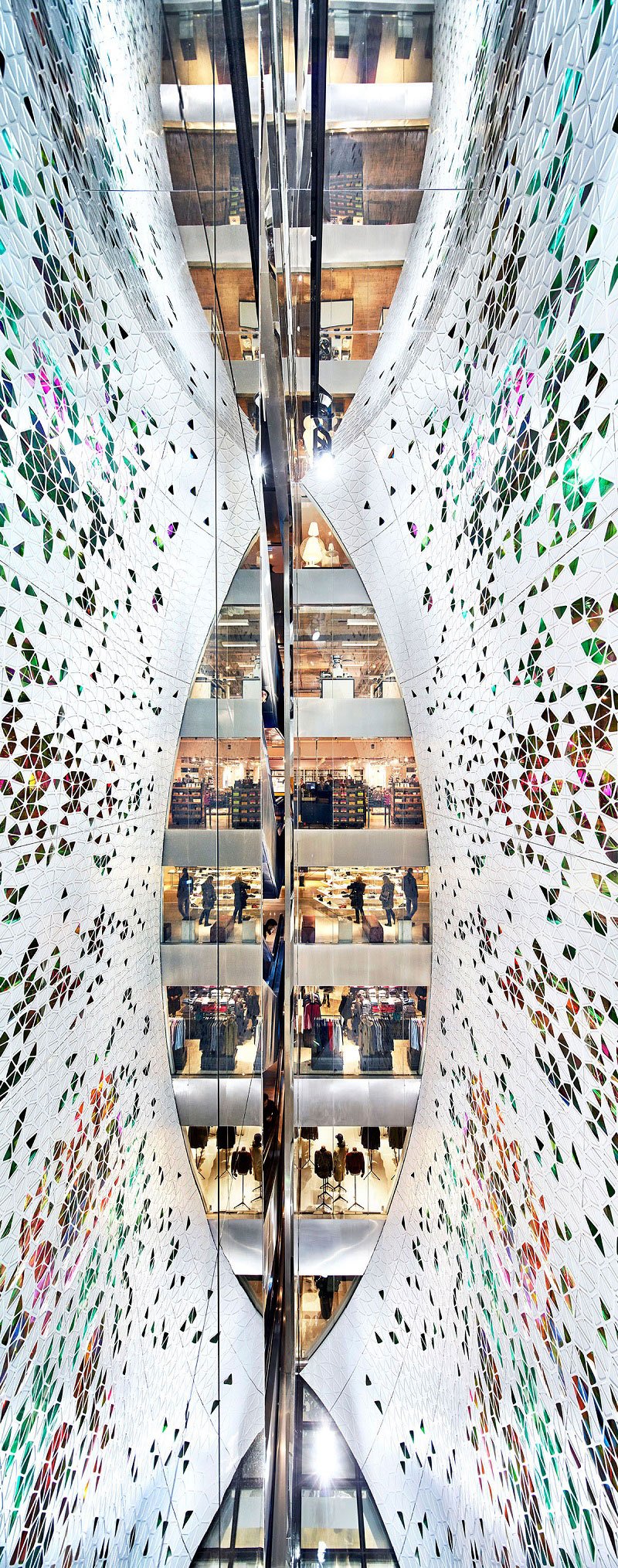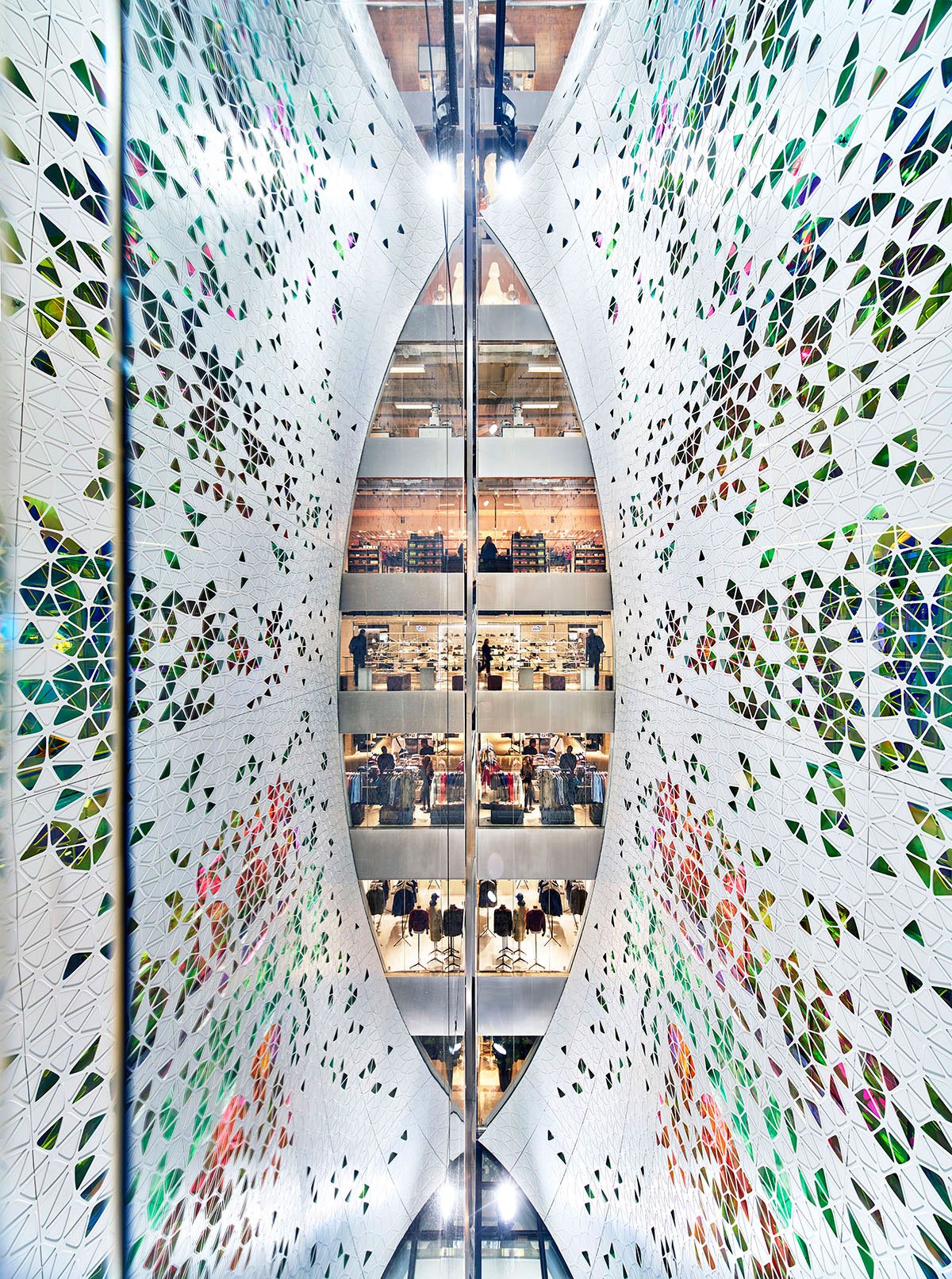 The geometry of the veil conceived by connecting the four corners of the void with pure curves in plan and elevation. The combination of two-dimensional curved panels gives the overall three-dimensional shape. The one-way mirror, when viewed from the void creates a moment of fascination. The veil is mirrored to create the image of a bi-convex geometric space, a completed symmetry that can be seen from the side, top and below. On the retail interior, the veil is perforated to allow interior lighting to transfer. The transparent dichroic glass fills each opening and creates a surface with infinite gradation. The effect is sensitive and scenographical, and its energy is translated into the retail concepts on each floor.