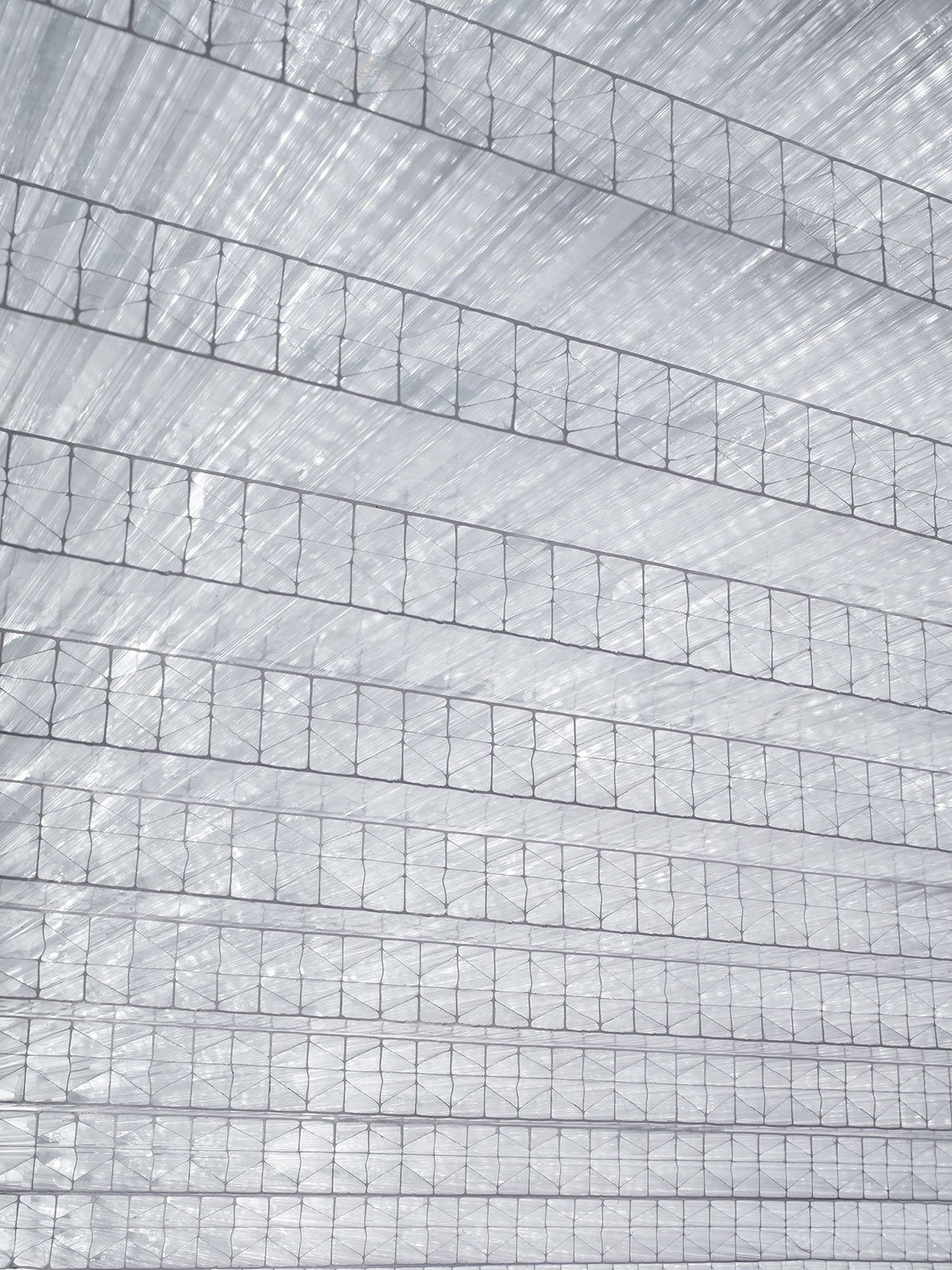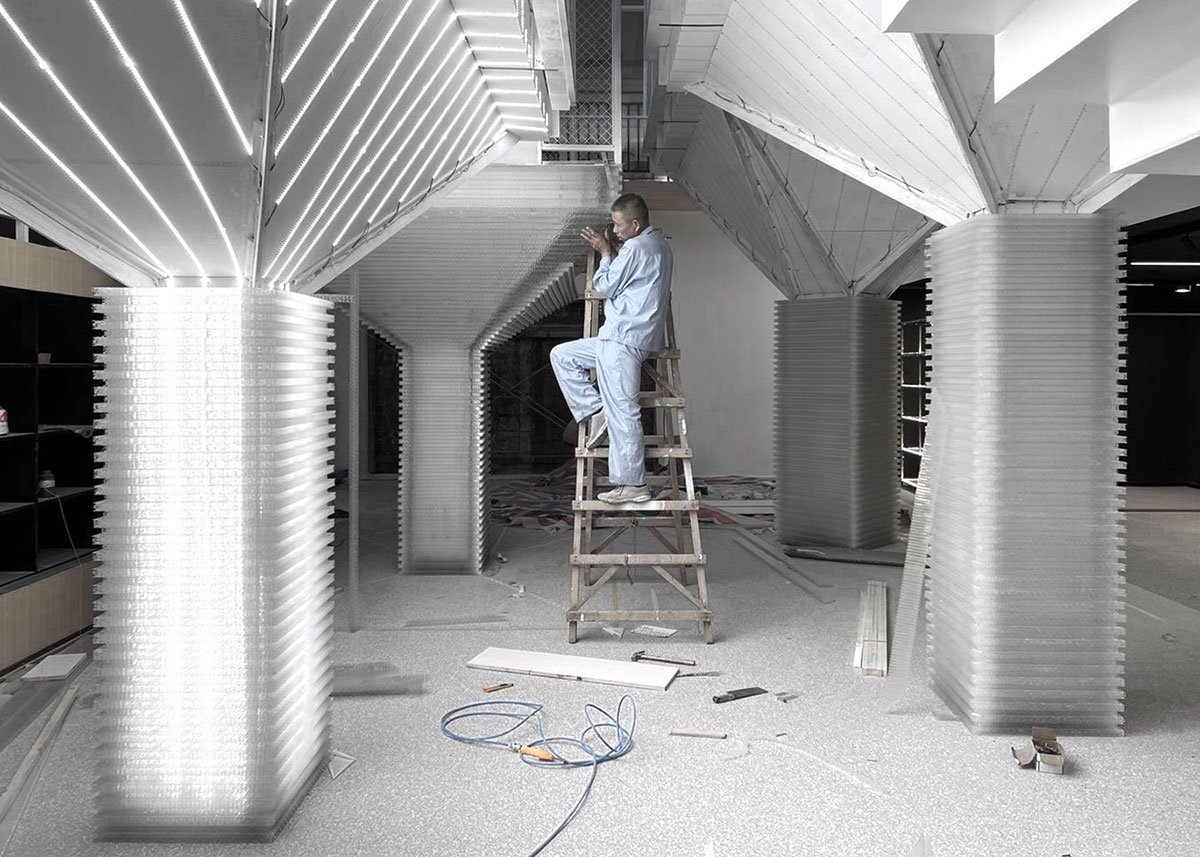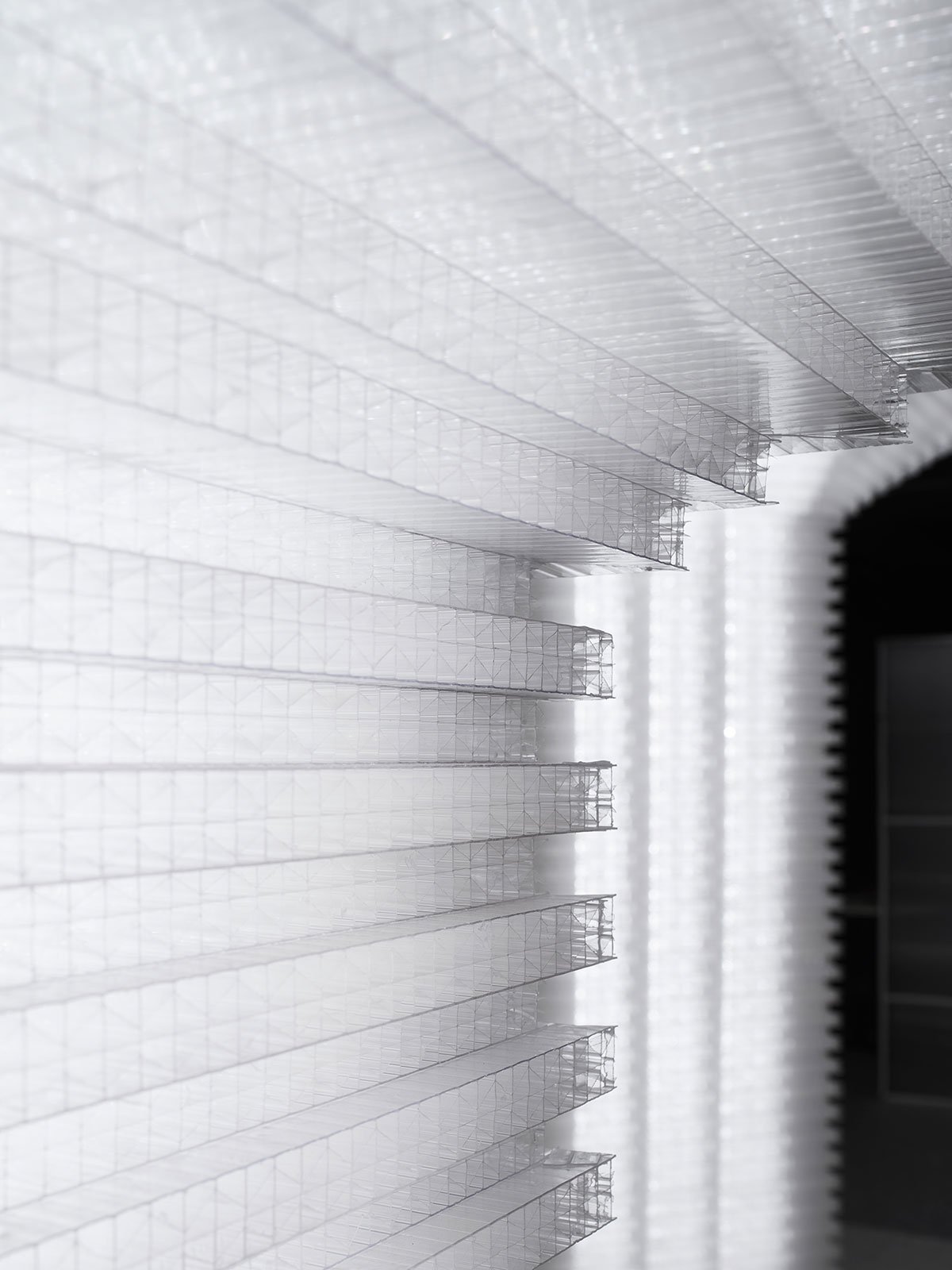Polycarbonate panels are stacked horizontally with edges exposed. The panels are offset on their edge one to another, which helps to avoid aligning material while generating a visual effect recalling masonry. The plastic masonry is lit from within, amplifying its shiny and floating materiality and futuristic atmosphere.