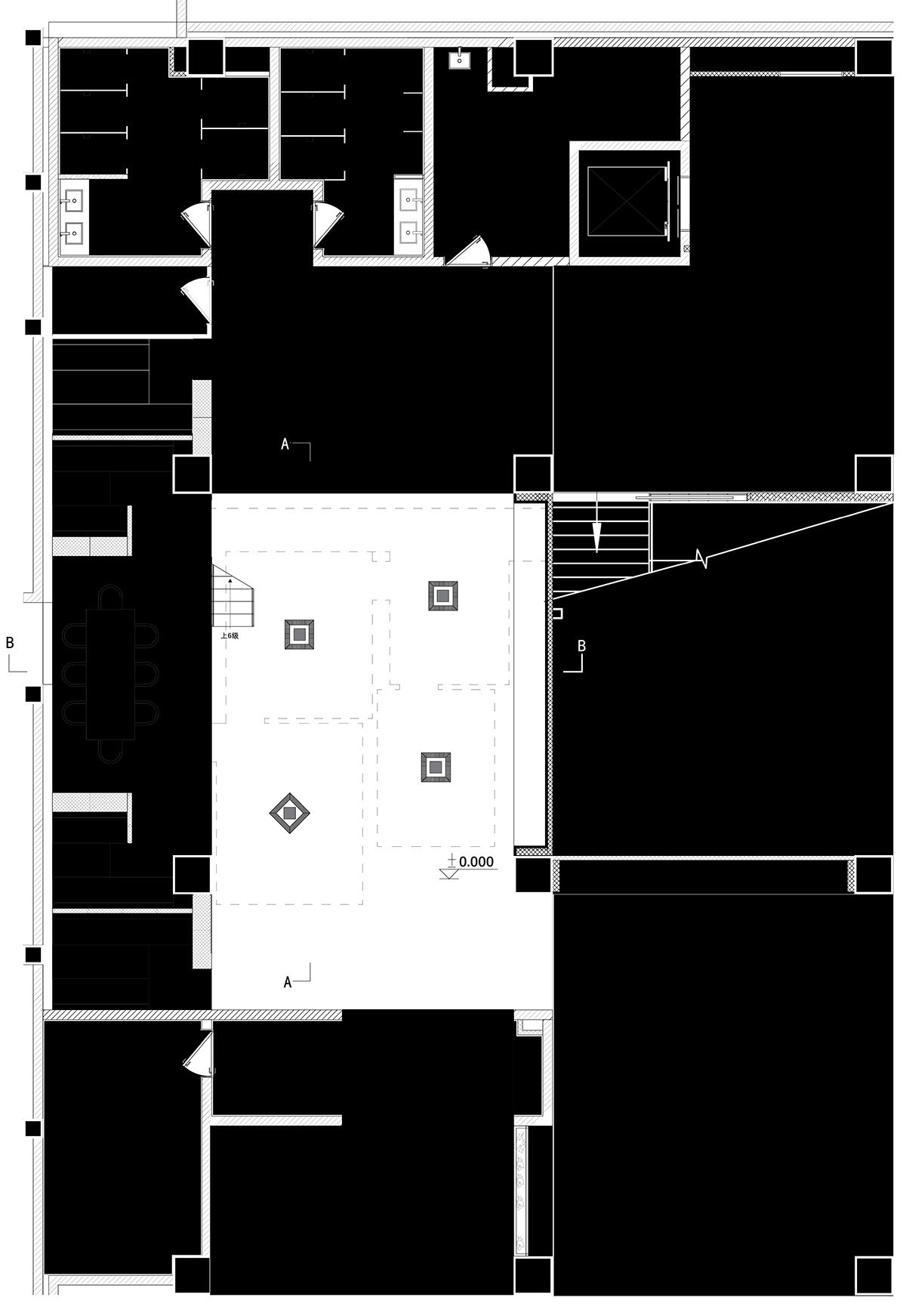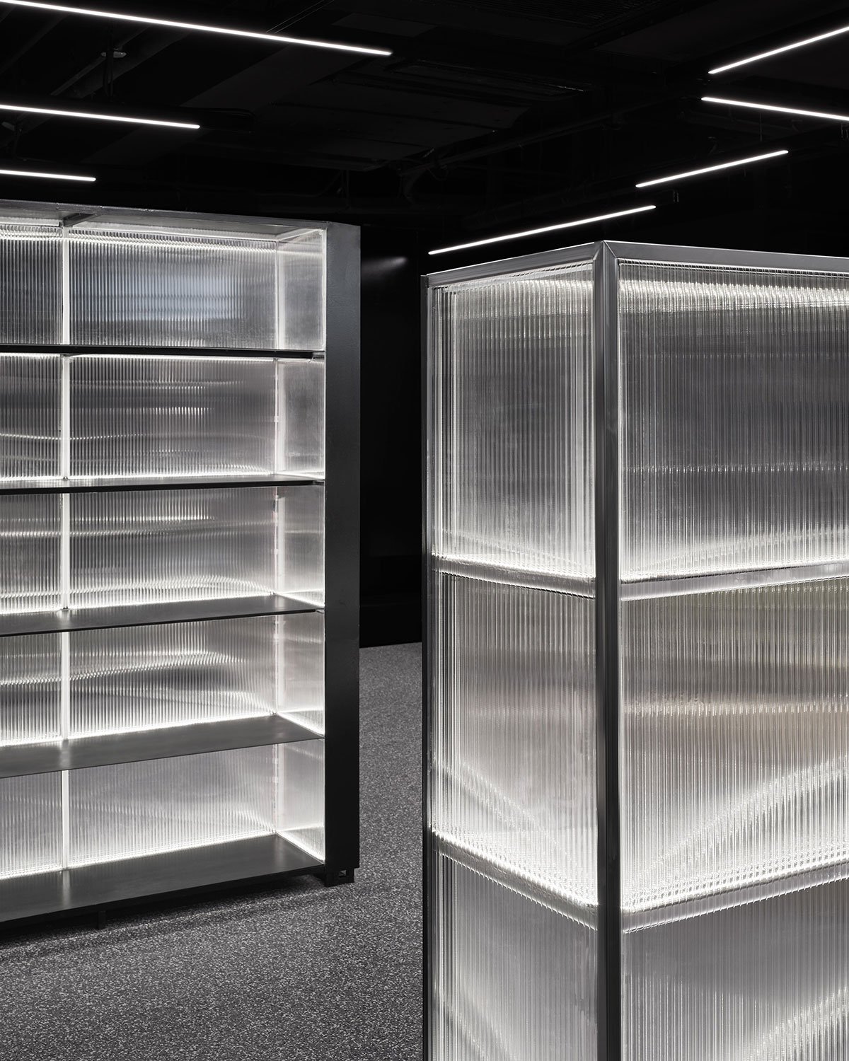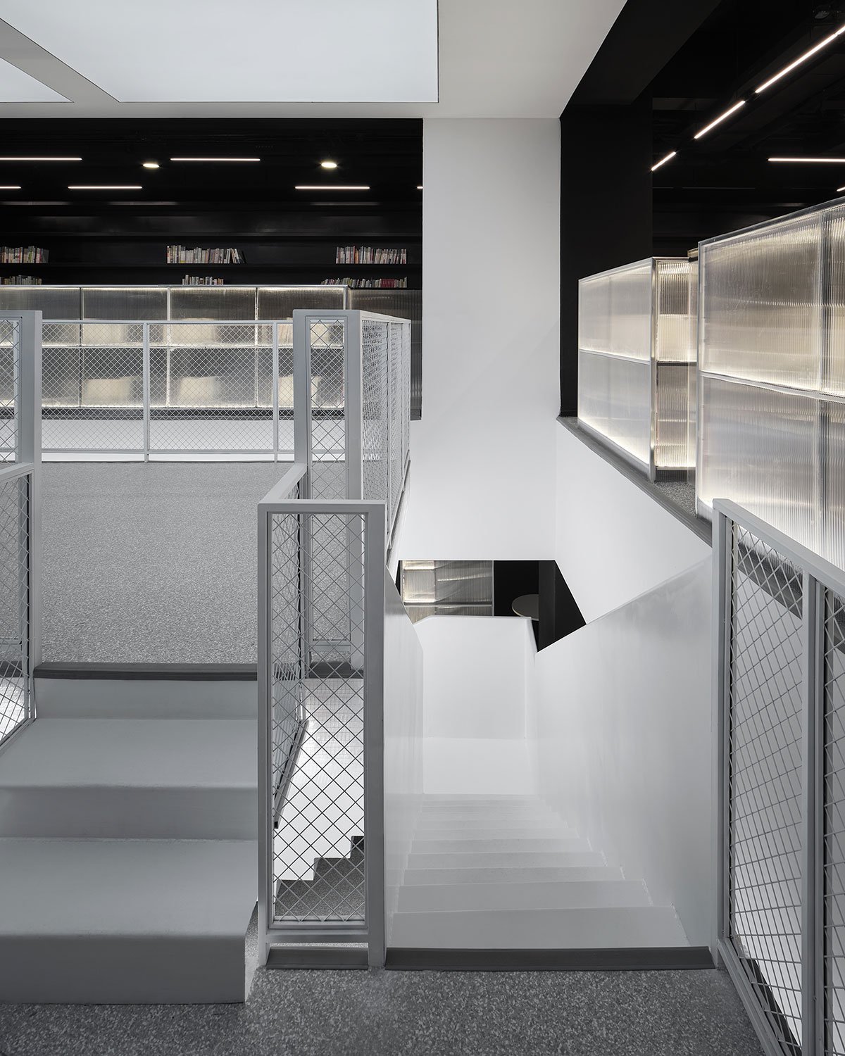 The light panels over the atrium evenly illuminate the prisms like an installation, contrasting the black surrounding space. Polycarbonate bookshelves are scattered in  black peripheral area, defining the space with self-illumination. This is not a typical cozy reading space. It reflects the curiosity and exploring spirit of a pioneering enterprise.