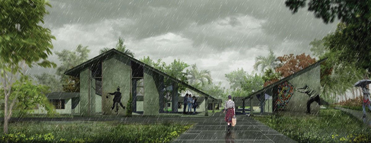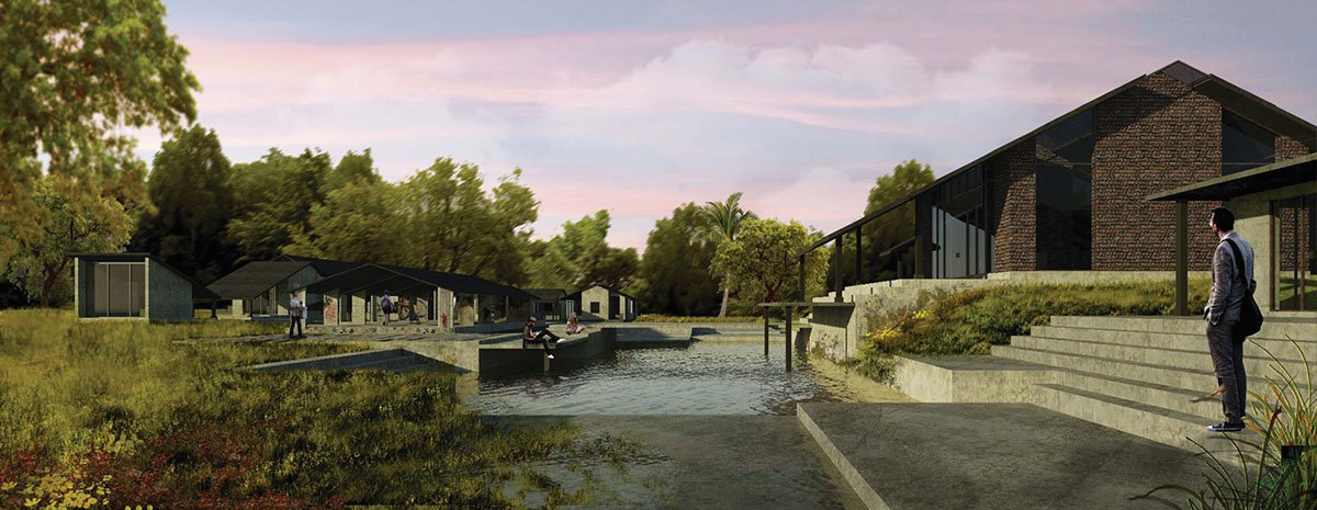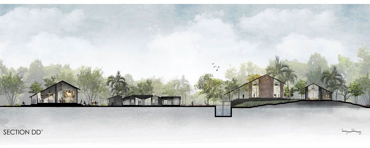 As seasons take turn, the site moulds itself to accommodate for the natural flow of water, harvesting it and thereby, making for a cooler microclimate. The bridge, symbolic of one’s journey, becomes the physical connect between the two sides – with unbuilt extensions in the form of decks, project themselves towards the water. These decks instigate the instinctive human tendency to move closer to nature. The Village of and for artists, is a community bringing creative heads together to explore, experiment, and find their purpose in the field of art.