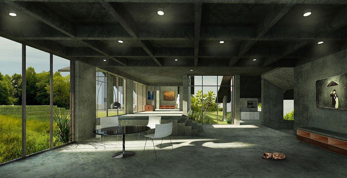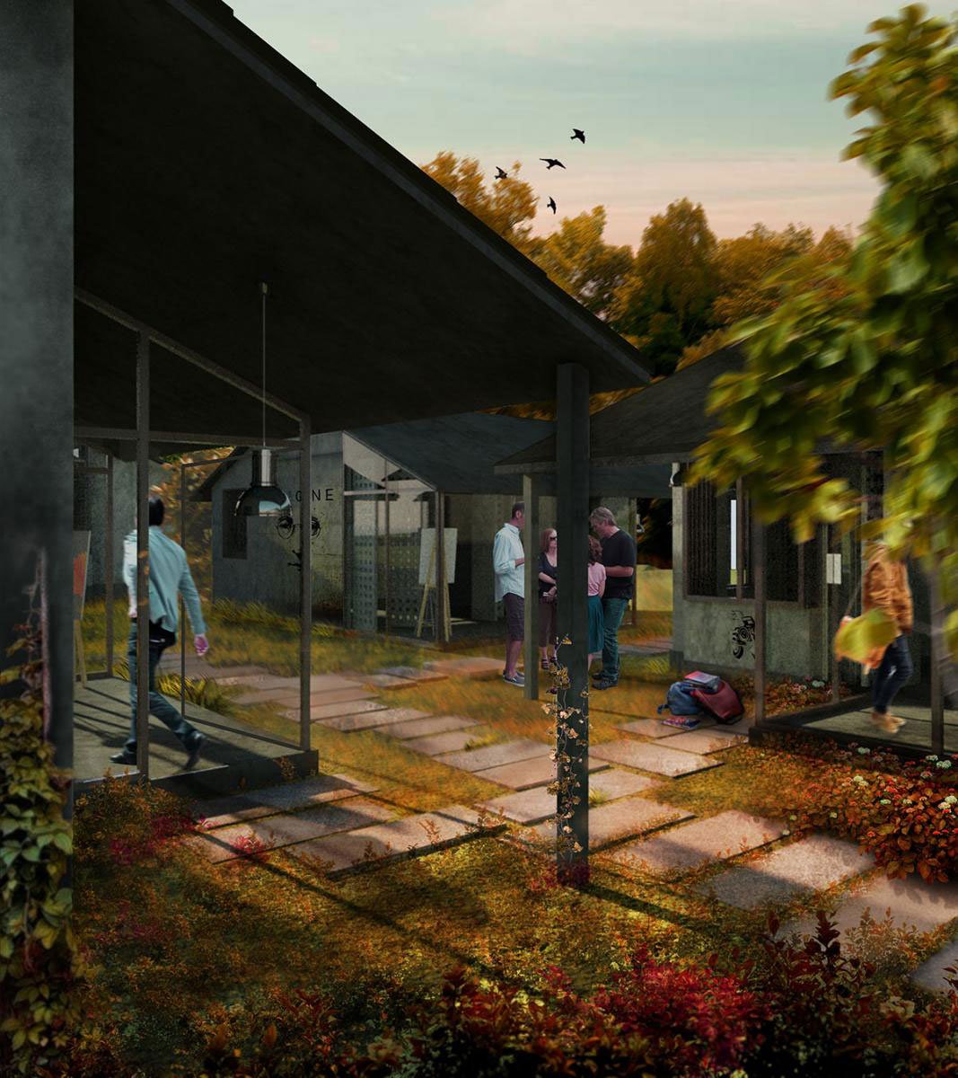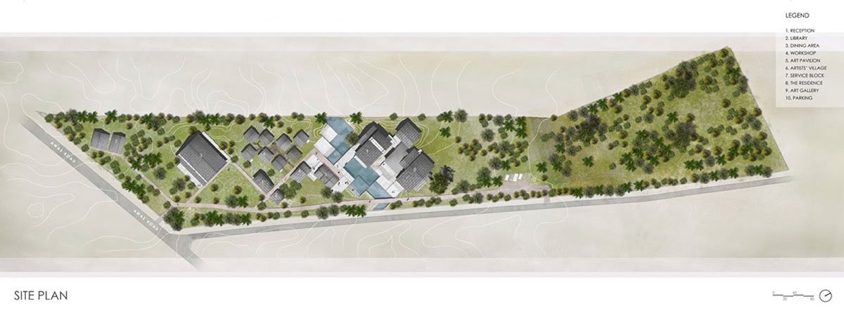 The scattered individual shelters designed with workspaces marking their entrance, encourage communication, motivate their art to initiate conversations and form new relationships. The home, a residence for one, is a dream for many. The subtle grandeur of its artistic nature and the comfort blend in while intertwining with the green. The highest point of it all, the Art Gallery, is an independent structure sitting on a pedestal of land that rose with it, and yet, it kneels before the water. The final destination for aspiring artists, it holds their art, mounted and proud, as an exhibition for the world to see.