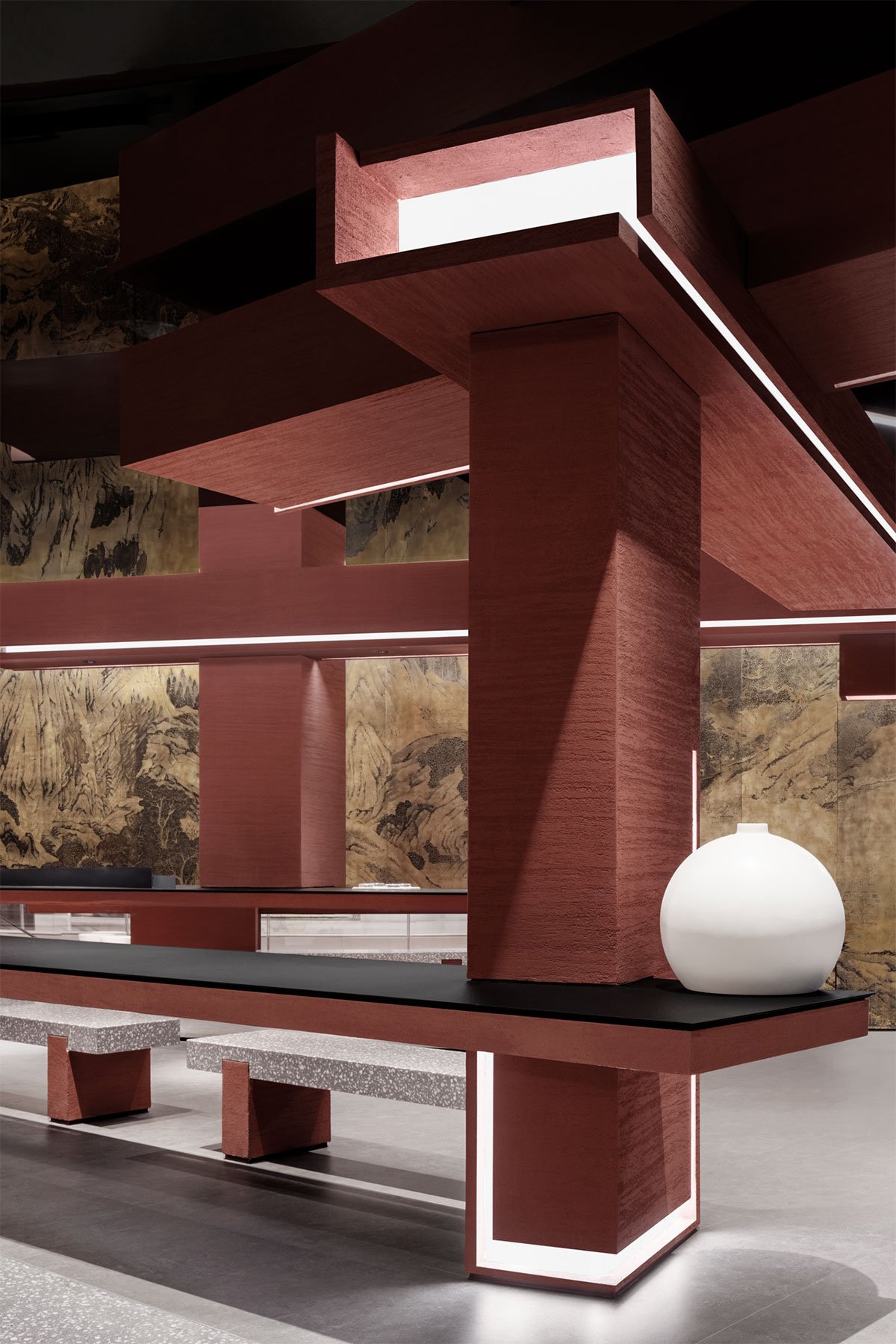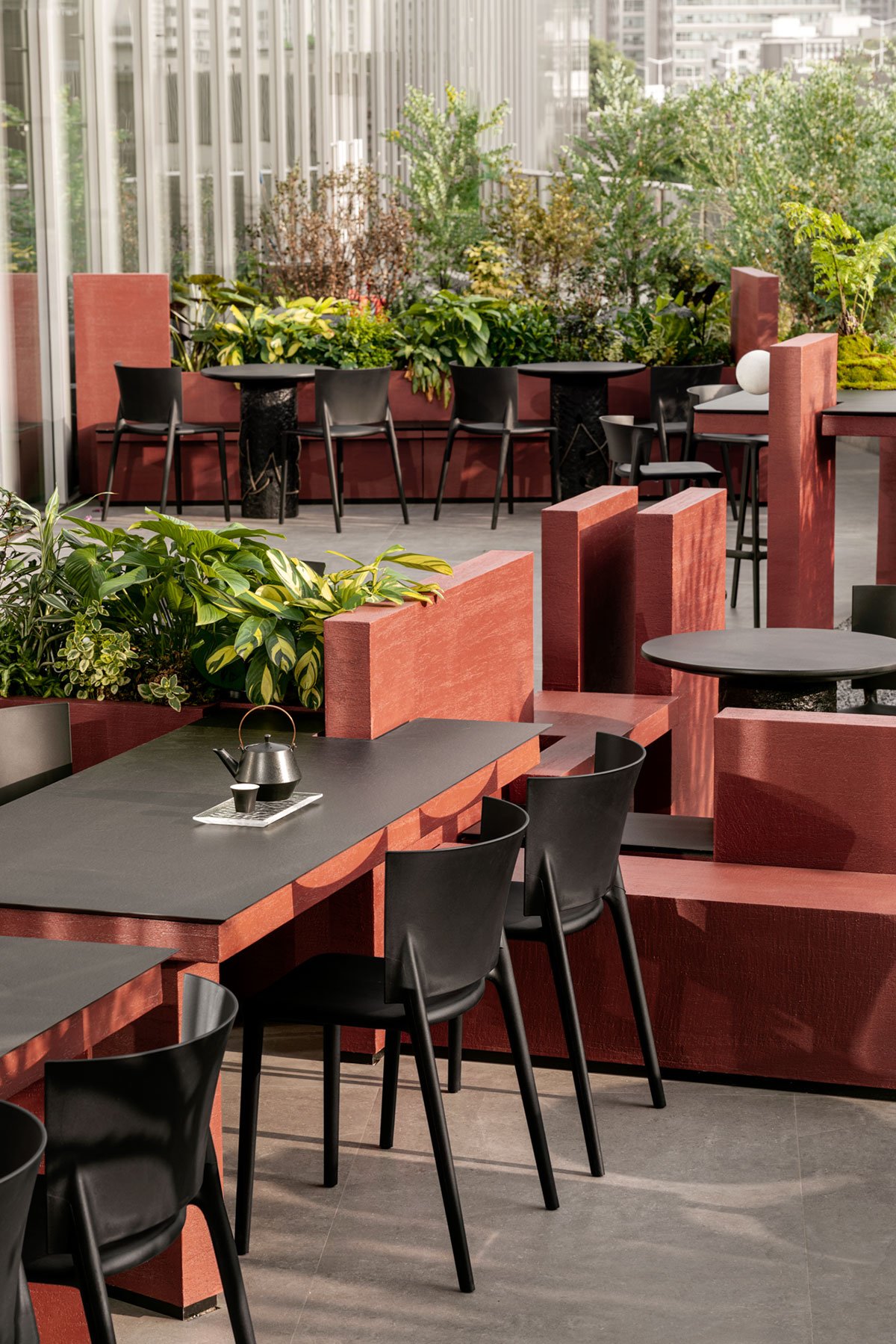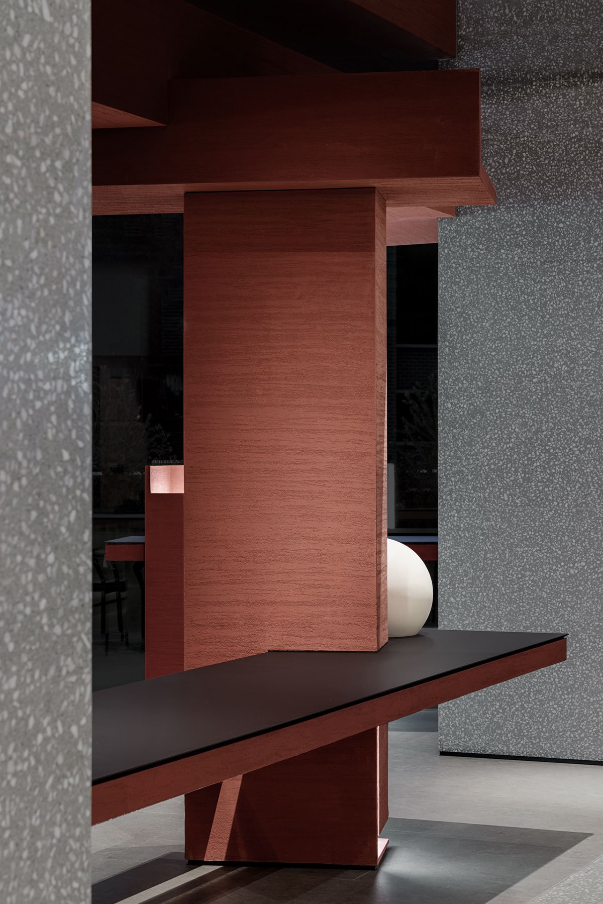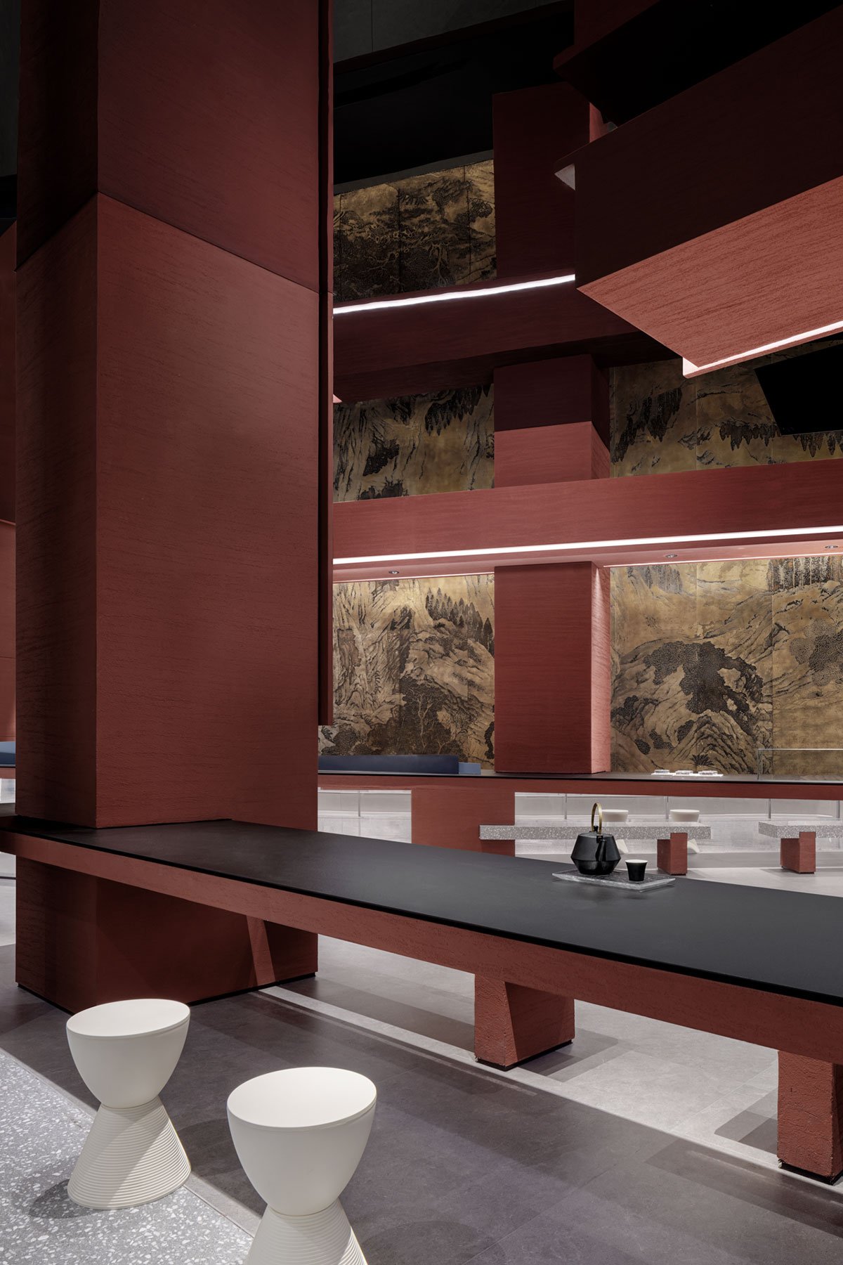 Weathered red soil has a mottled texture that gives off an ancient vibe. The red finishes replicate the weathered fracture surface of the soil visually and tactilely. The black volcanic stone slabs create an interesting contrast with the “red soil”, depicting the ancient natural evolution process.