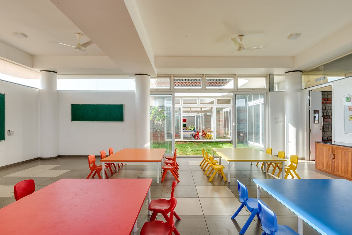Located in the tropical belt of interior Tamil Nadu, the intent was to have the space ventilated naturally with sufficient lighting. All walls are stopped at lintel height and have openable windows above, to allow hot air to dissipate and increase cross ventilation. Terracotta jalli has been used as secondary shading devices. Major openings along the predominant SE & NW wind direction and minor wind tunnels in east-west direction between classrooms are created to have a comfortable micro-climate.