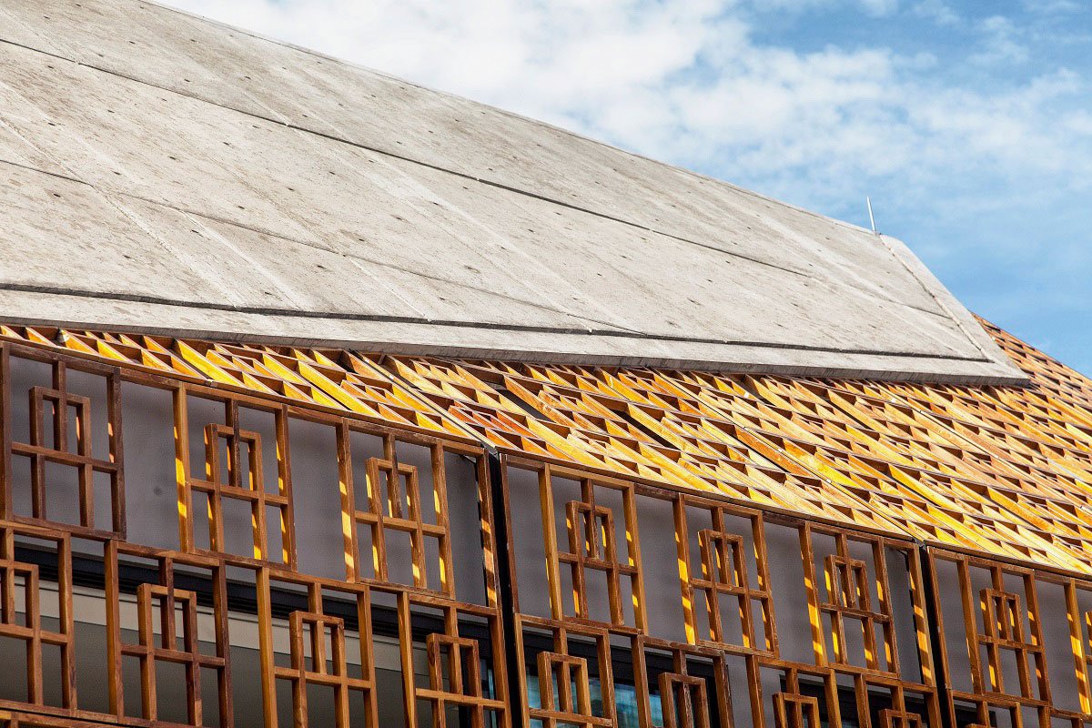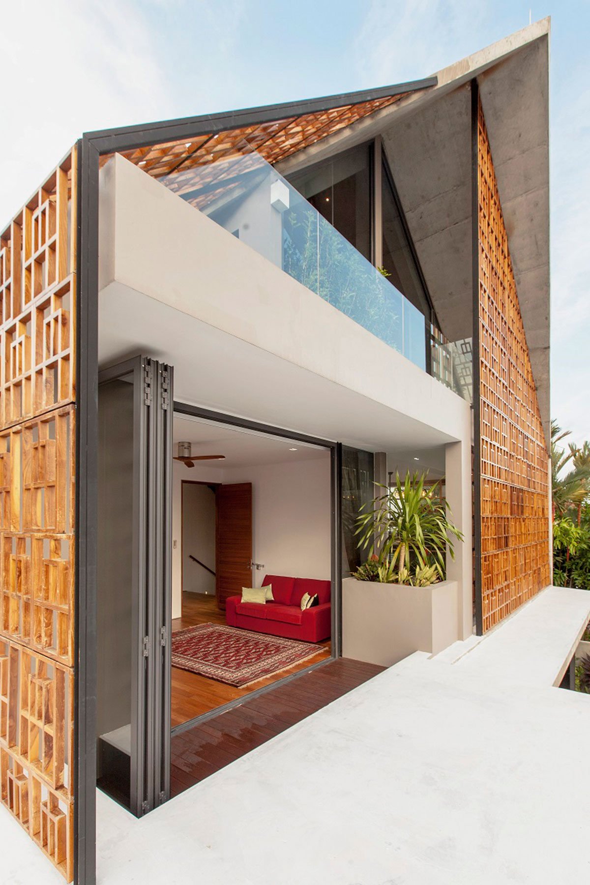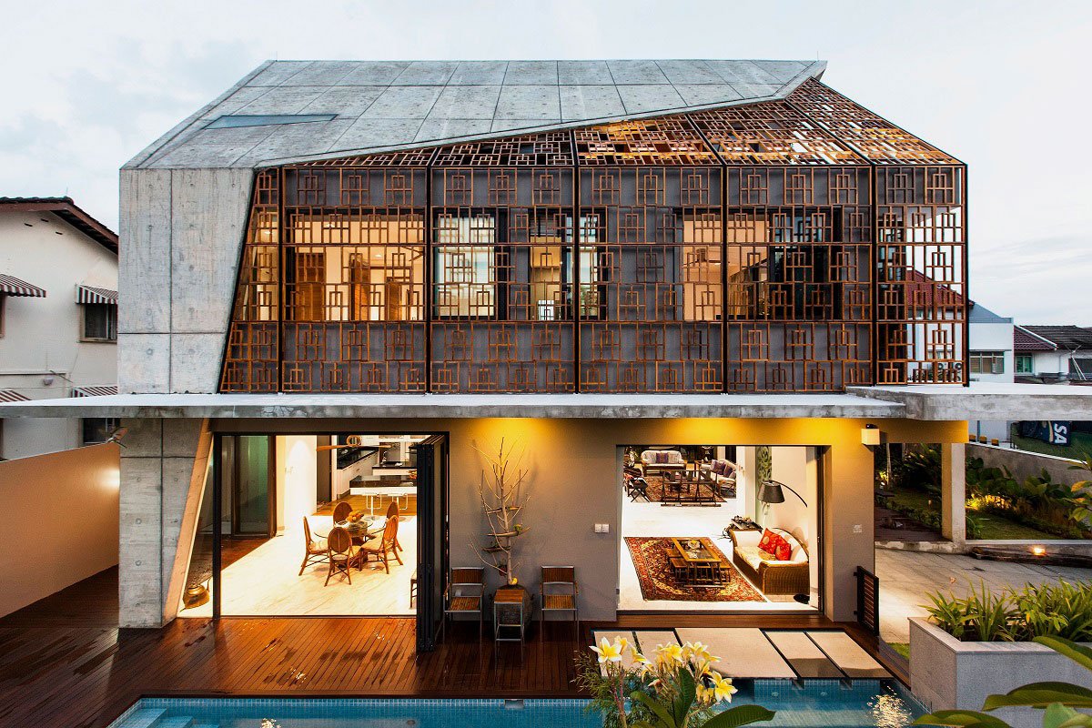 The unique combination of raw off-form concrete and finely crafted solid teak screens from Bali veils and protects the house from its harsh urban environment without compromising on views, natural light and ventilation.