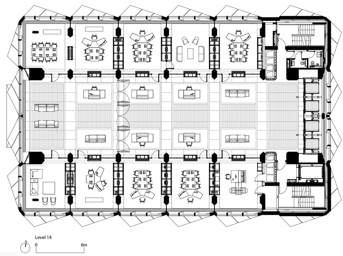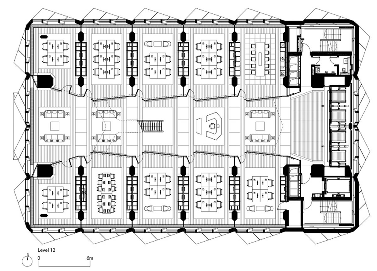 The starting point for the office floors was to reinvent the headquarters as a ‘house for staff’ – instead of the conventional large, communal workspaces, the rooms are of a more intimate, domestic scale. The practice’s workplace consultancy group analysed the client’s operations and helped to devise the innovative modular system for these rooms. This was then developed with the in-house engineering teams to enable rapid construction and ensure ideal levels of natural daylight for concentrated work. Each two-storey module comprises a pair of offices, stacked one on top of the other – this is expressed externally through the double-storey cladding module. The modules are arranged in rows on either side of a central hallway, which functions as a breakout space, with lounge seating and views of the city through the glazed lift shaft. At level fifteen, the space is top-lit (through the glass lanterns) to create a flexible space for company-wide gatherings and events.