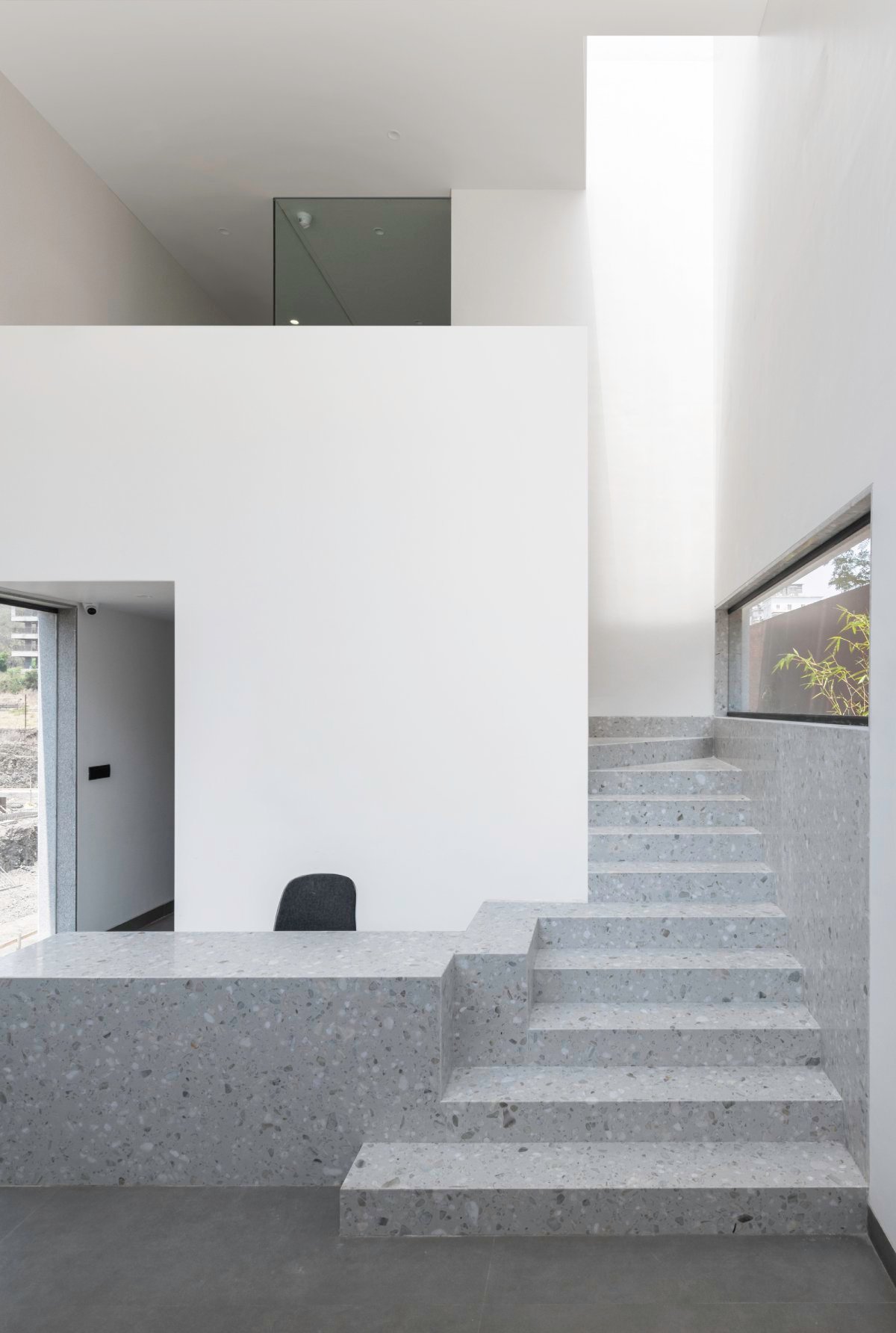 Considering the requirements, we decided to make the buildings in 2 levels spatially connected by an exciting terrazzo cladding staircase in the lobby area. A skylight beautifully lights the double-height lobby area over the stairs and huge front-facing windows.